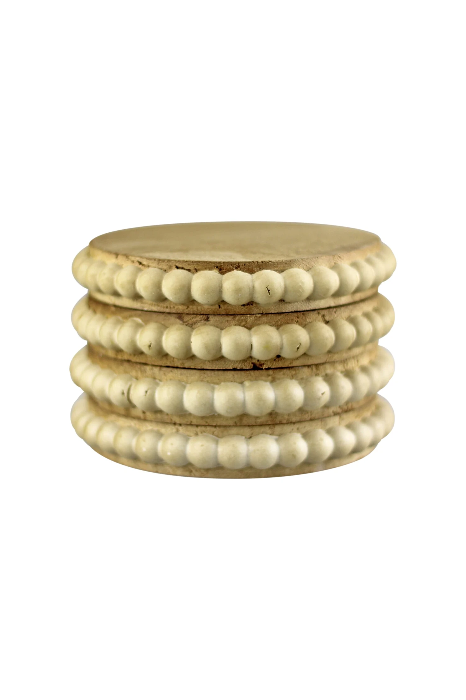 Our wooden coasters are made from paulownia wood, sold as a 4 pc set finished in a natural wooden tone with shabby chic beading detail.