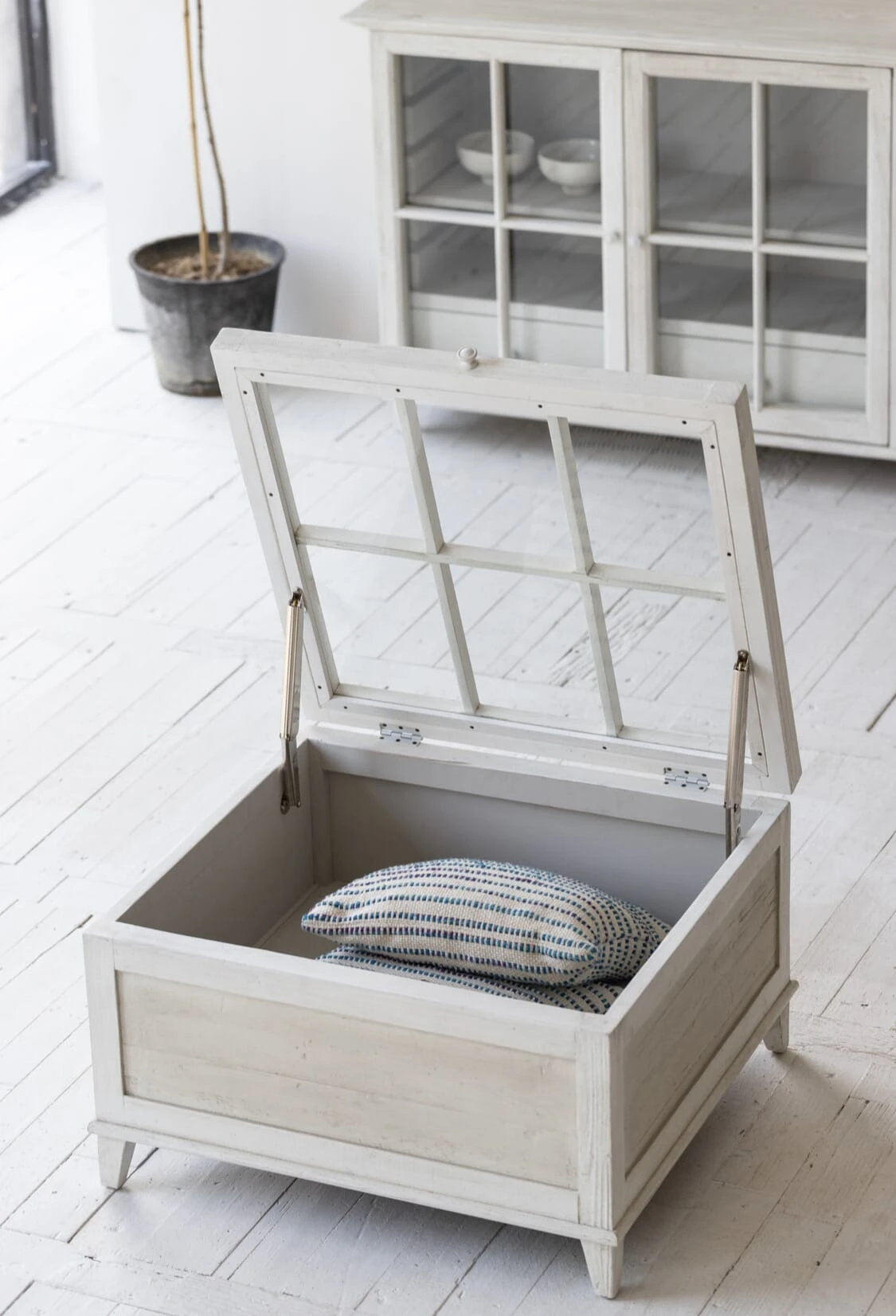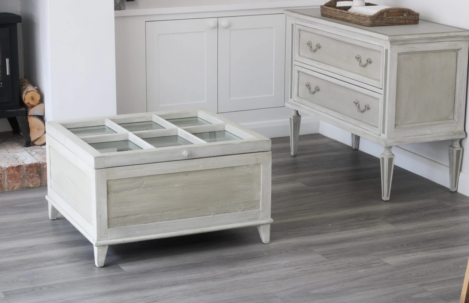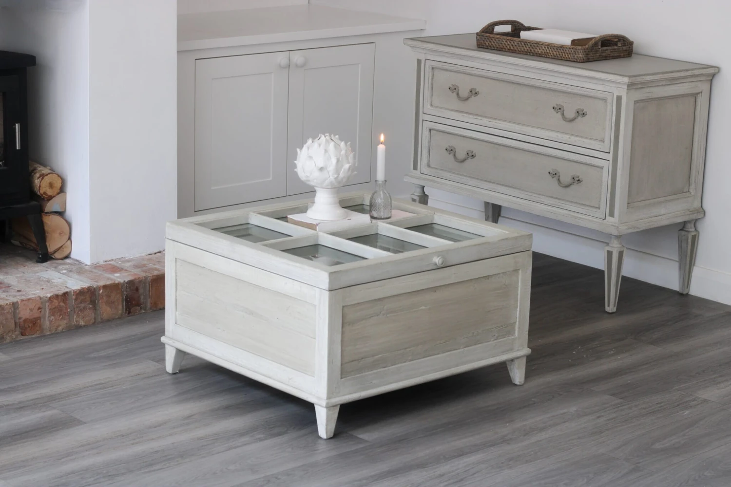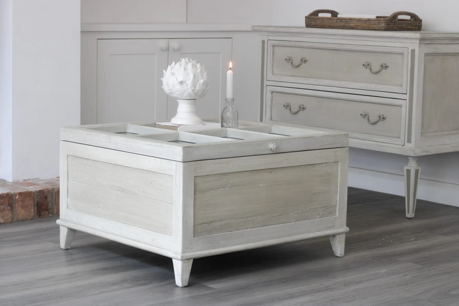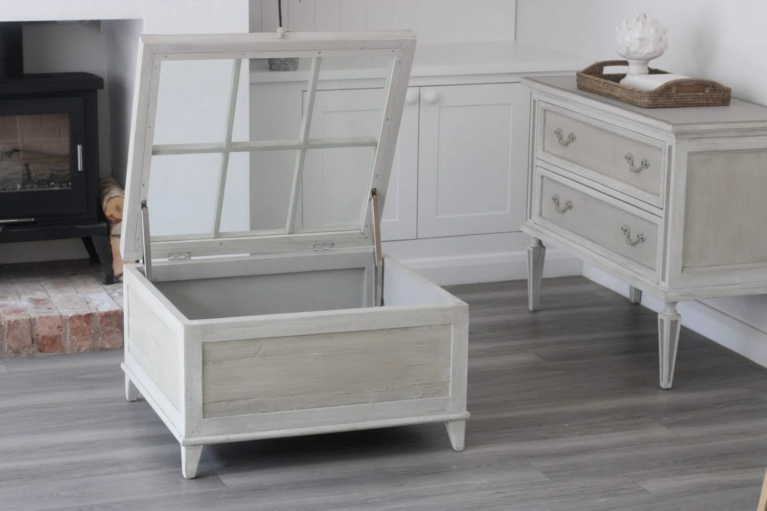Introducing our timeless, classic Antique White Coffee table. This square table is the perfect centre point for any living room. With its beautiful antique finish and creating the ideal storage solution. The glass top lifts up on a soft close hinge, for storing your blankets, books or anything else that needs a home in your living room.
