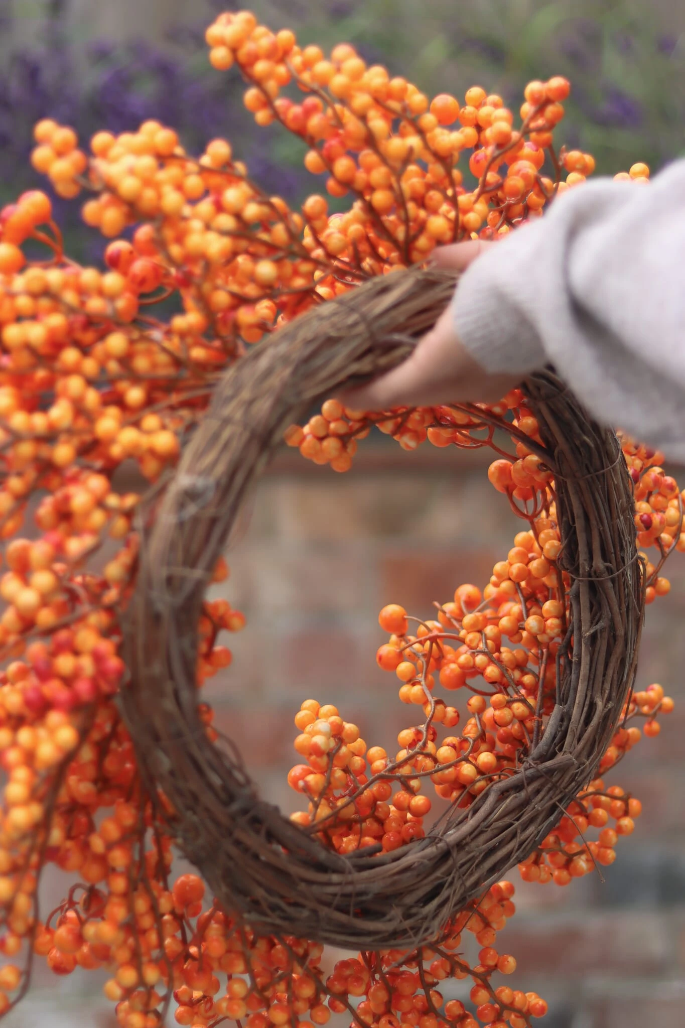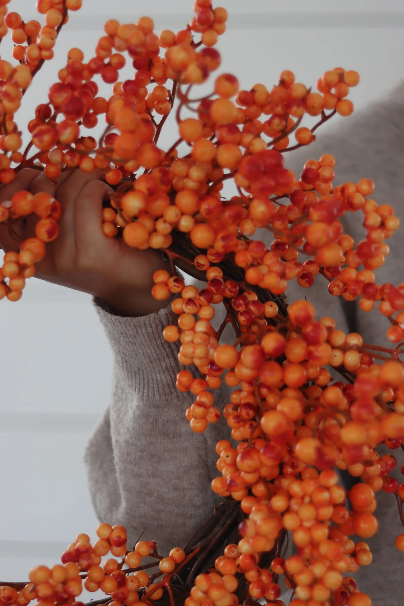 Enhance your autumn decor with the stunning artificial wreath finished in orange berries. This autumn wreath features a delightful arrangement of orange berries, capturing the essence of the season. The varying tones of the berries add depth and dimension to the wreath, capturing the season of autumn.