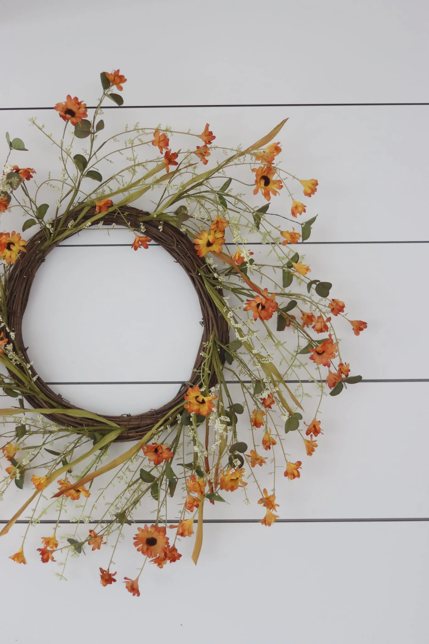 Bring the beauty of blooming autumn flowers into your home with this autumn wreath resembling autumnal Wildflowers. Featuring vibrant orange tones, this high-quality wreath adds a burst of colour and life to your space. Hang it on your wall or use it as a centre piece to create a captivating autumn focal point in your home or accompany it with other autumn table decorations to create a seasonal setting throughout the home.