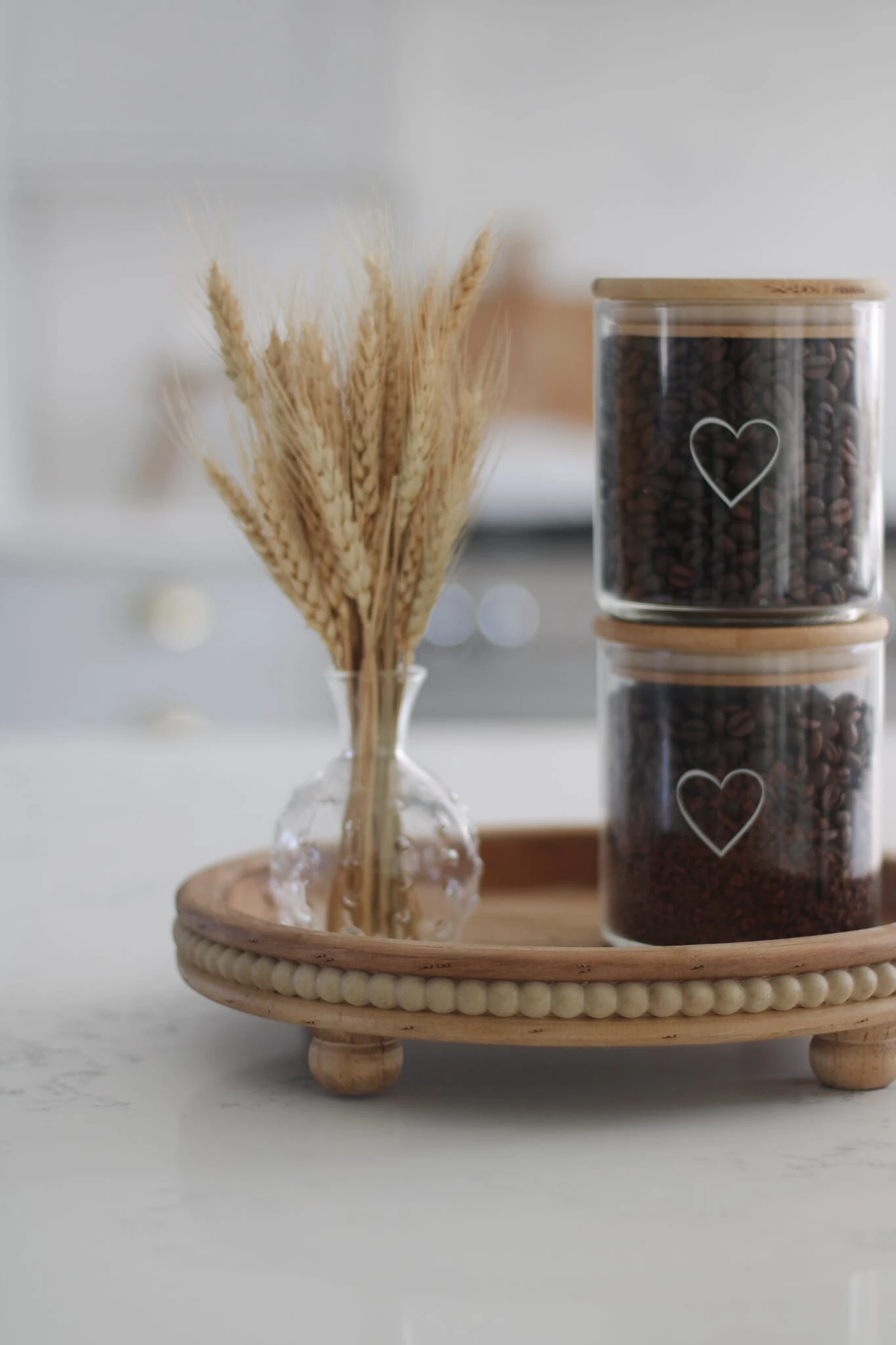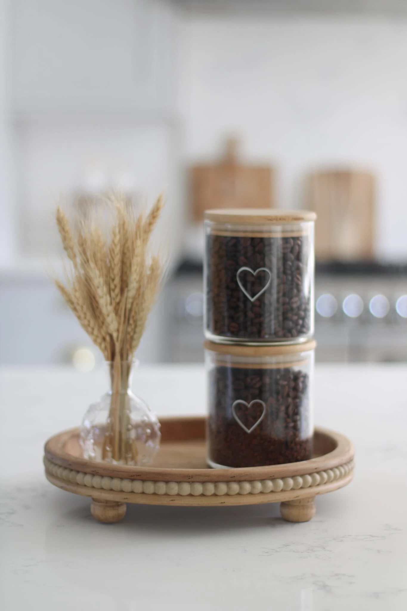 Small round feet to raise these trays from your work top surfaces make these the perfect styling accessory. Whether it’s a base for your favourite ceramic vase and faux flower display , a set of glass candle holders or some tea coffee sugar canisters these round trays perfect.