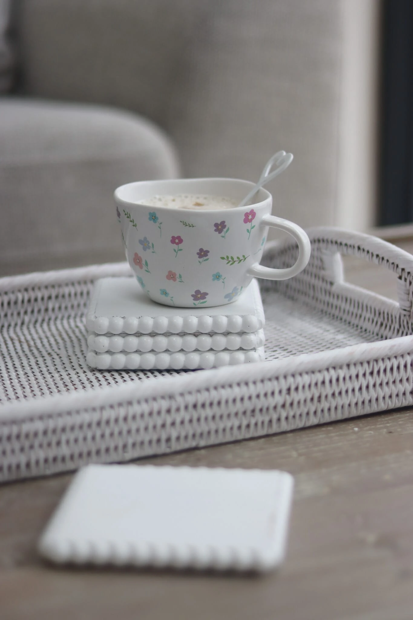 Our wooden coasters are made from paulownia wood, sold as a 4 pc set finished in white wash with shabby chic beading detail.