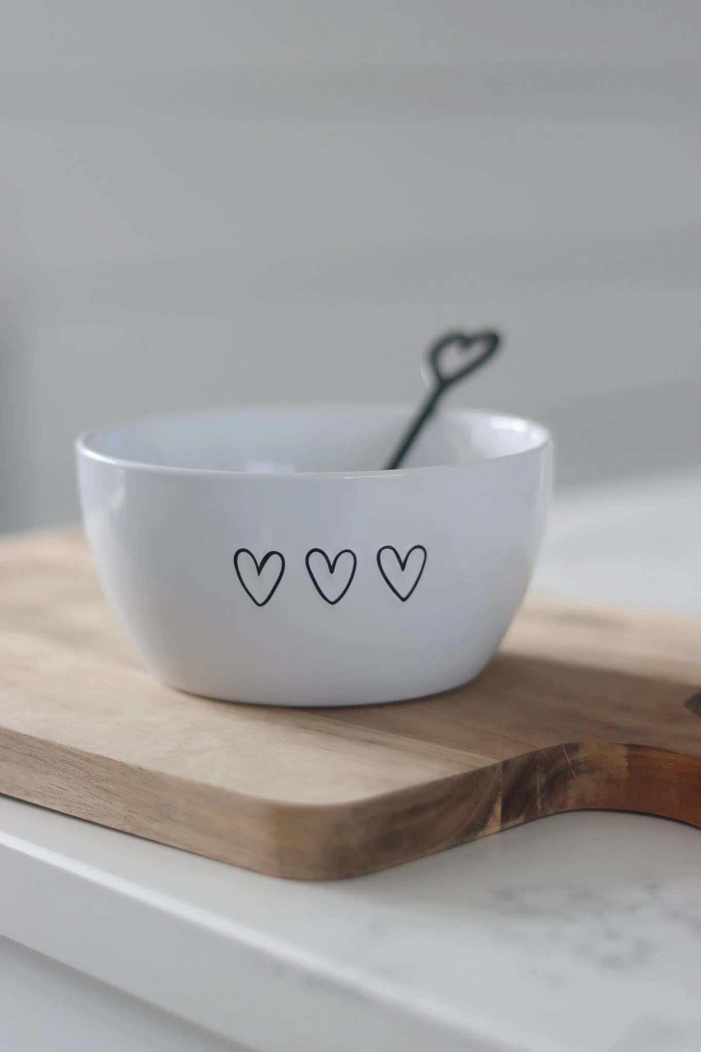 A set of good durable bowls are essential for your kitchen collection, our ceramic bowls are not supposed to be placed away hidden in cupboards but styled and displayed when not in use. Style with a wooden stool, some tea coffee sugar canisters , a matching ceramic mug and some of our heart tea spoons to transform your kitchen corner into a cosy space.