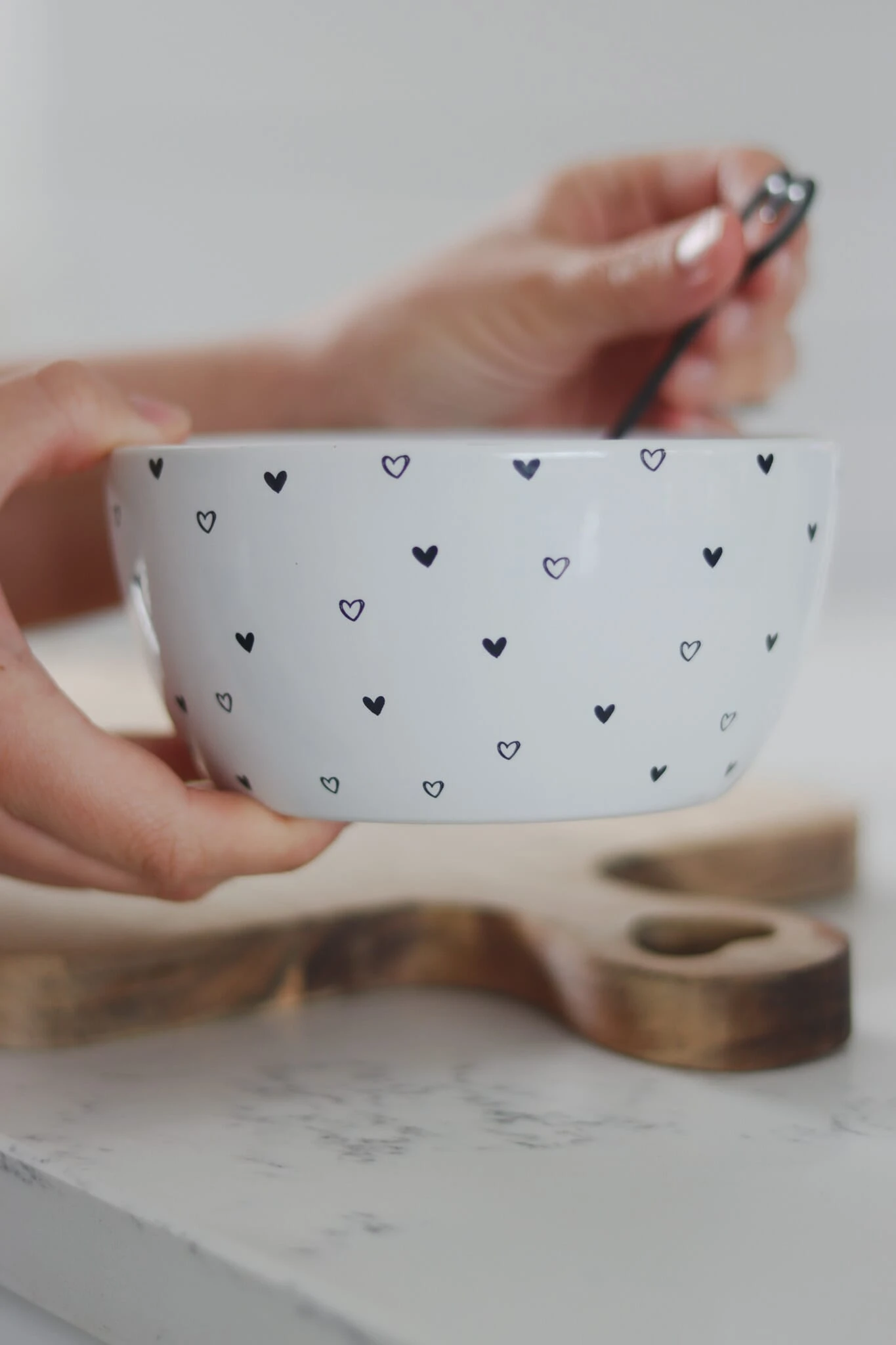 Our ceramic bowls are made from stoneware finished with a multi heart and dot permanent print.