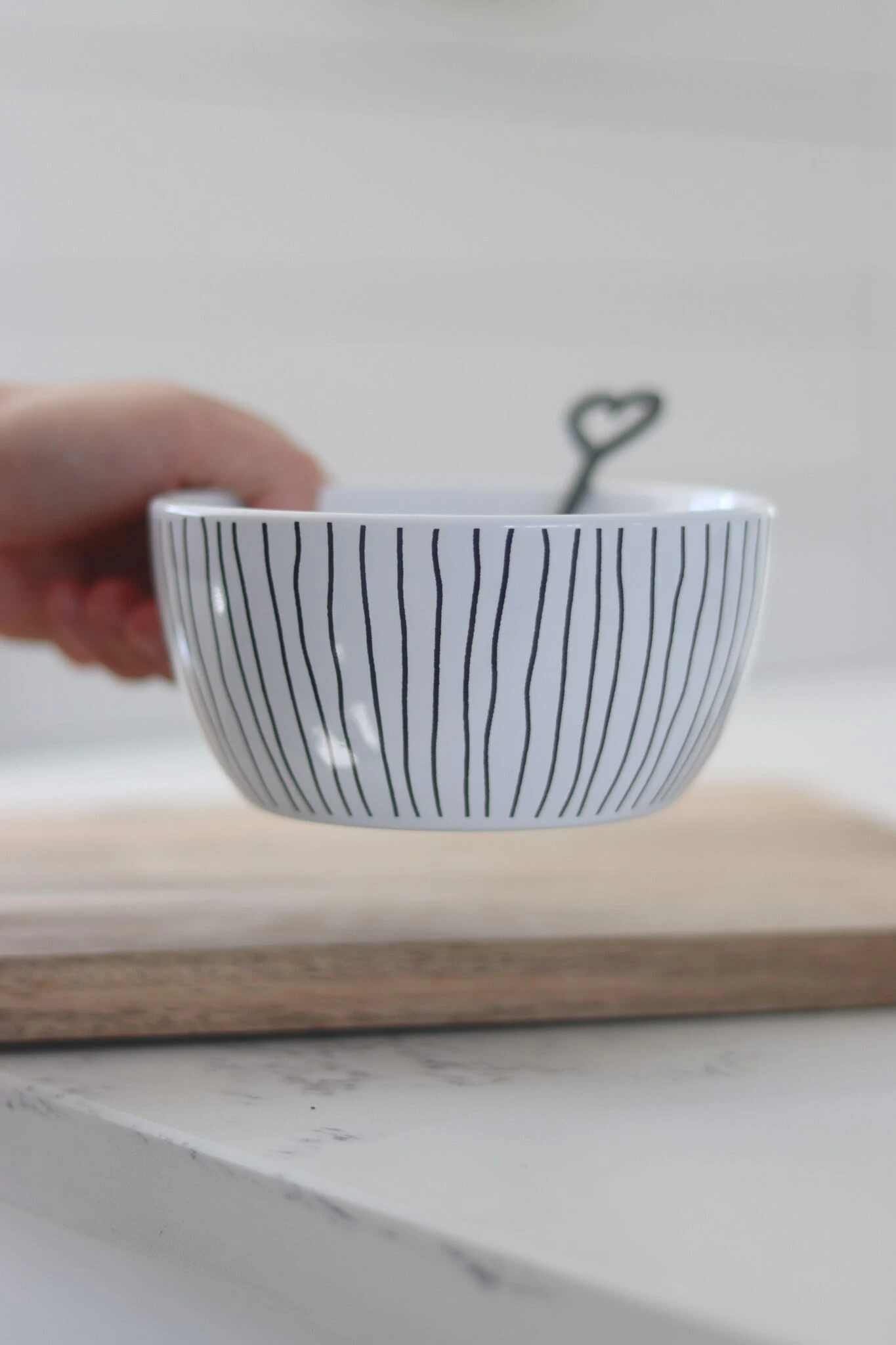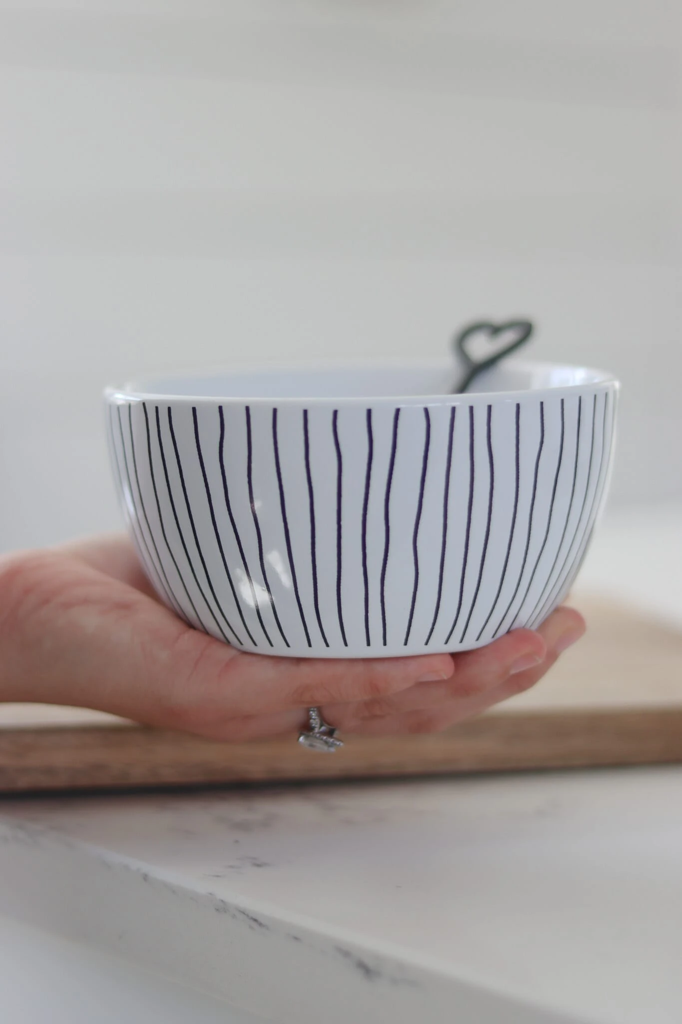 Our ceramic bowls are made from stoneware finished with a vertical striped pattern.