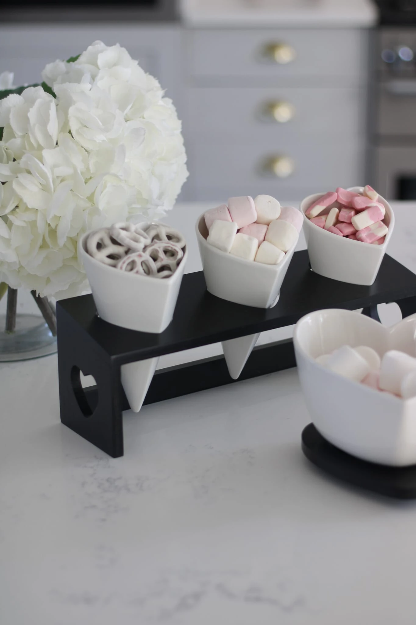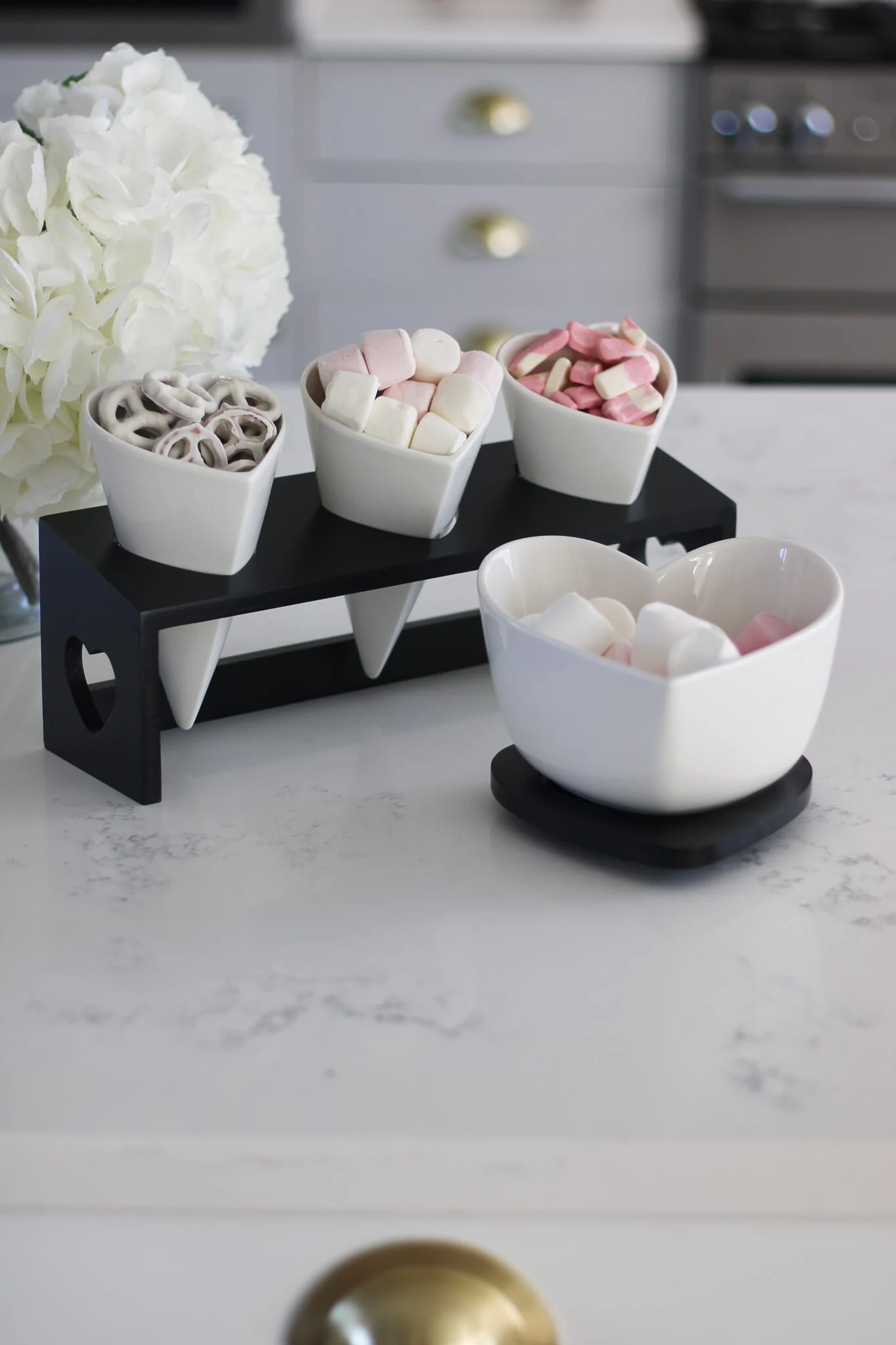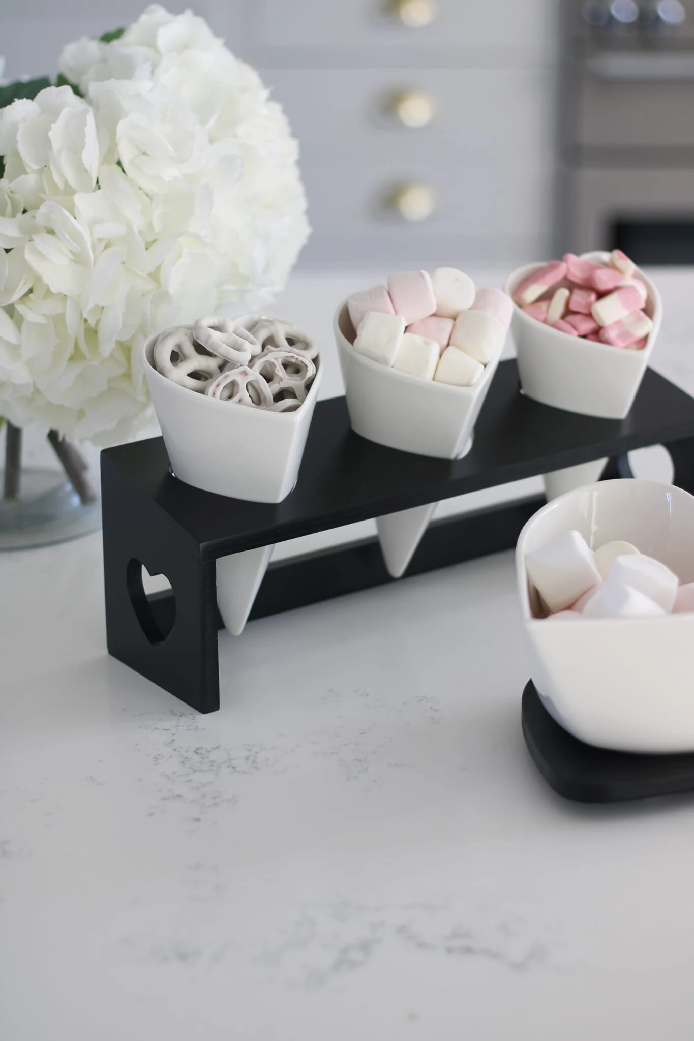 A smaller version to our 6 pc snacking station tour 3 pc version is perfect for individual use or for smaller gatherings. Use these stands to create a unique coffee station or cute hot chocolate station, style with snacks or decorator with faux flowers when not entertaining.