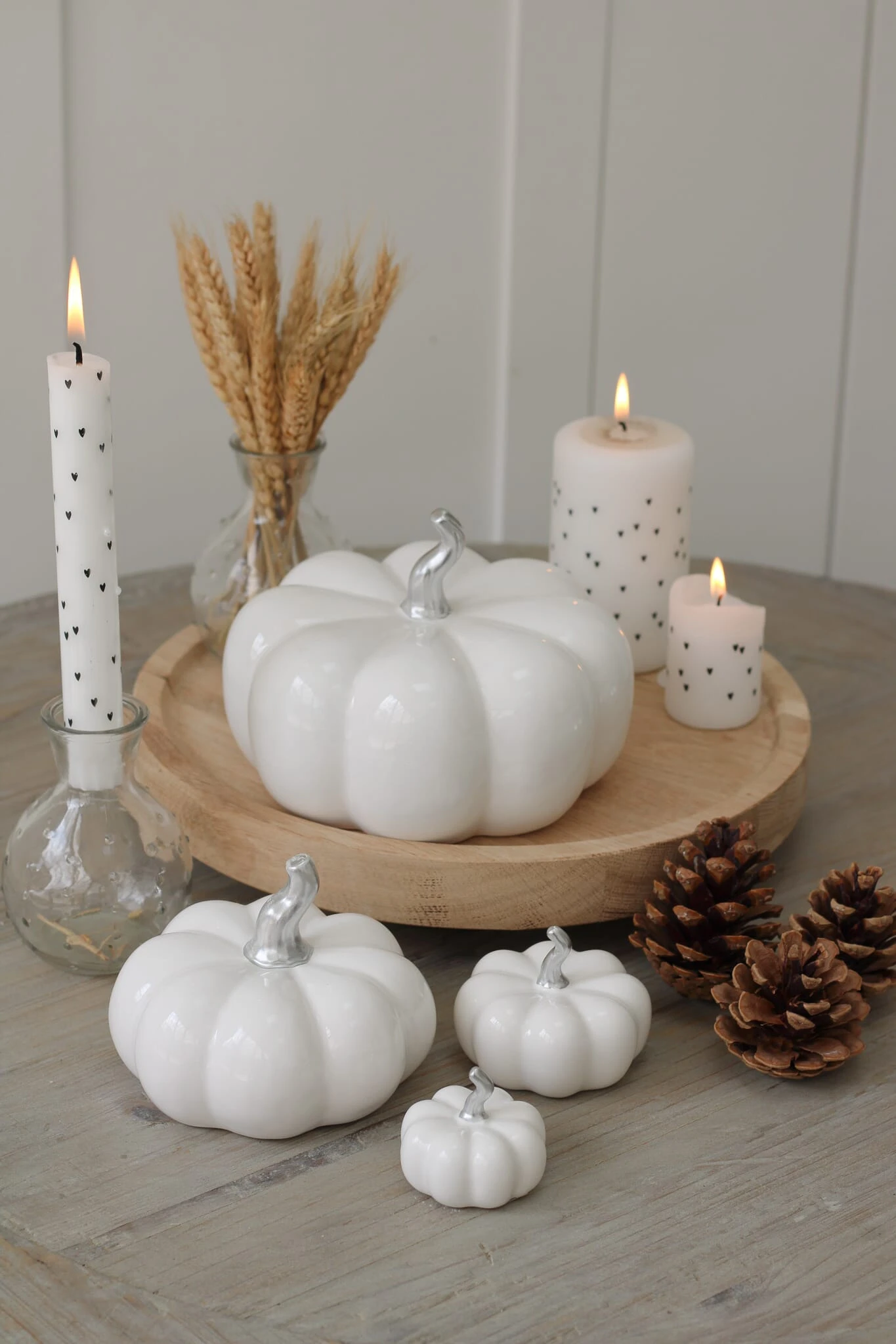 Introducing our ceramic pumpkin family finished in white, the perfect addition to your autumn decor. This set includes four pumpkins in various sizes, finished in white with a silver stalk.