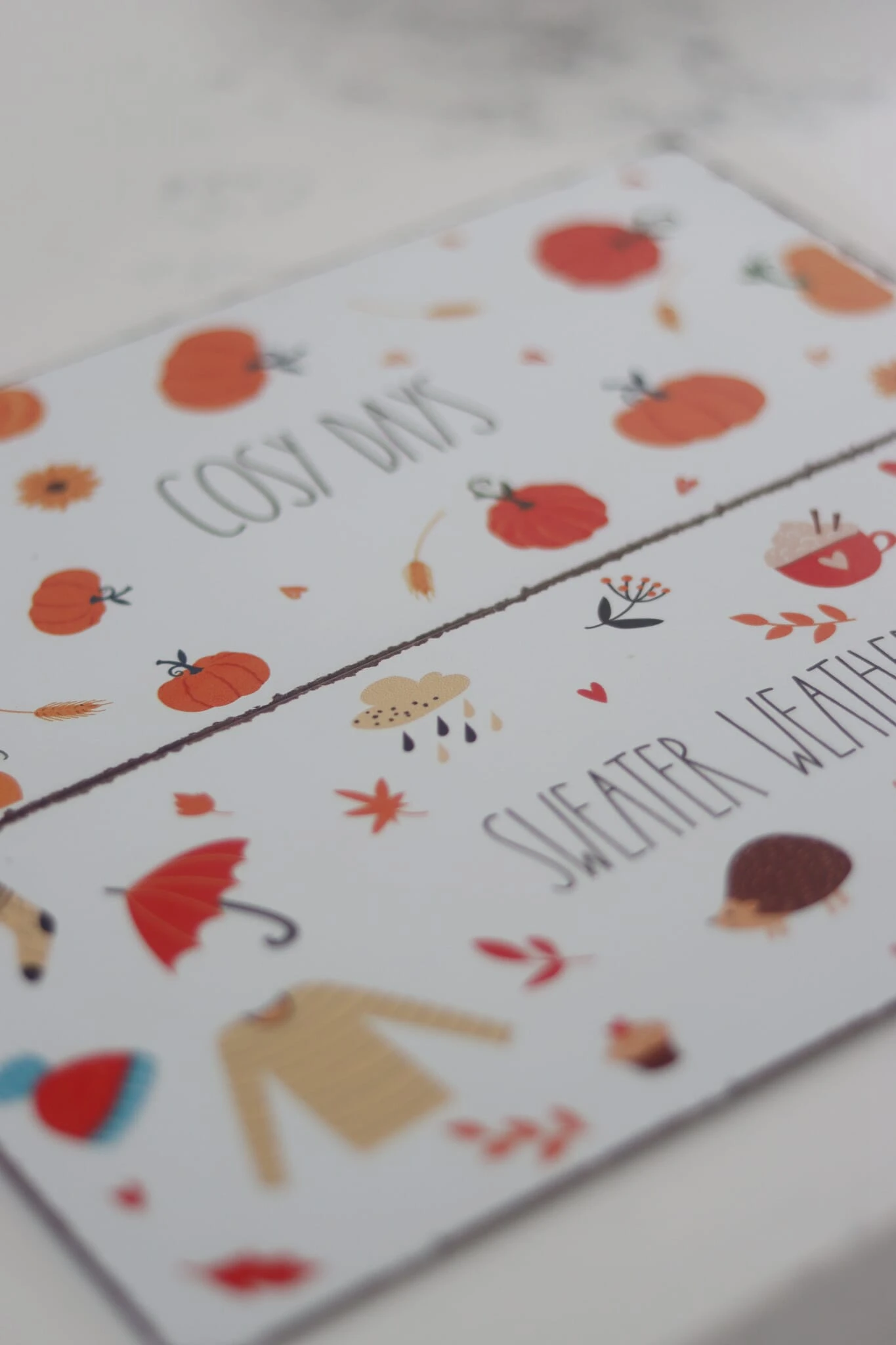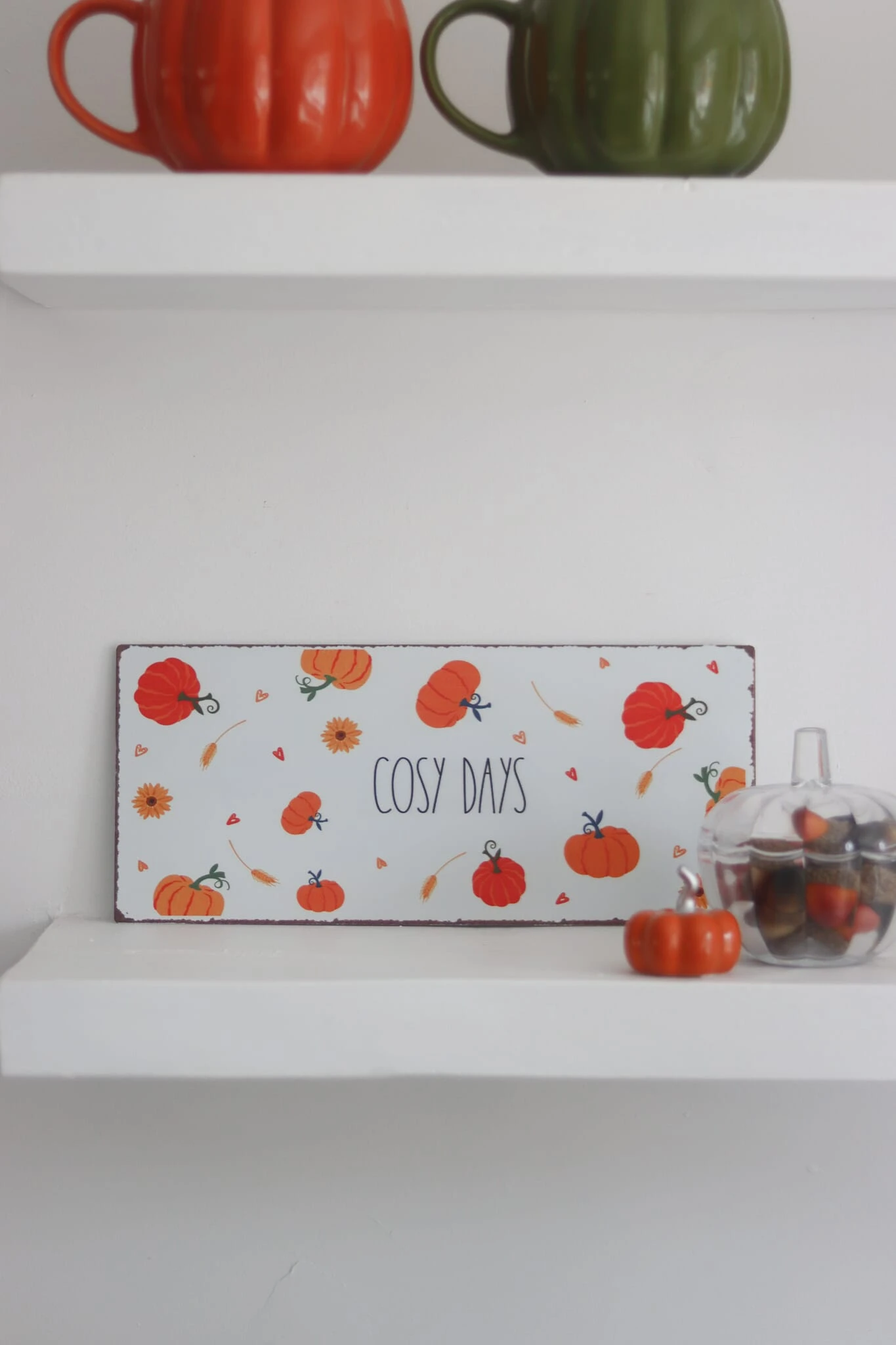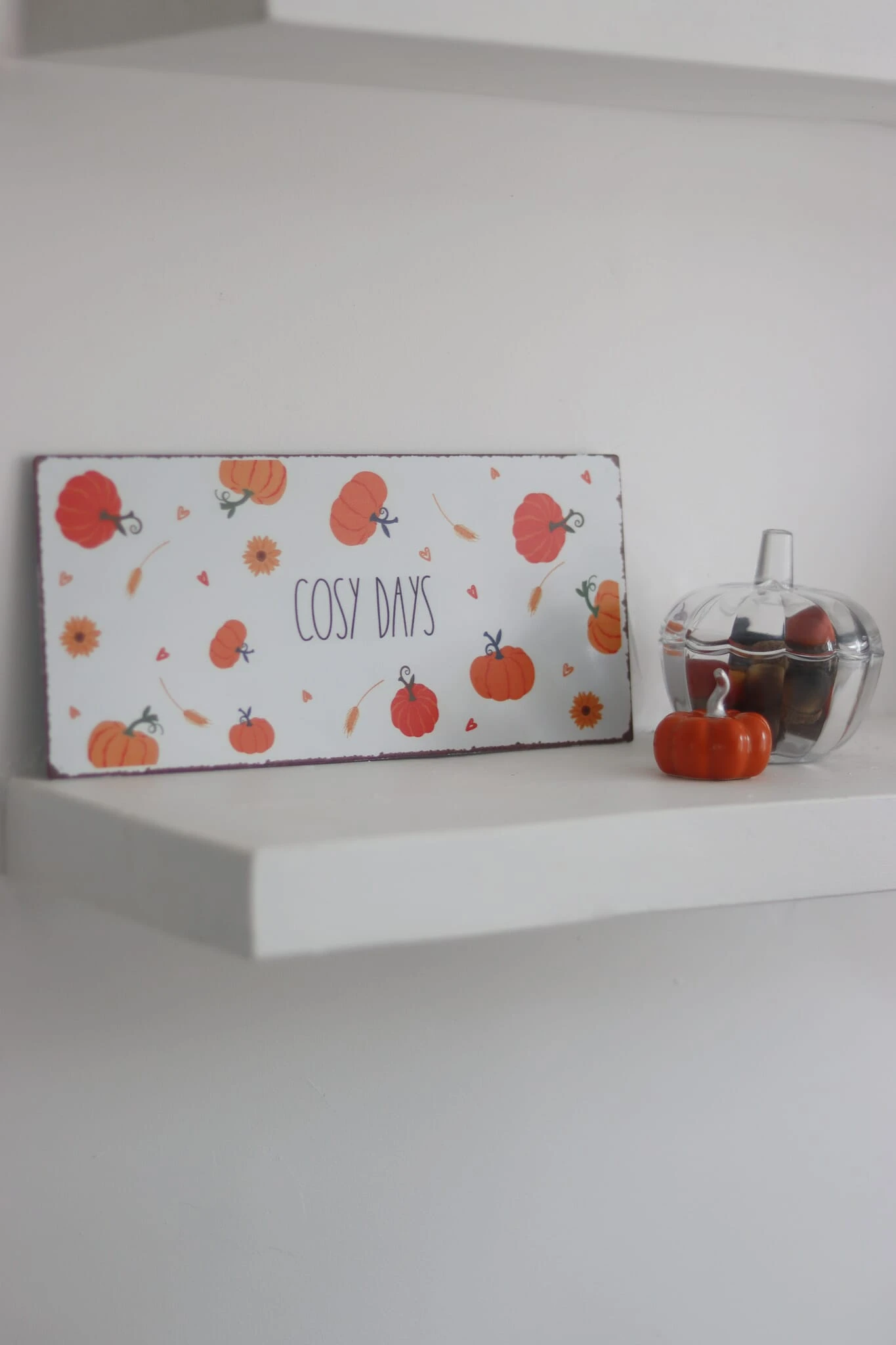 Welcome in the season with this Cosy Days decorative metal sign, featuring bright and autumnal pumpkins. Pop on your shelf next to your favourite autumn decorations for instant Cosy feels.