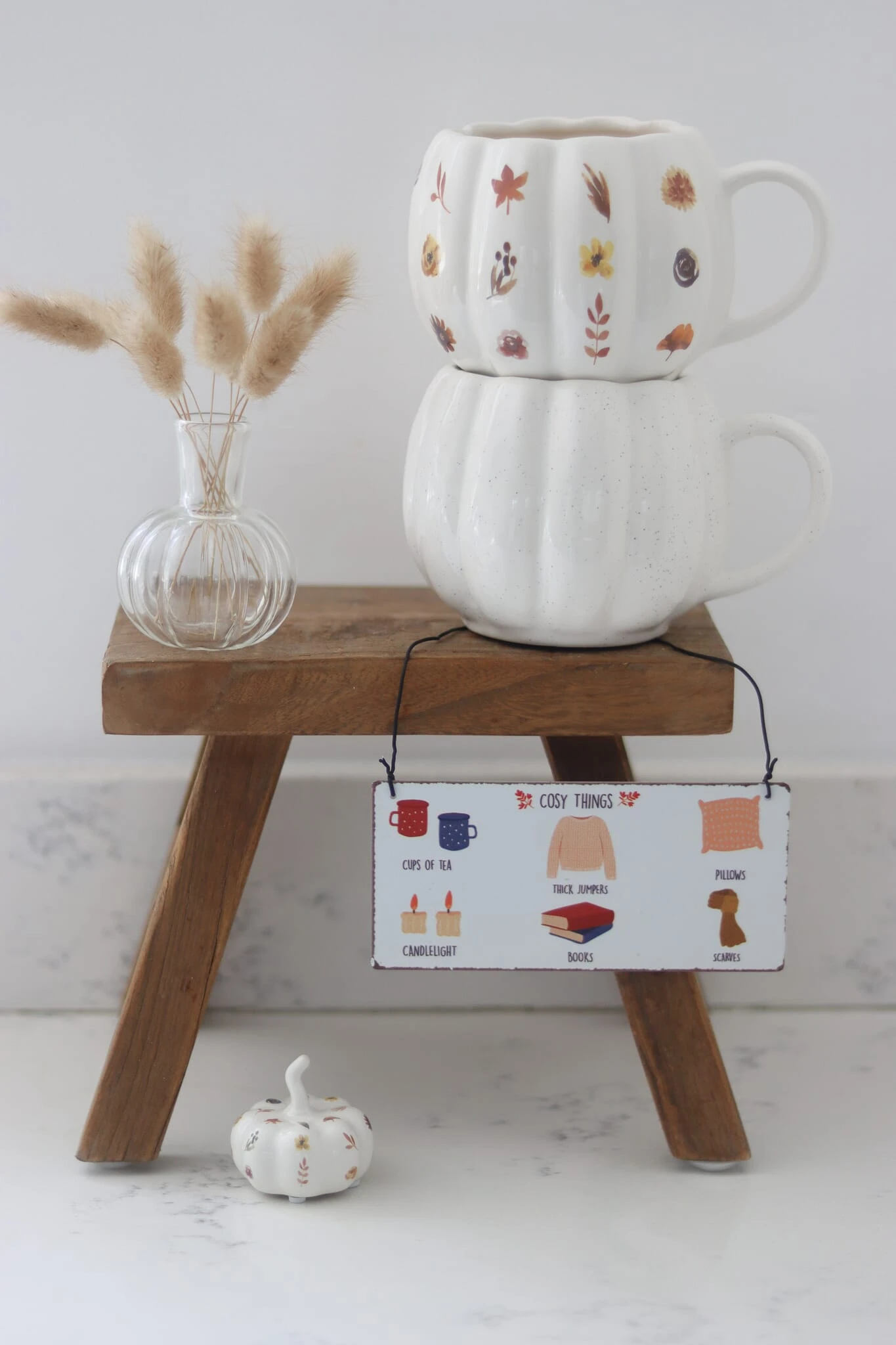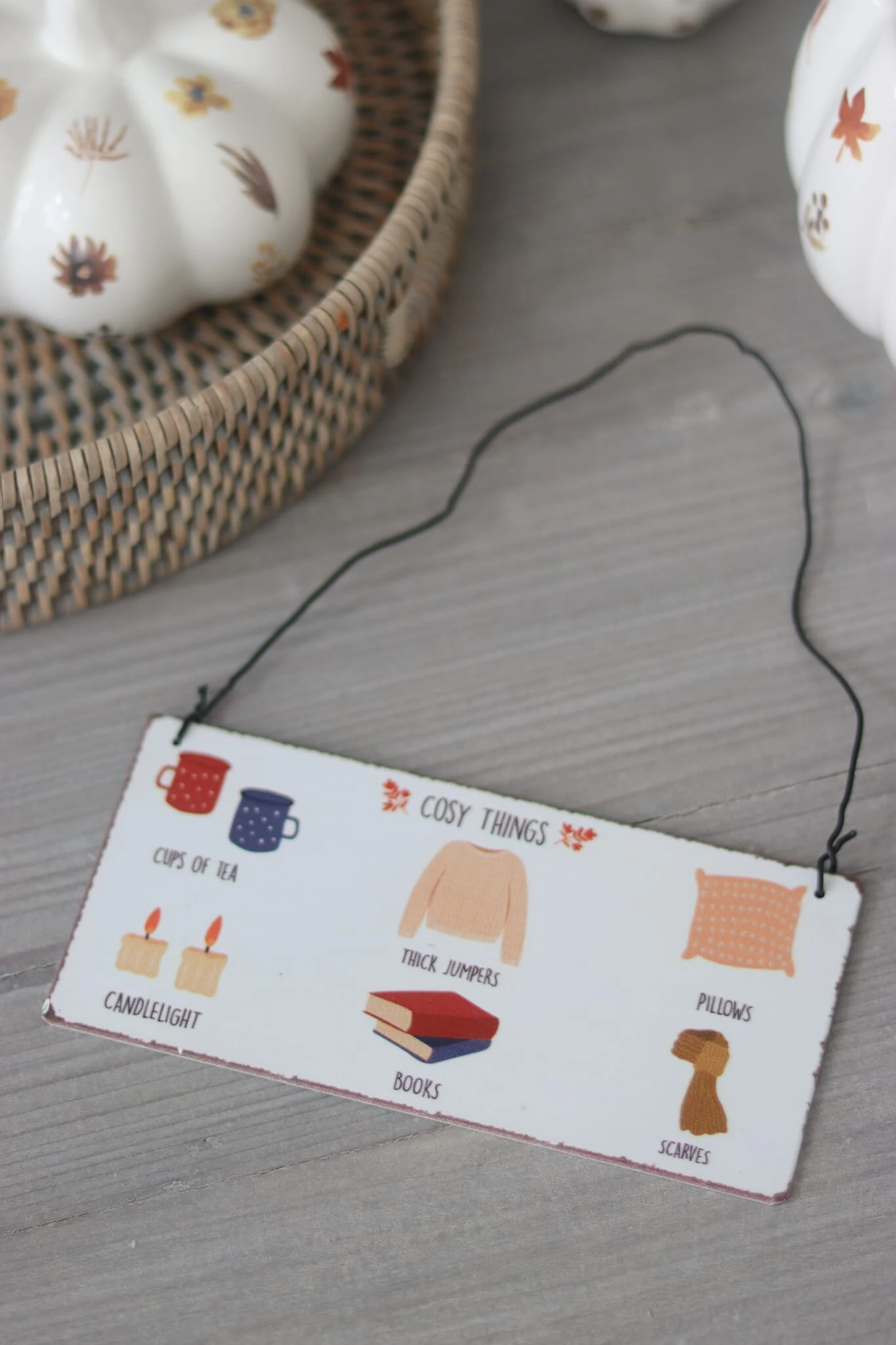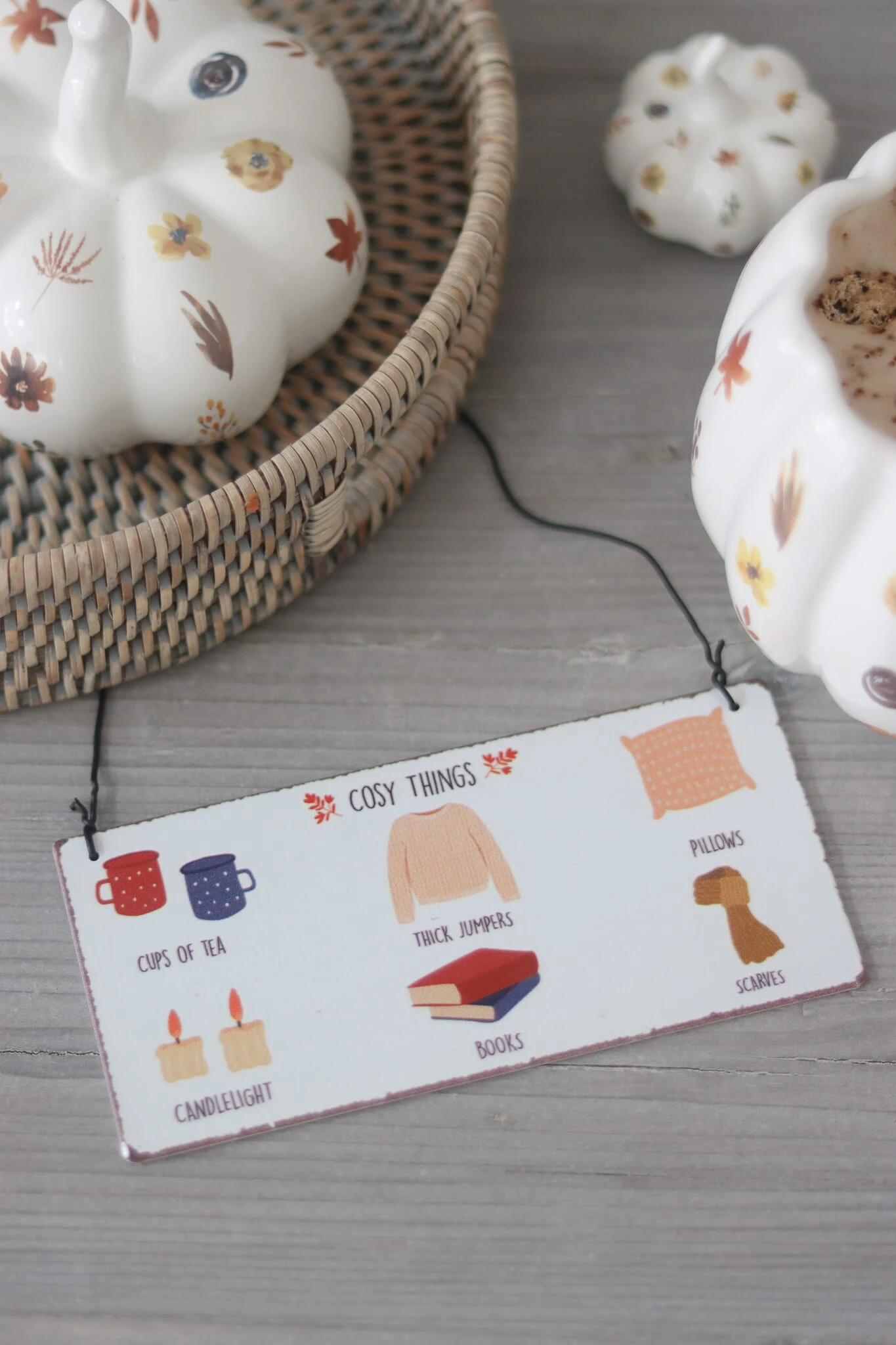 A simple metal sign with the wording cosy things, perfect for cosy season at home. Place next to your coffee or hot chocolate station or leave by your desk to add a little warmth in the colder months. These small simple metal signs can be hung on walls or mug hangs or simple rested alongside your tea coffee sugar canisters, seasonal displays or existing kitchen decor.