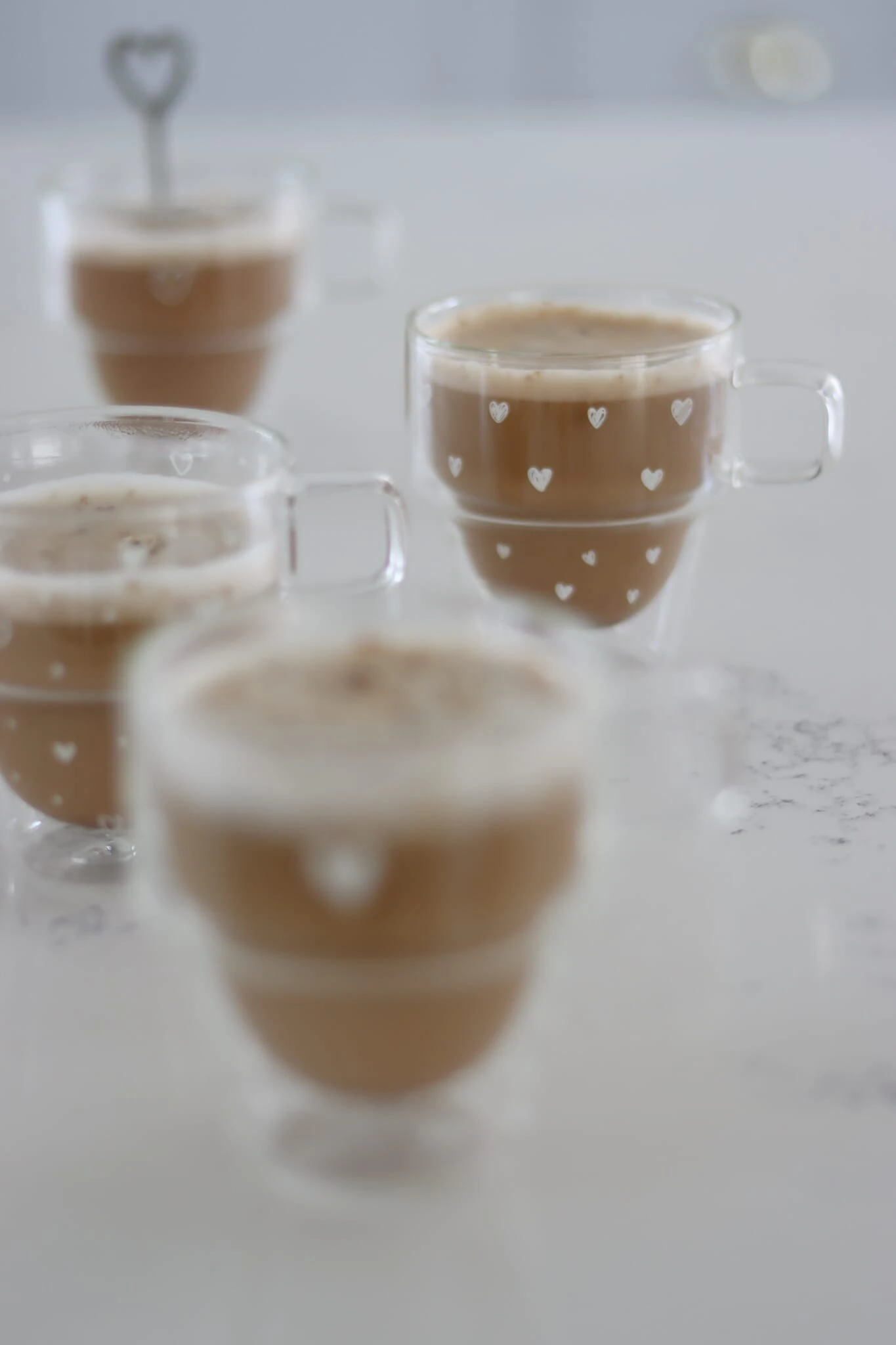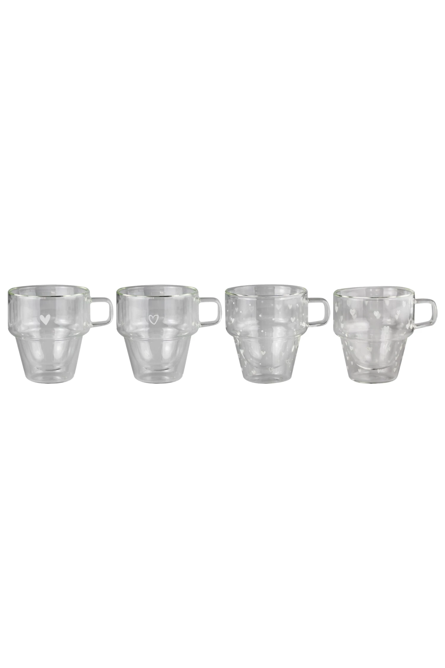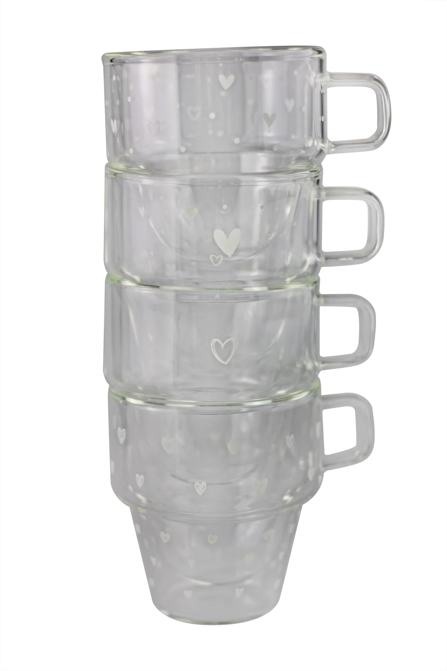 Double Wall Stackable glass mugs sold in a 4 pc set, different heart artwork variations on each design, multi hearts, single heart coloured, single heart outline and multi heart and dots, finished in white.