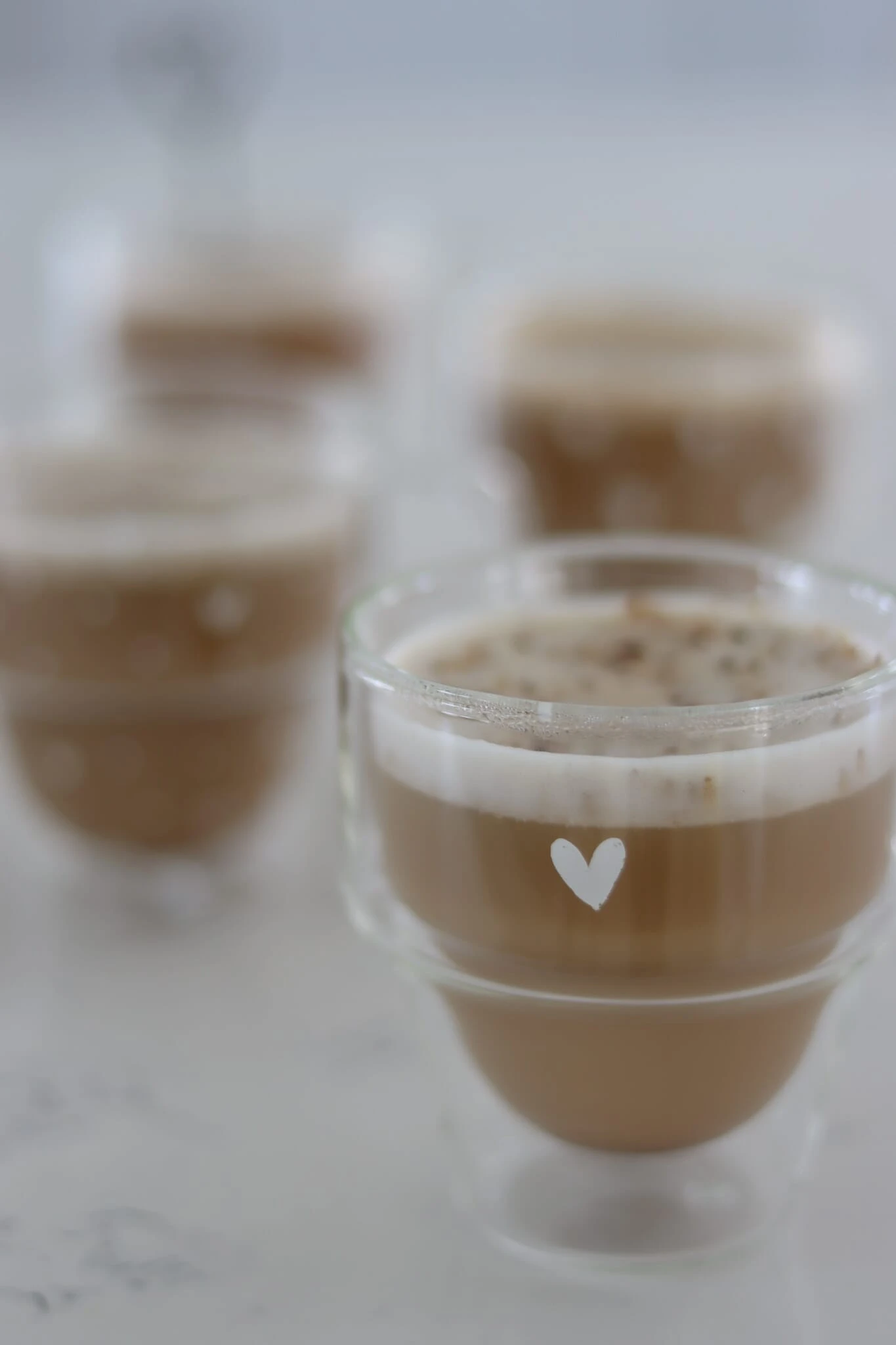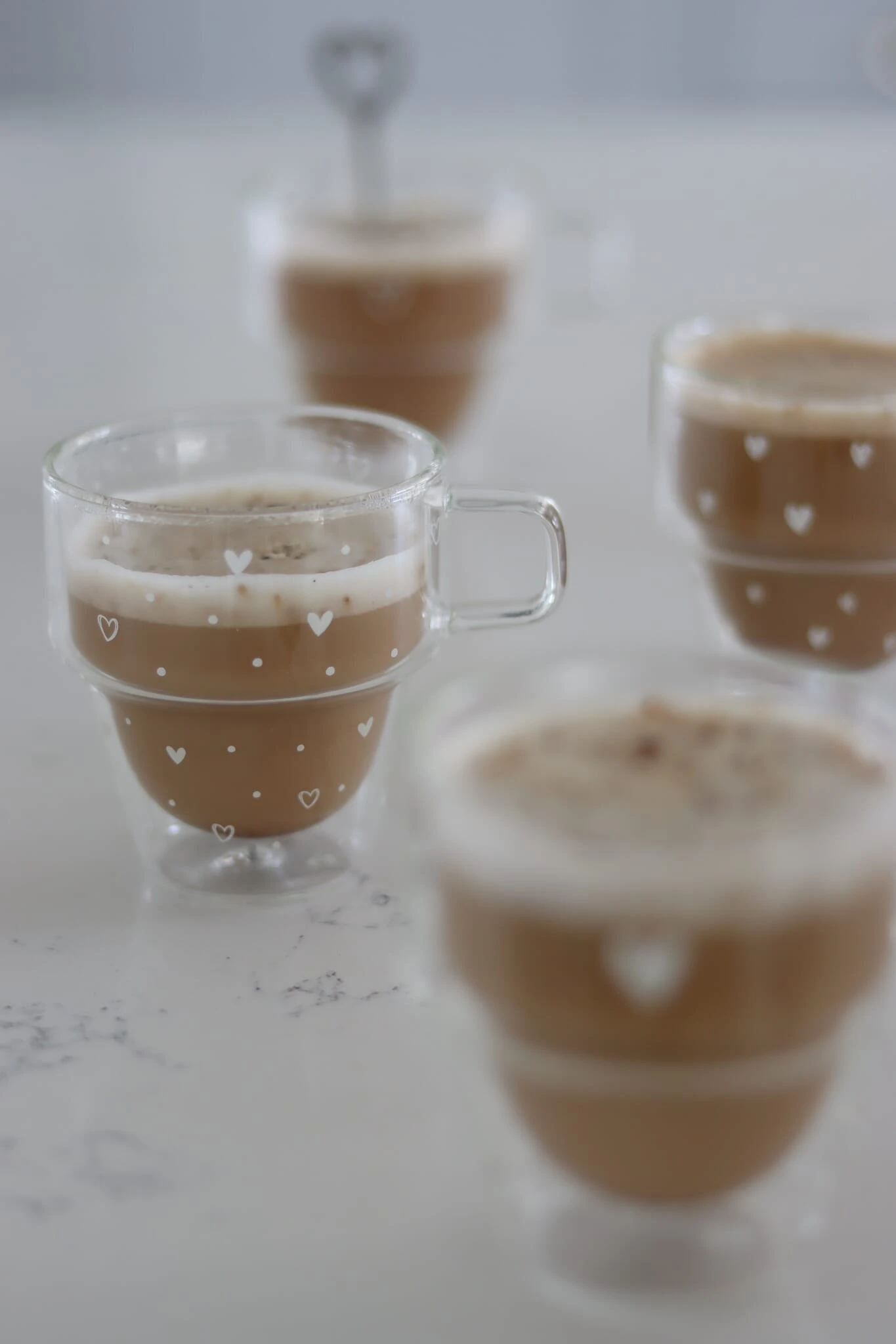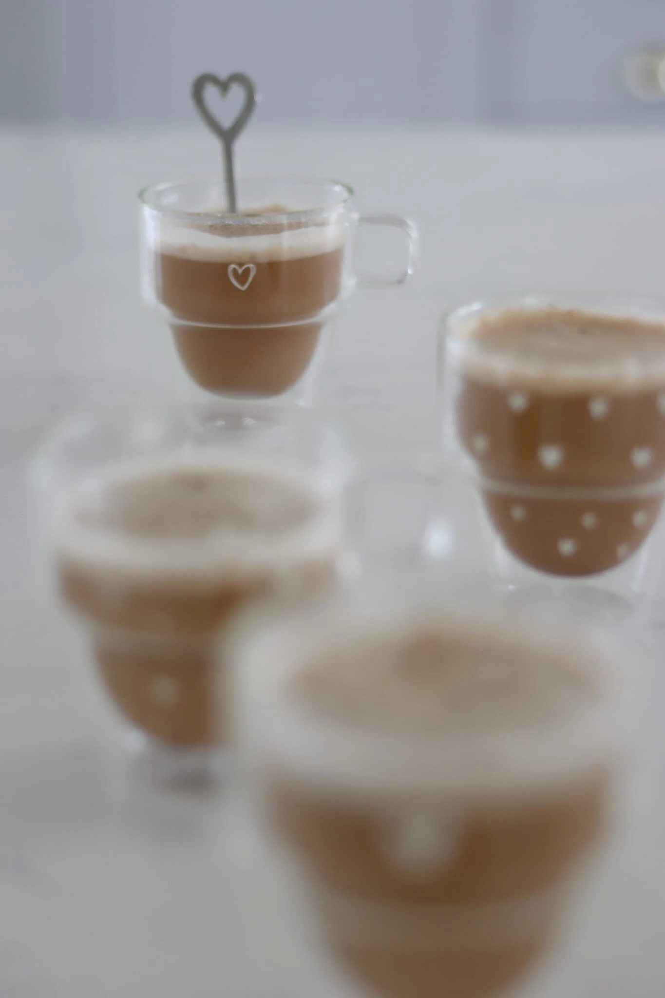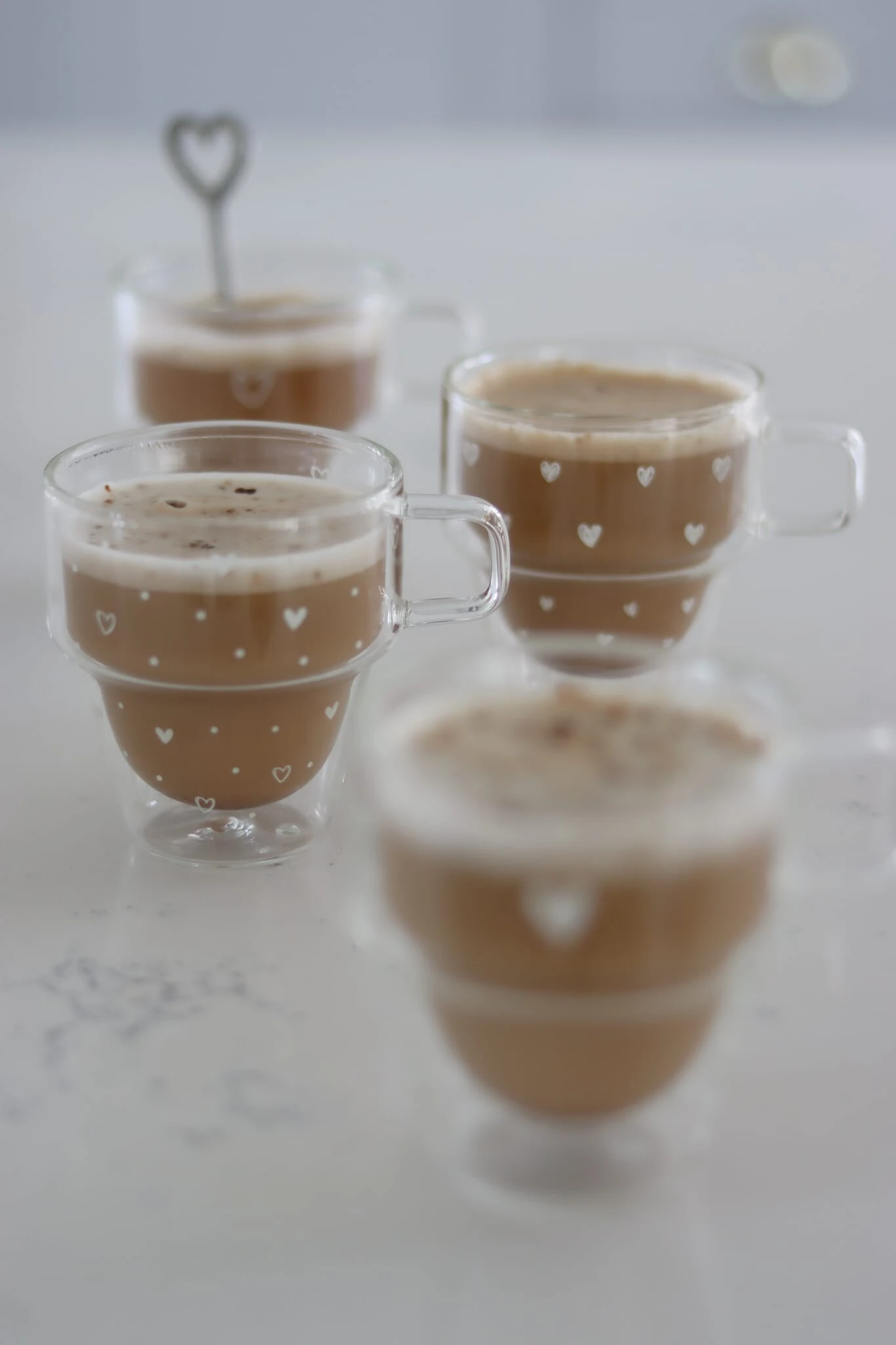 Double Wall Stackable glass mugs sold in a 4 pc set, different heart artwork variations on each design, multi hearts, single heart coloured, single heart outline and multi heart and dots, finished in white.