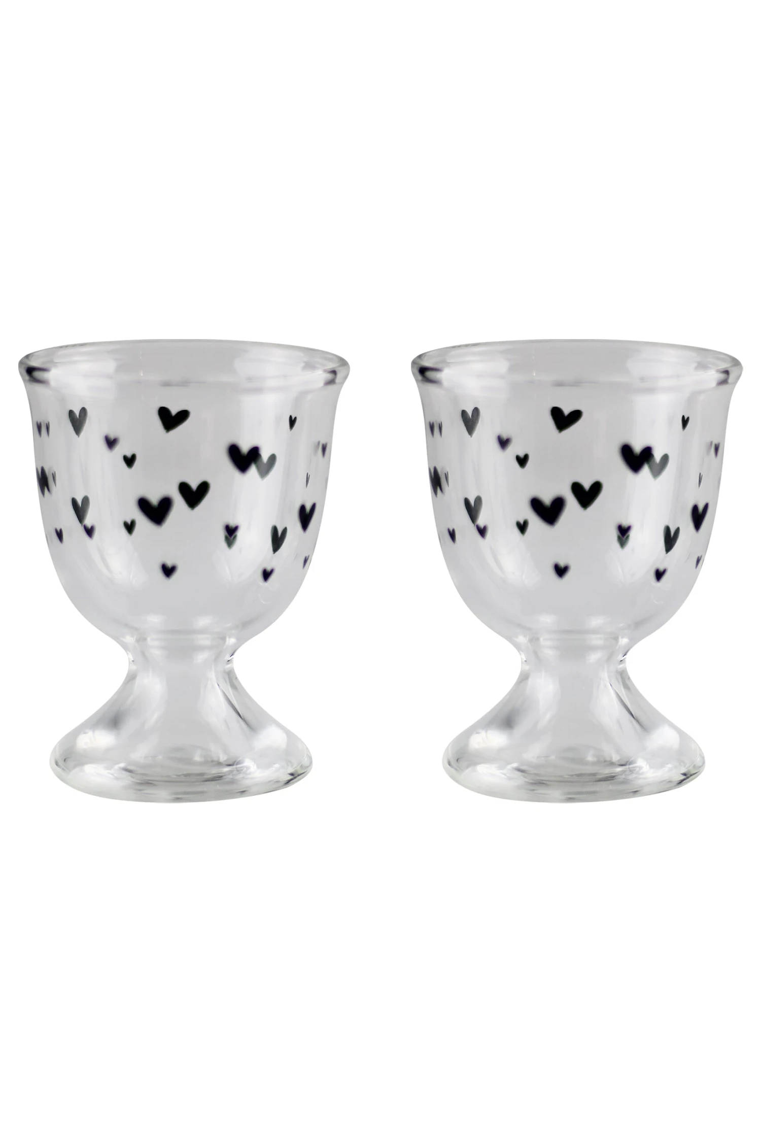 A cute egg holder, moving away from the old stainless steel or dark plastic cups, this egg holder is made from borosilicate glass with a unique black multi heart print to finish.