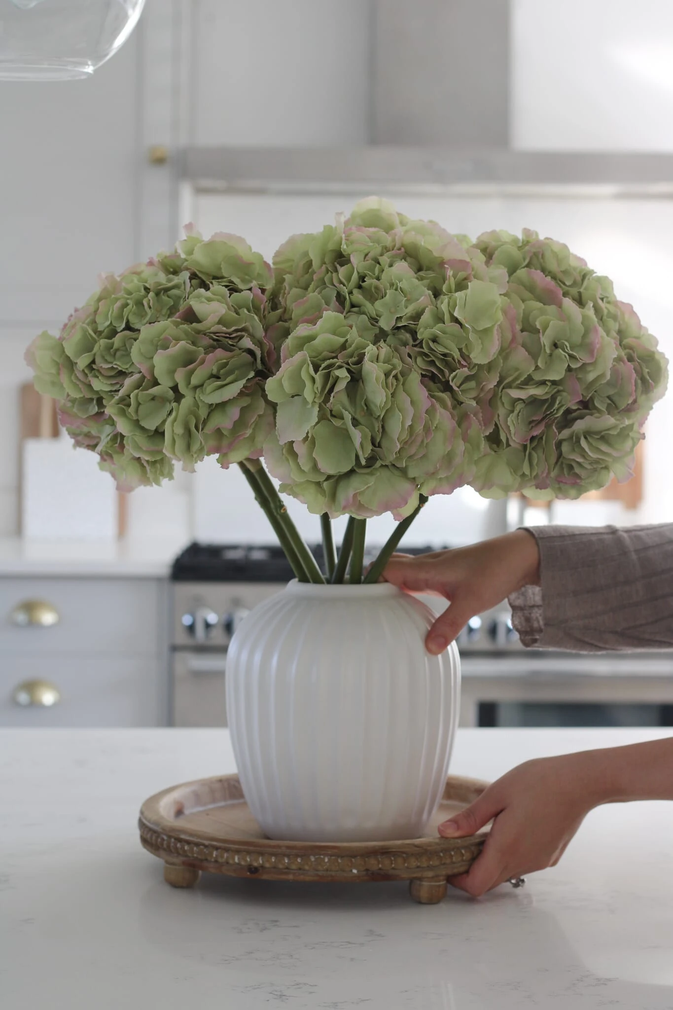 If you like luxury fake flowers this hydrangea stem is as good as they come, finished in a mild light Green with slight pink tips creating beautiful Summer hues. This large fluffy mop head makes it super easy to style on its own or with other stems for a larger arrangement.
