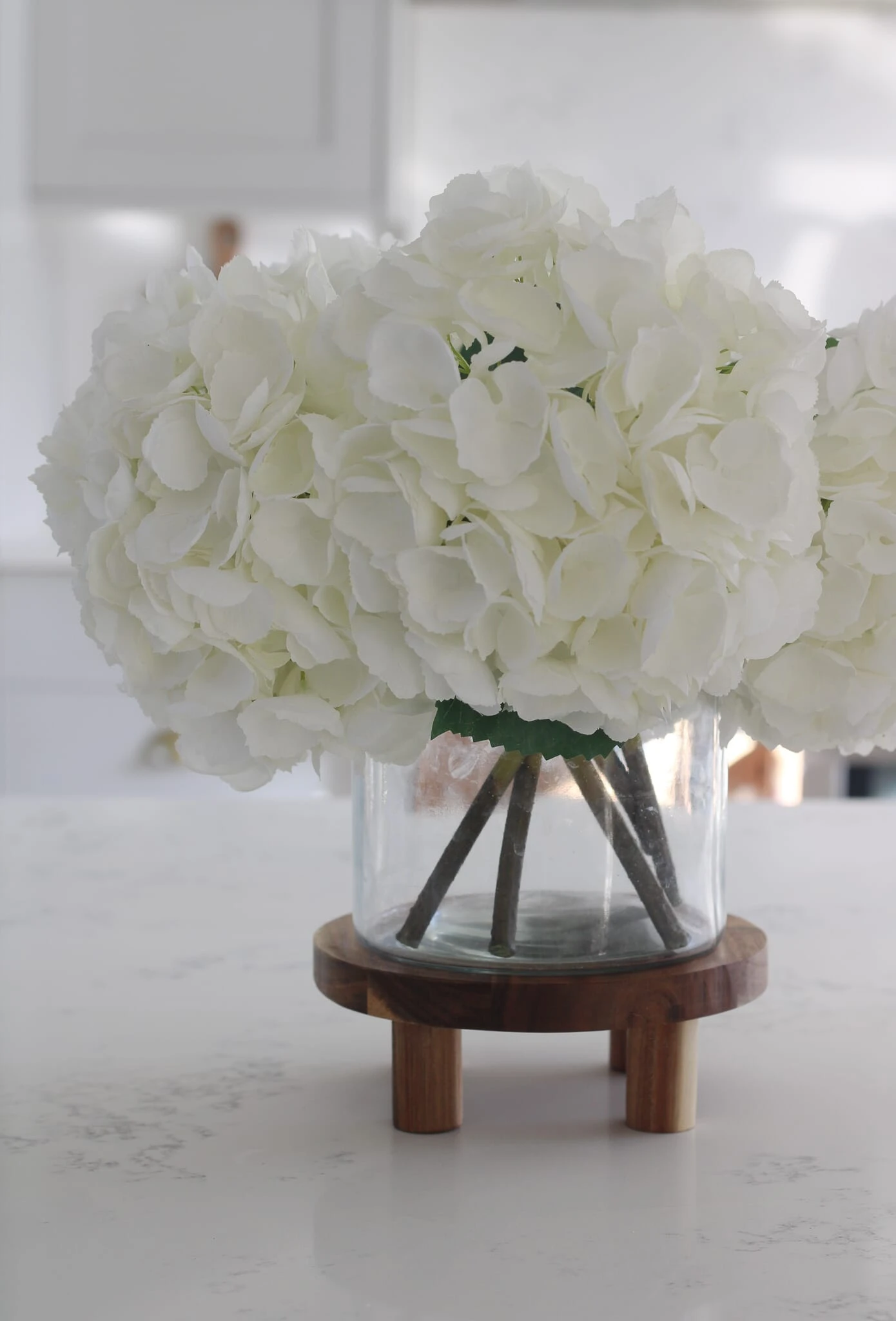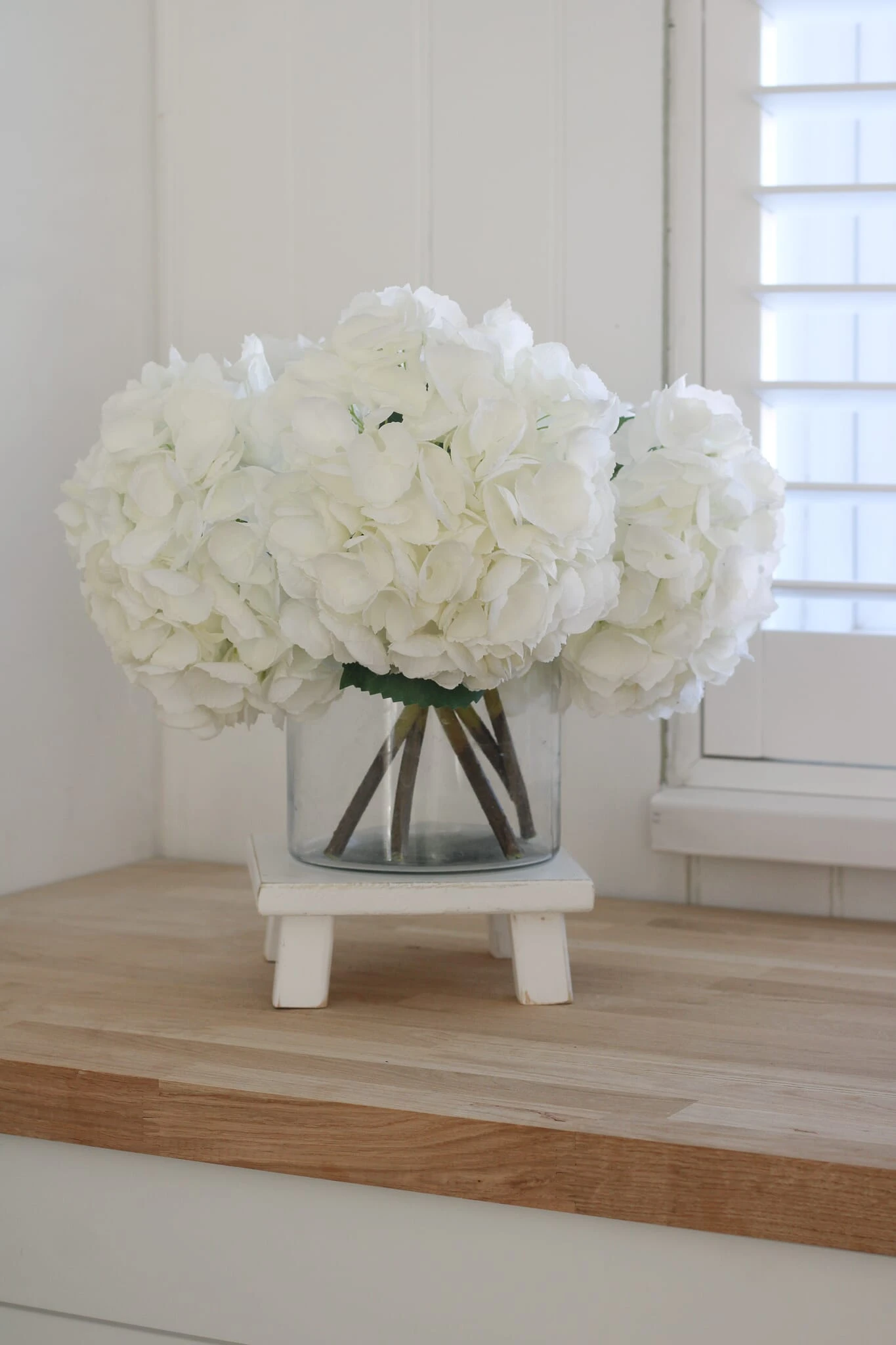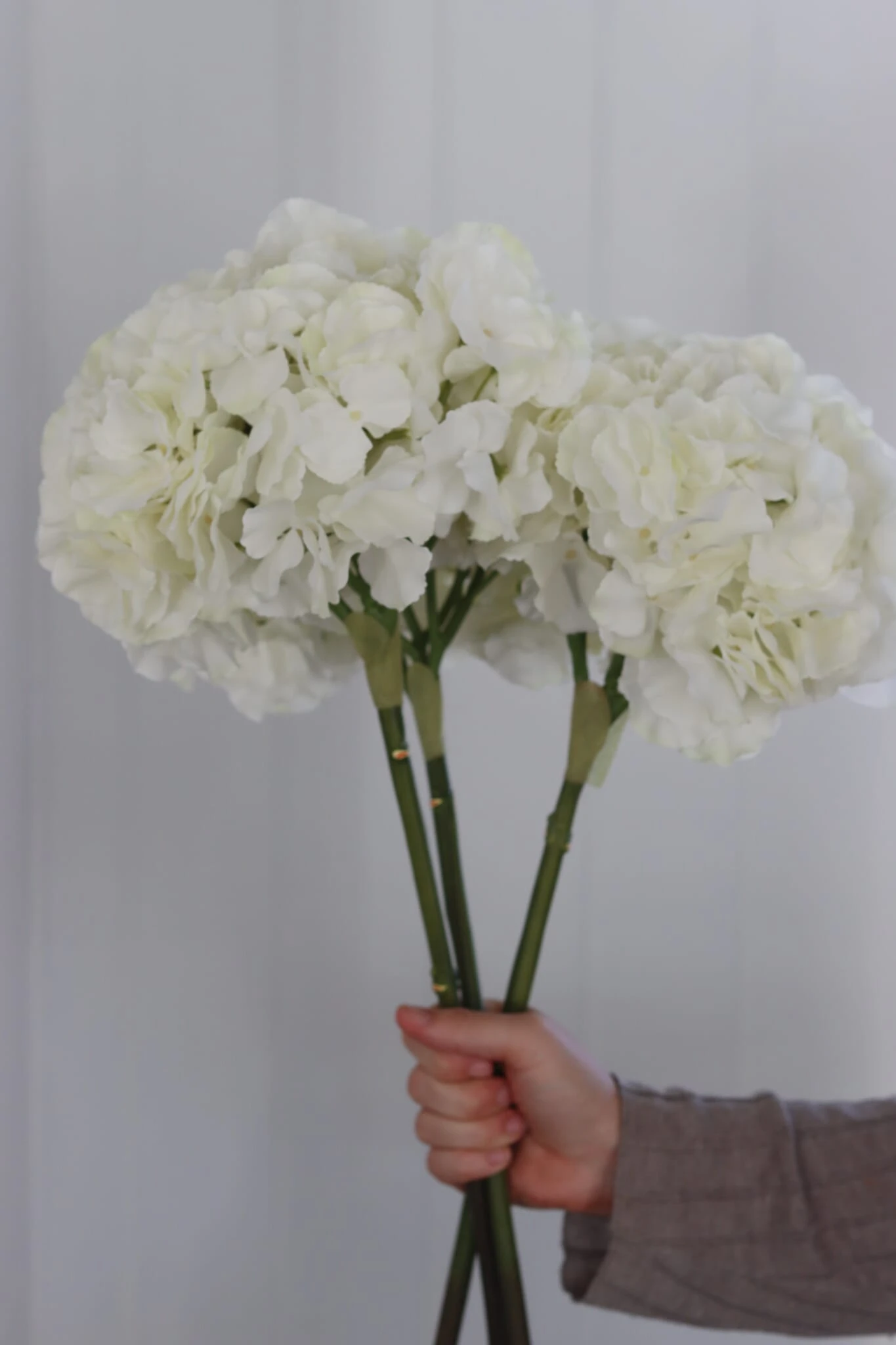 These large White mop head Hydrangea stems are realistic and simply beautiful , if you like fake flowers these are as good as they come. Simply place 3 or 4 in a glass vase for a maximum impact in your home, leaving the bouquet on a coffee table tray or on your Kitchen island for a simple yet beautiful statement.