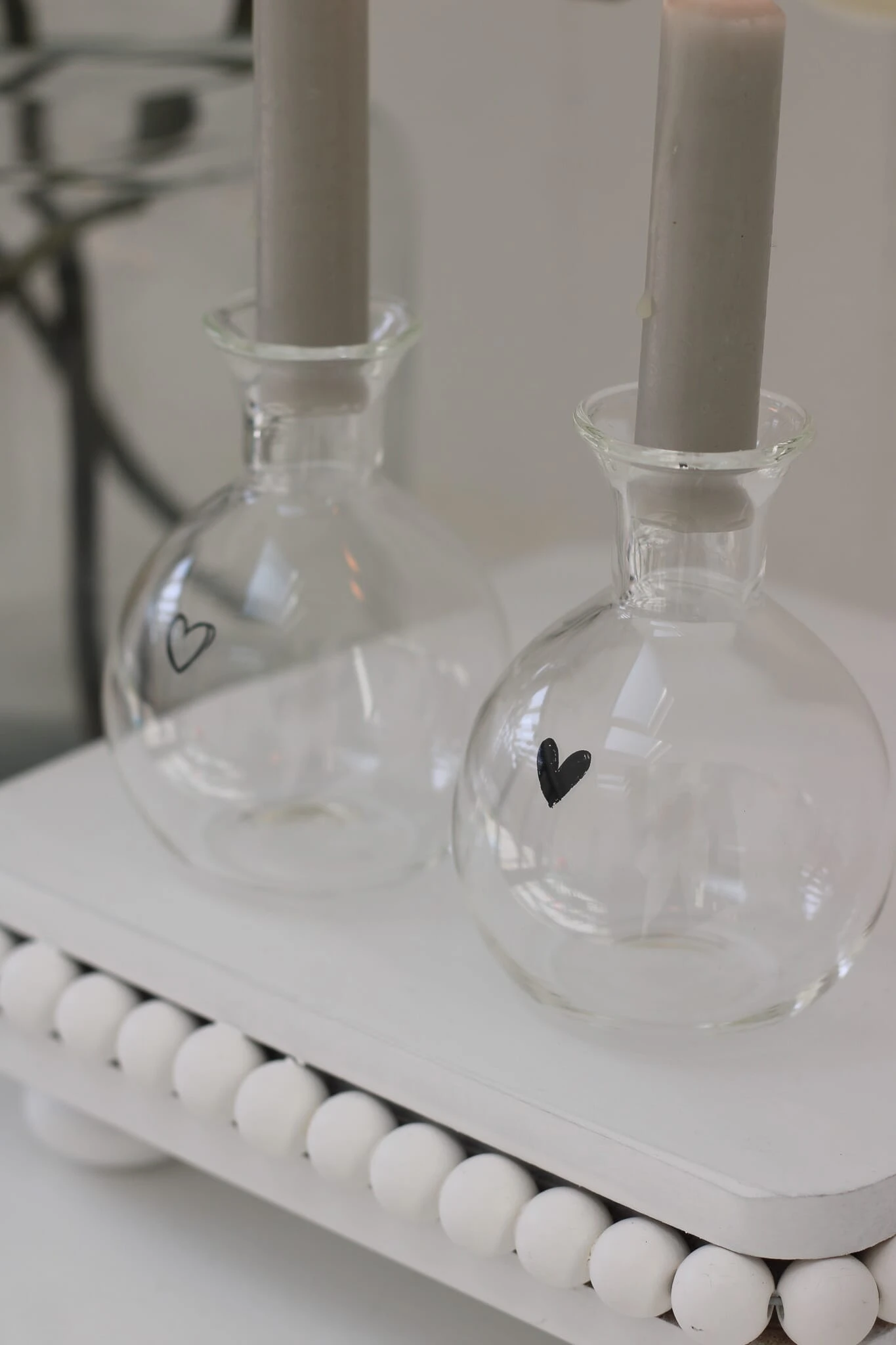Make a statement in your kitchen with our simple glass bud vase. Featuring a single heart pattern, this glass vase adds a bright feel around your home. Its round shape and intricate details make it a captivating focal point, whether displayed on a wooden tray or integrated into a shabby chic-inspired arrangement.