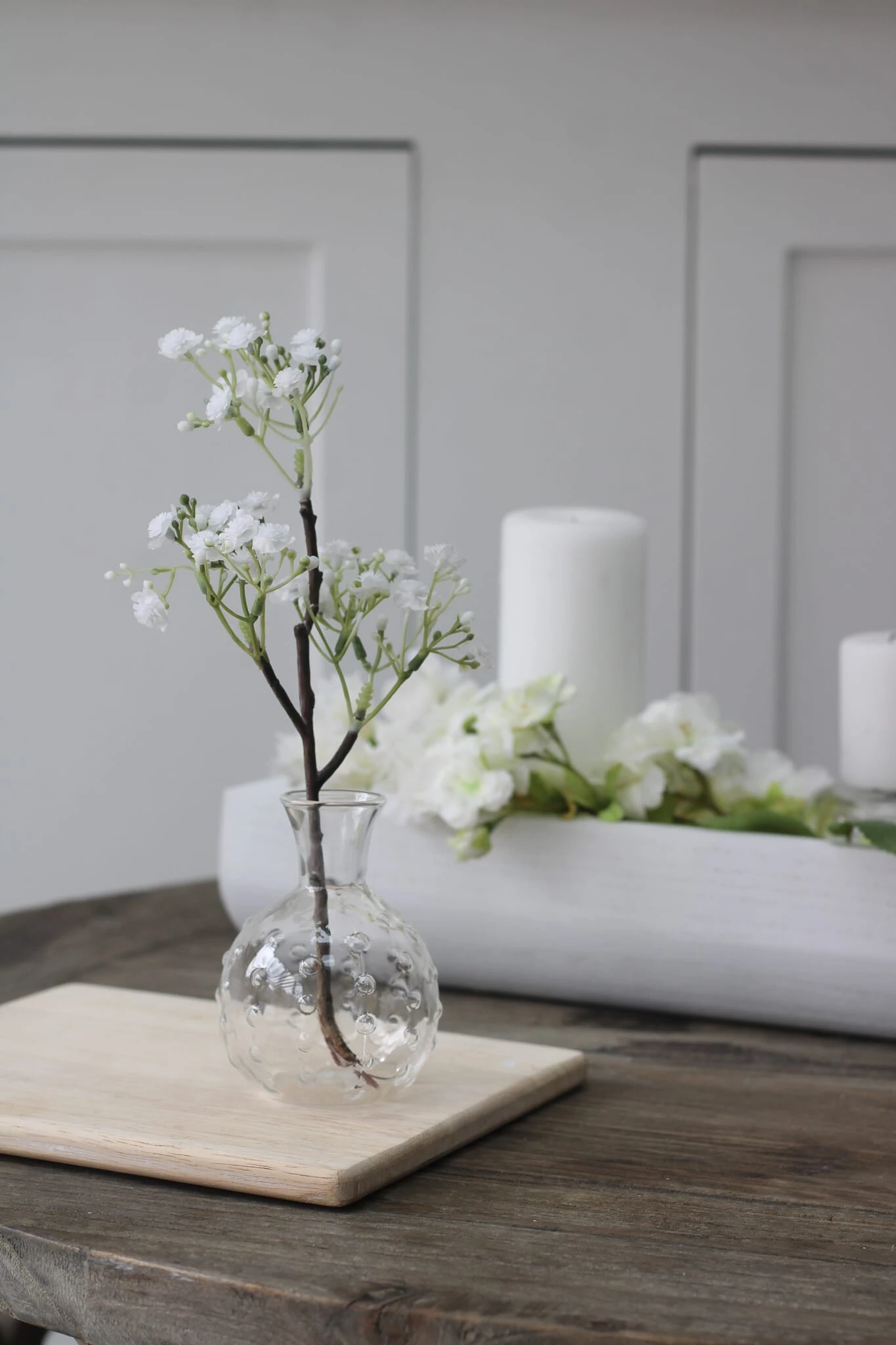 Introduce a modern touch to your kitchen decor with our contemporary glass bud vase. Its transparent design allows for versatile styling, making it a versatile accent piece for your wooden tray arrangement or countertop display.