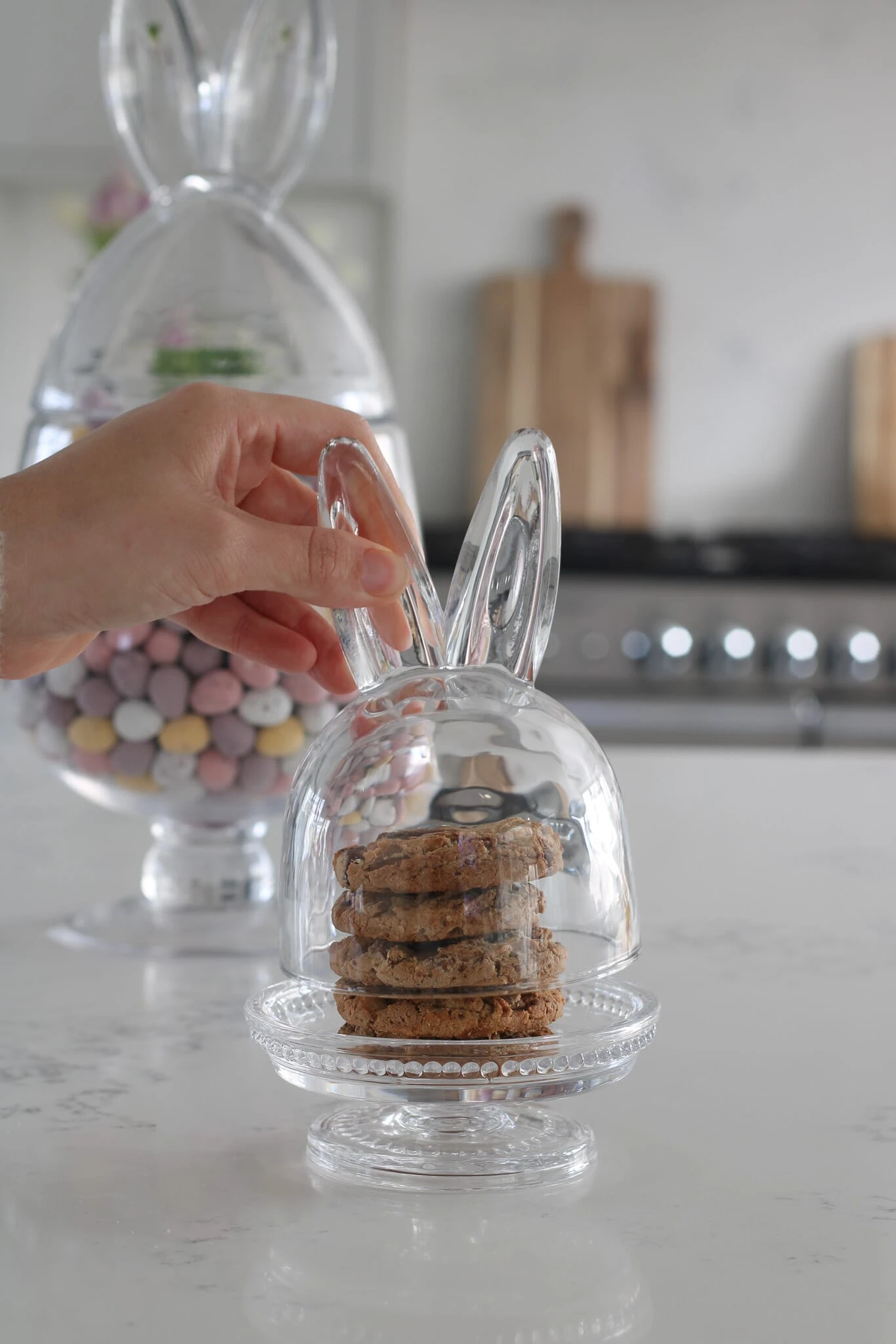Our glass cake stands with cute bunny covers are a perfect accessory for your easter decor.