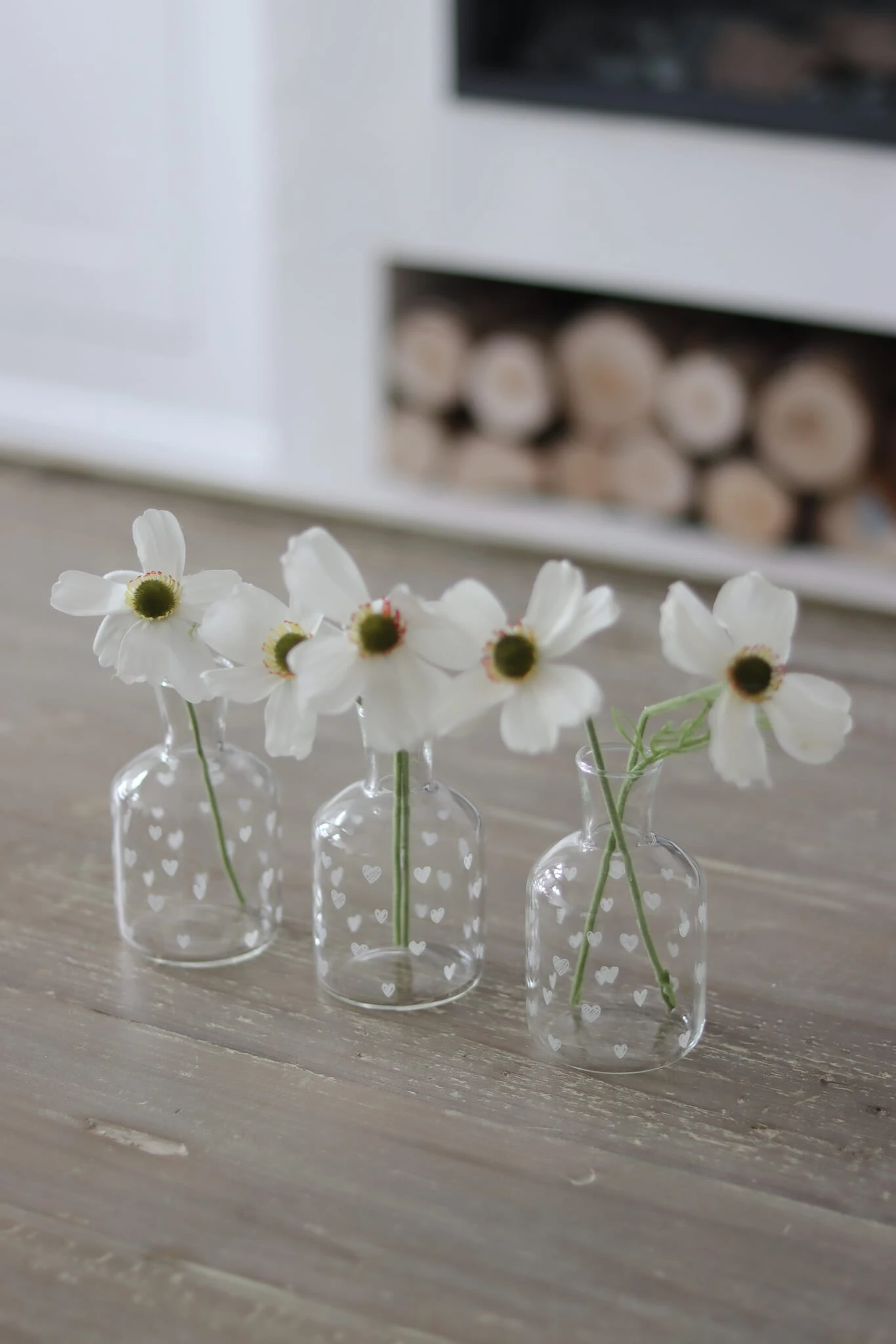 A beautiful Glass candlestick holder, featuring a small white multi heart pattern.