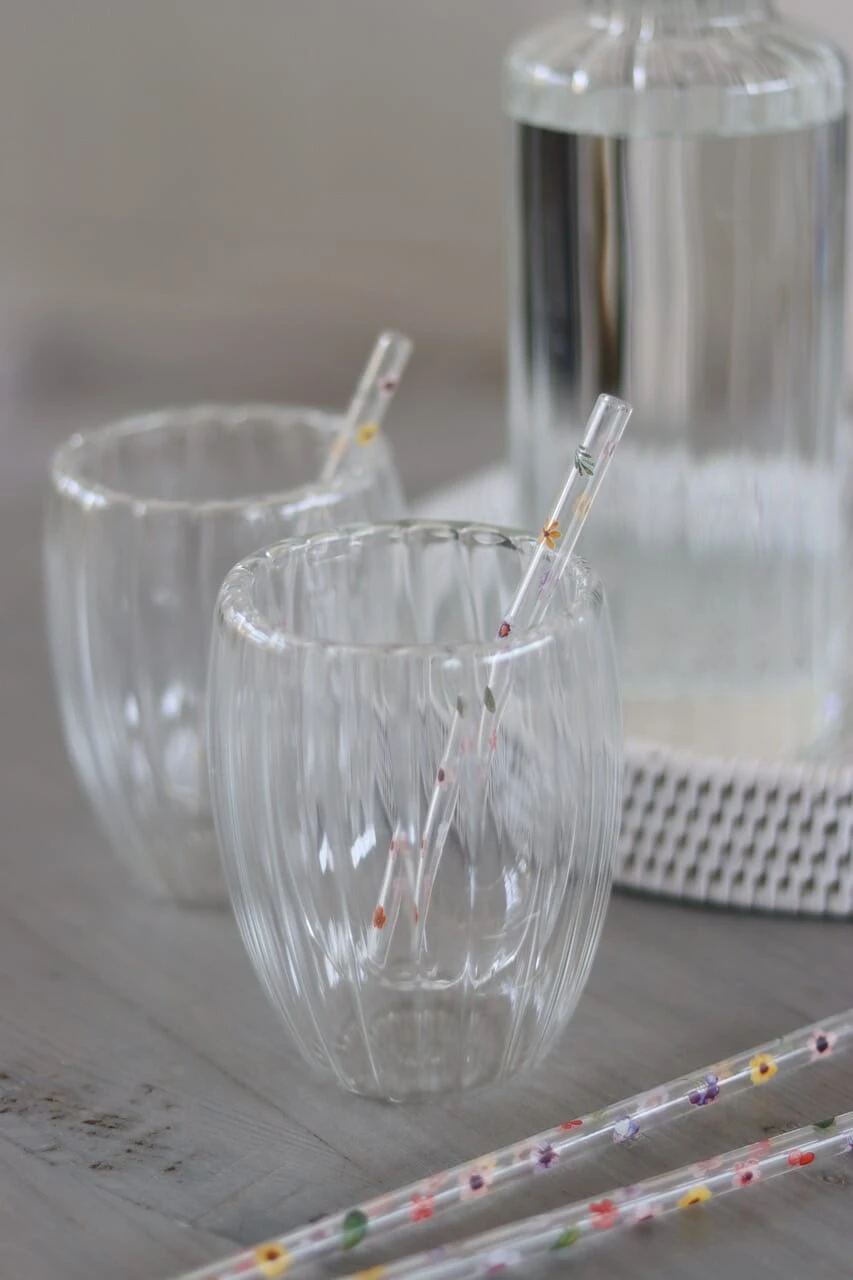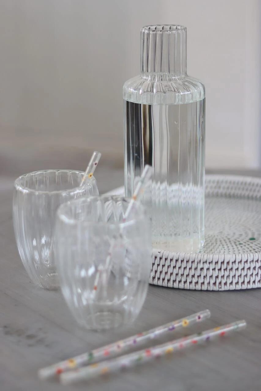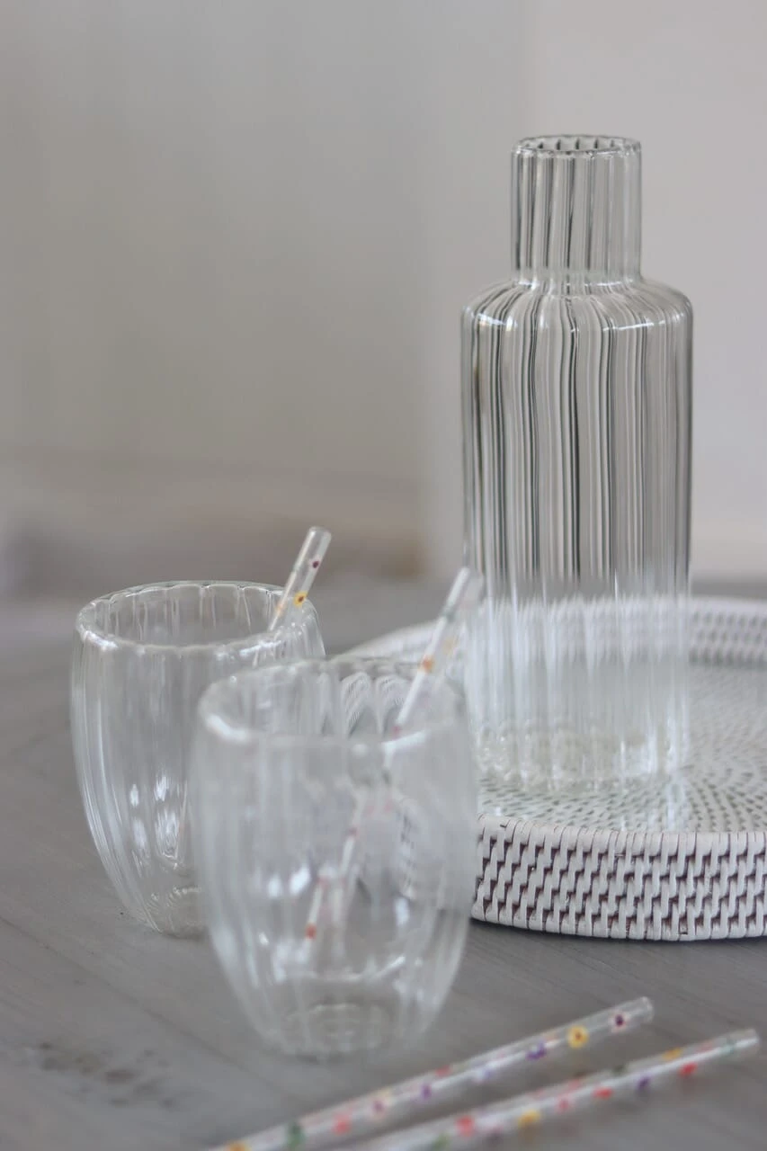 Enjoy long summer evenings in the garden with our glass carafe set, including 2 matching mugs. Our carafe and glass set features a beautiful rippled glass detailing, perfect for the bedside, evenings in the garden or around the dinner table.