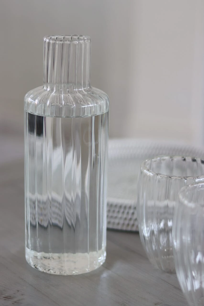 Enjoy long summer evenings in the garden with our glass carafe, featuring beautiful rippled glass detailing, perfect for the bedside, evenings in the garden or around the dinner table.