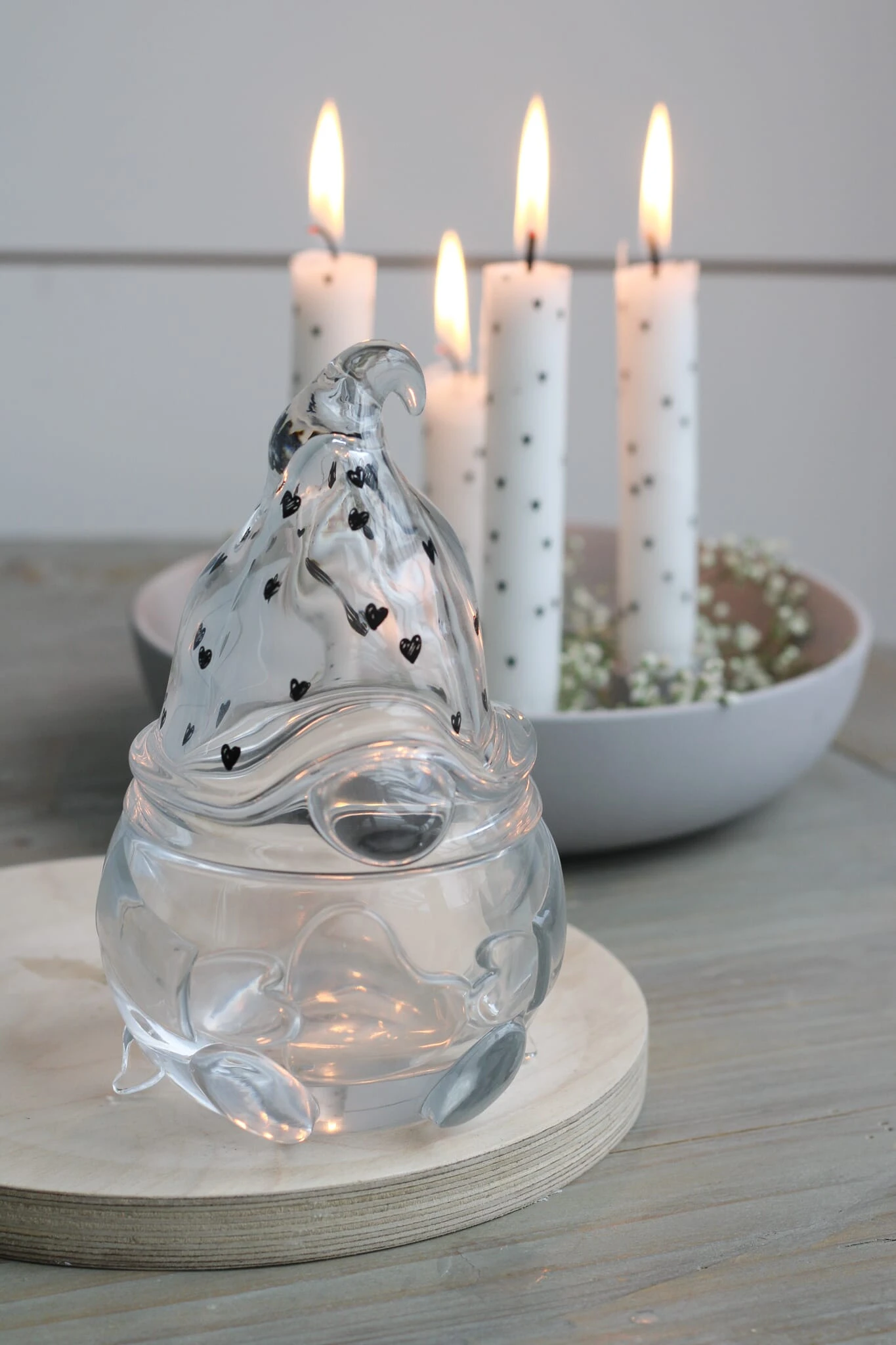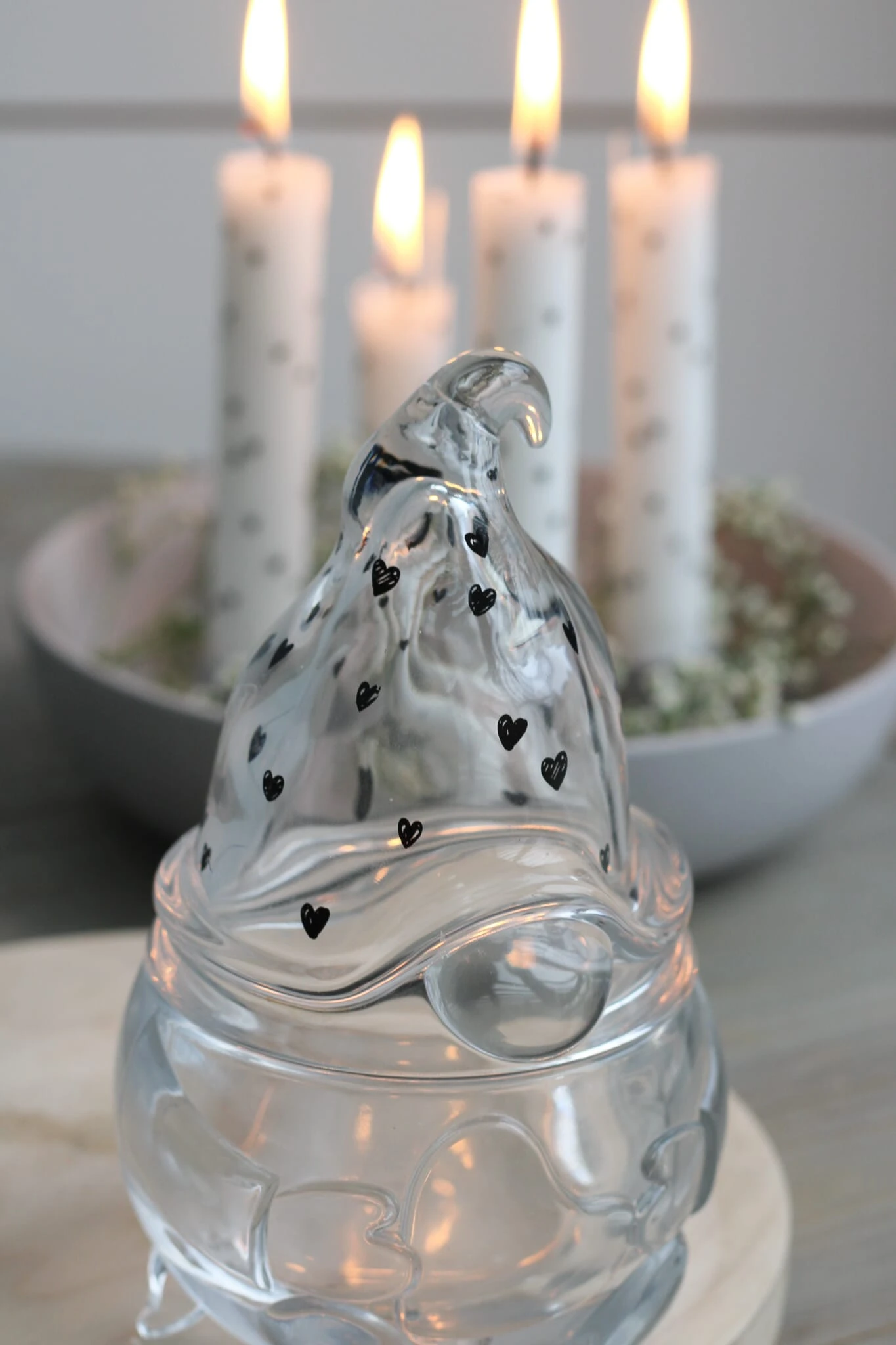 Introducing our cute glass gonks finished with small black hearts, this gonk is pretty as well as functional. Style with a wooden tray, a set of glass candle holders and your favourite Christmas inspired glass mug and enjoy the winter evenings.
