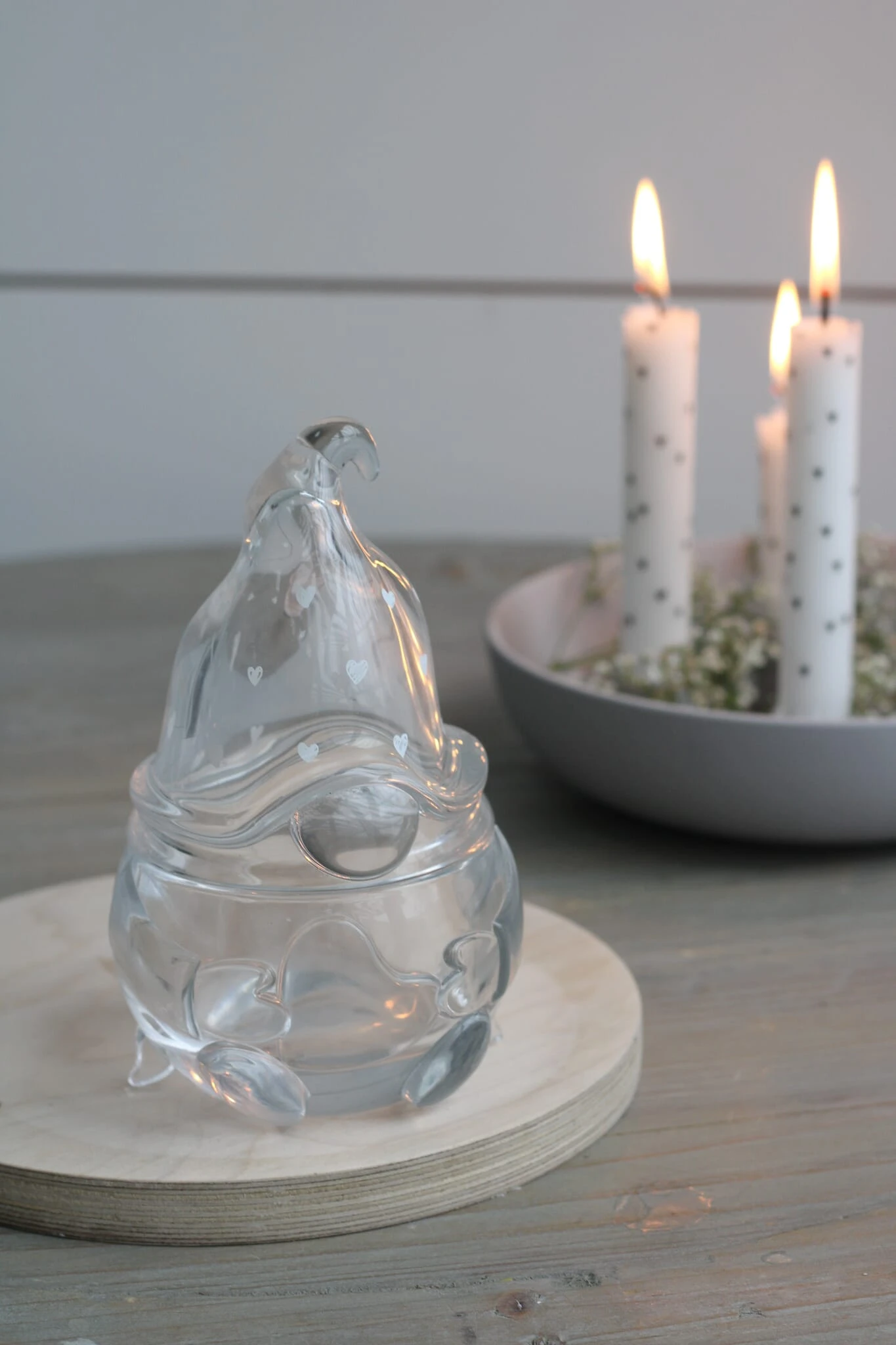 Introducing our cute glass gonks finished with delicate white hearts, this decorative gonk is pretty as well as functional. Style with a wooden tray, a set of glass candle holders and your favourite Christmas inspired glass mug and enjoy the winter evenings.