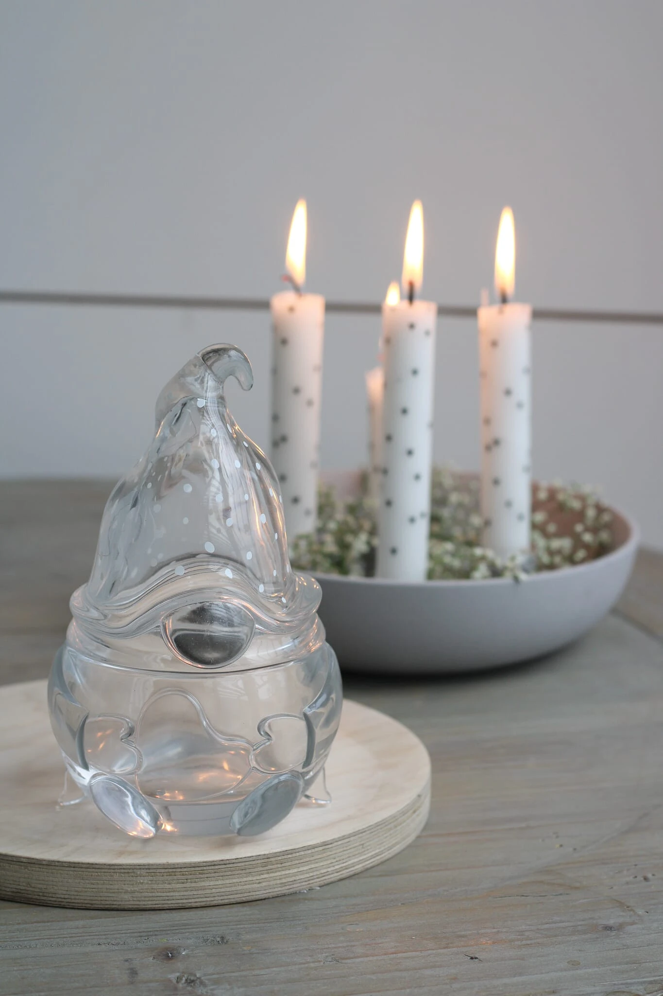 Introducing our cute glass gonks finished with white polka, this gonk is pretty as well as functional. Style with a tiered display stand, a set of glass candle holders and your favourite Christmas inspired coffee mug and enjoy the winter evenings.