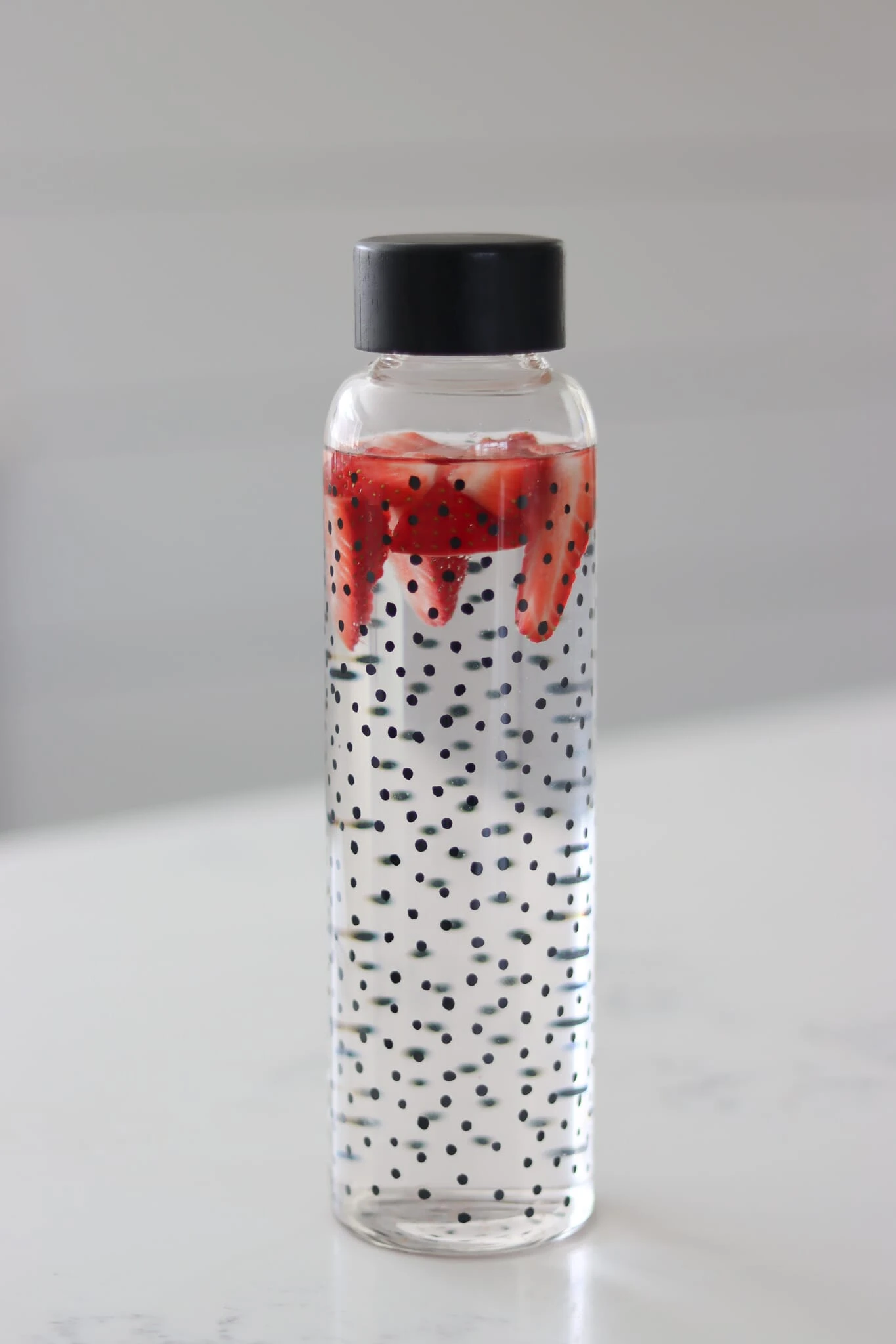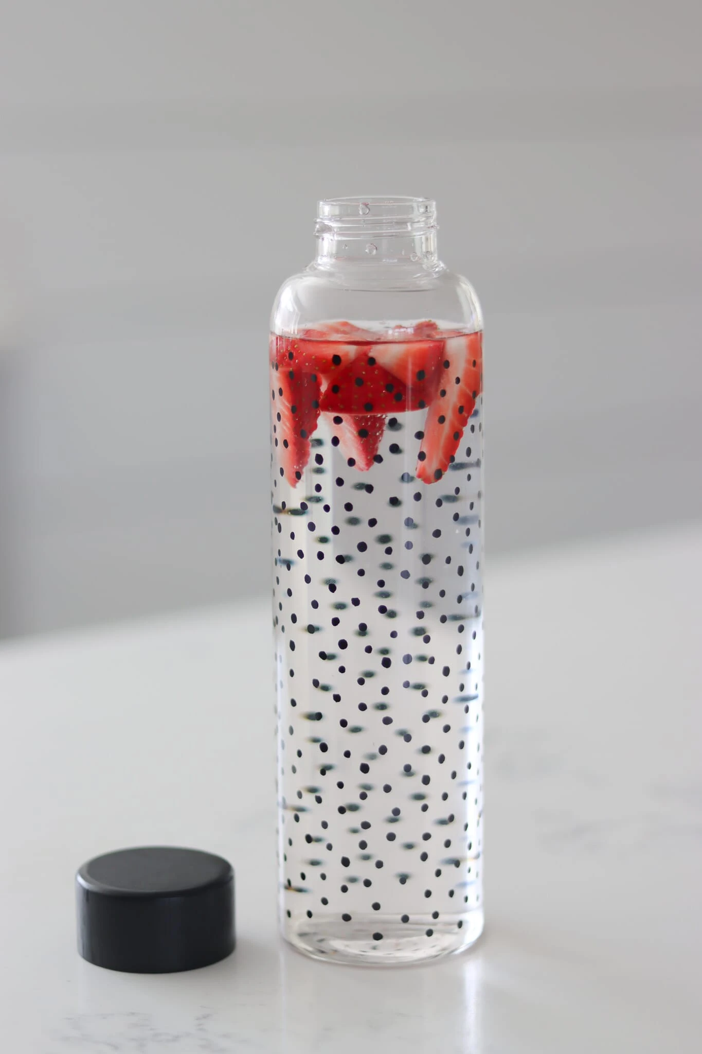 Glass water bottles, it’s time to replace your plastic bottles for cute reusable glass water bottle, decorated with polka dot artwork in black finished with a matching with bamboo lid.