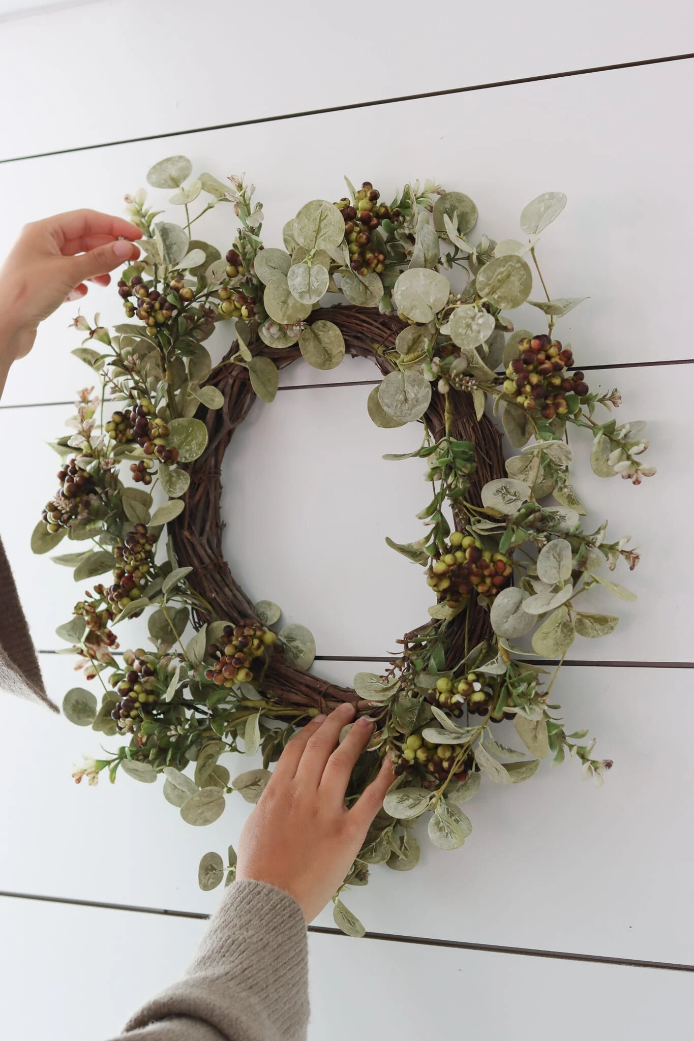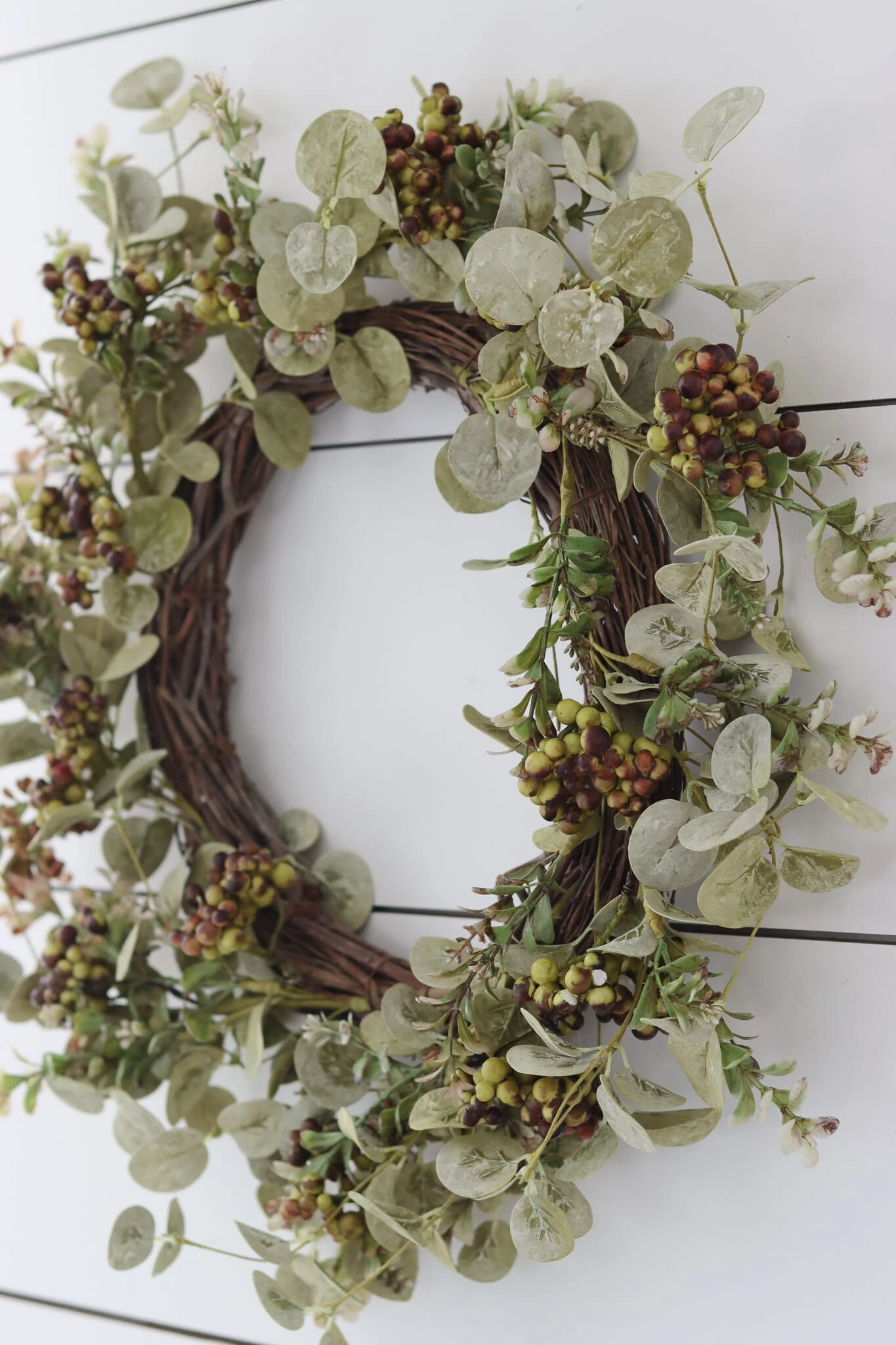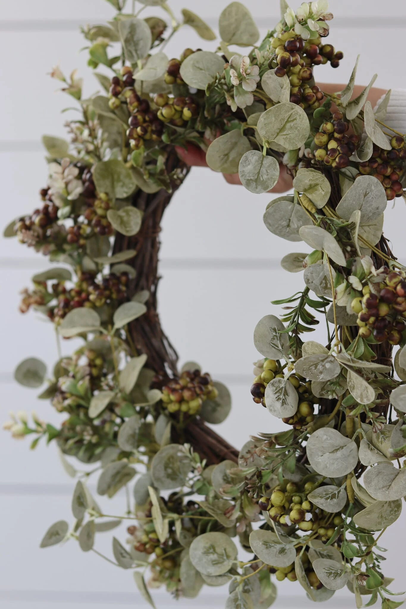 Create a serene and inviting atmosphere with this autumn wreath designed finished with green eucalyptus and berries.