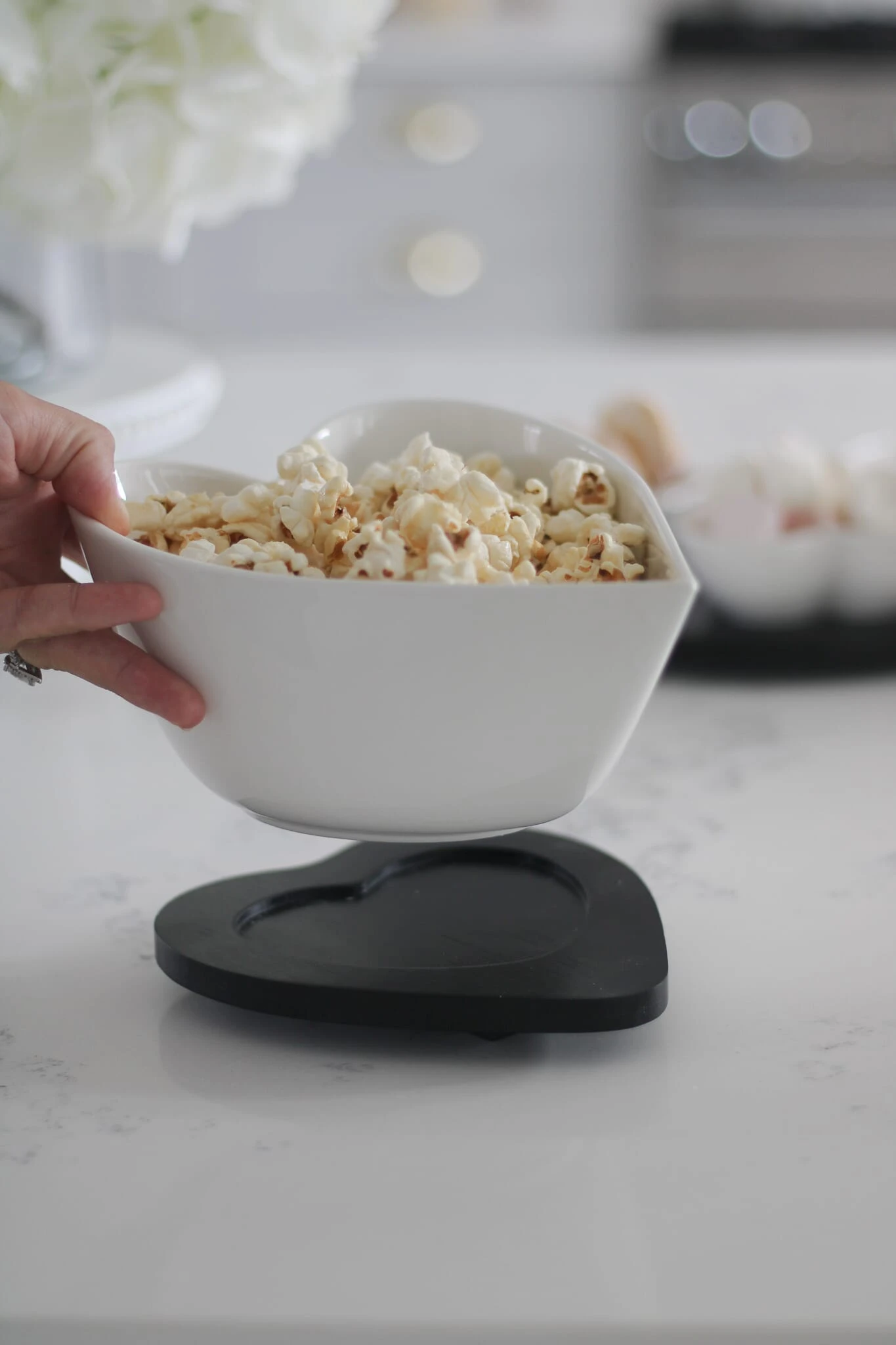 This large heart bowl sits onto of a bamboo heart shaped raised wood base, perfect as a serving dish, snacking station or a salad dressing bowl.