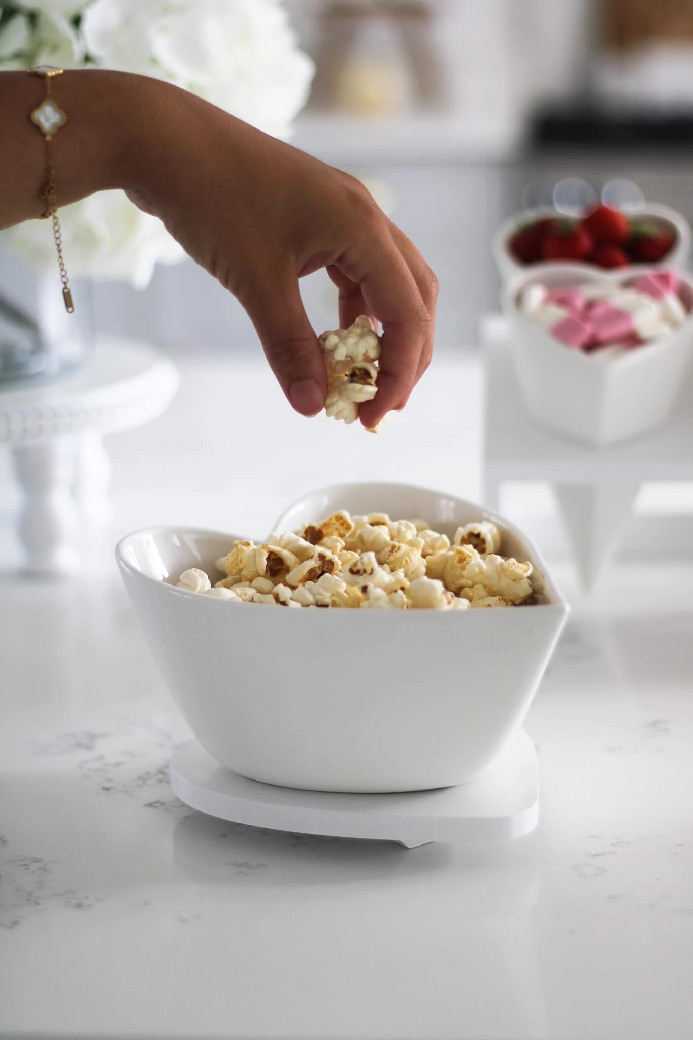 This large heart bowl sits onto of a bamboo heart shaped raised wood base, perfect as a serving dish, snacking station or a salad dressing bowl.