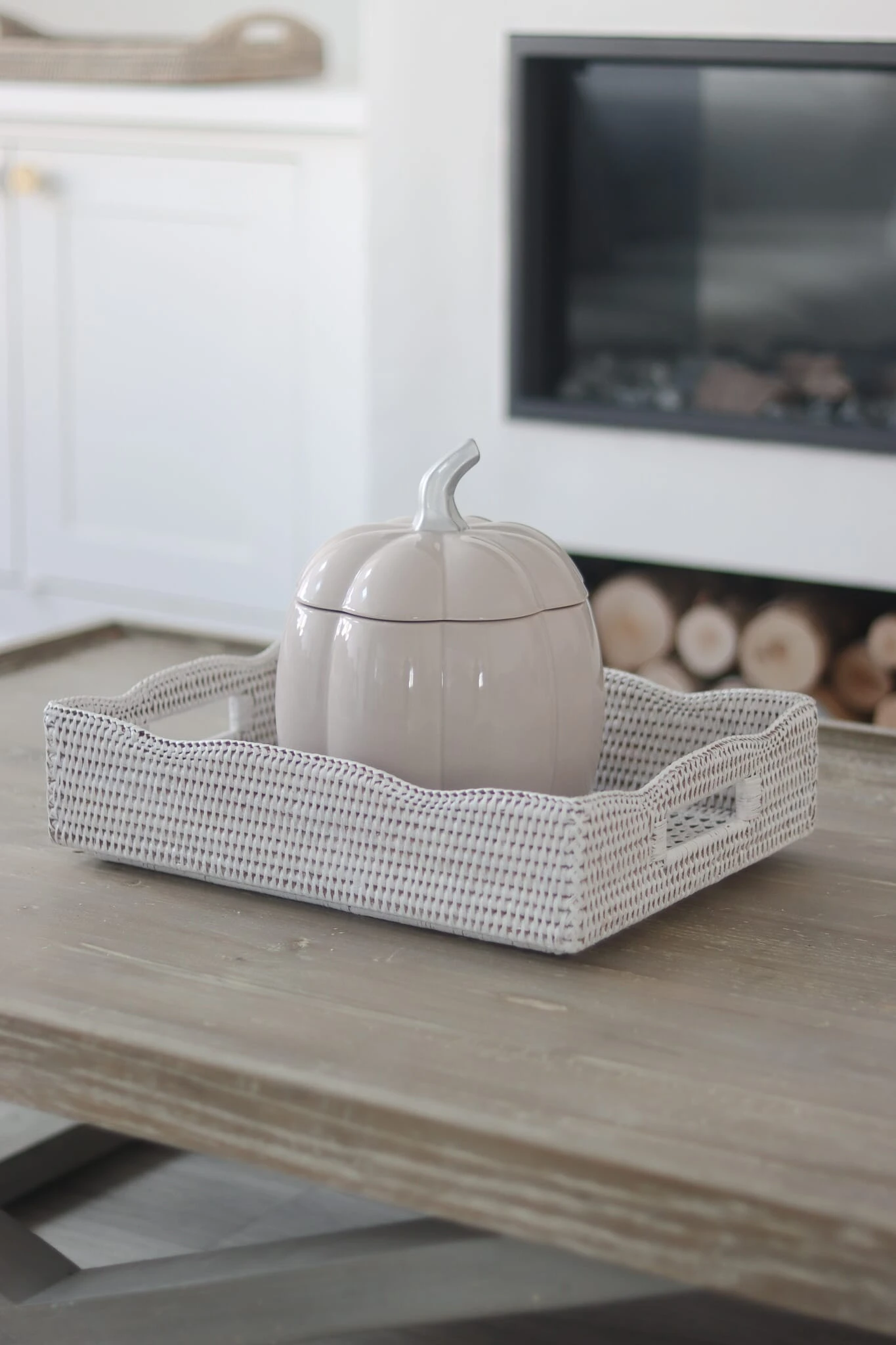 Introducing our scalloped tray crafted in rattan finished in white. These rattan trays stand out due to its distinctive finish, featuring a unique scalloped pattern around the edges. Rattan offers a timeless charm while the intricate lace detailing adds a touch of sophistication.