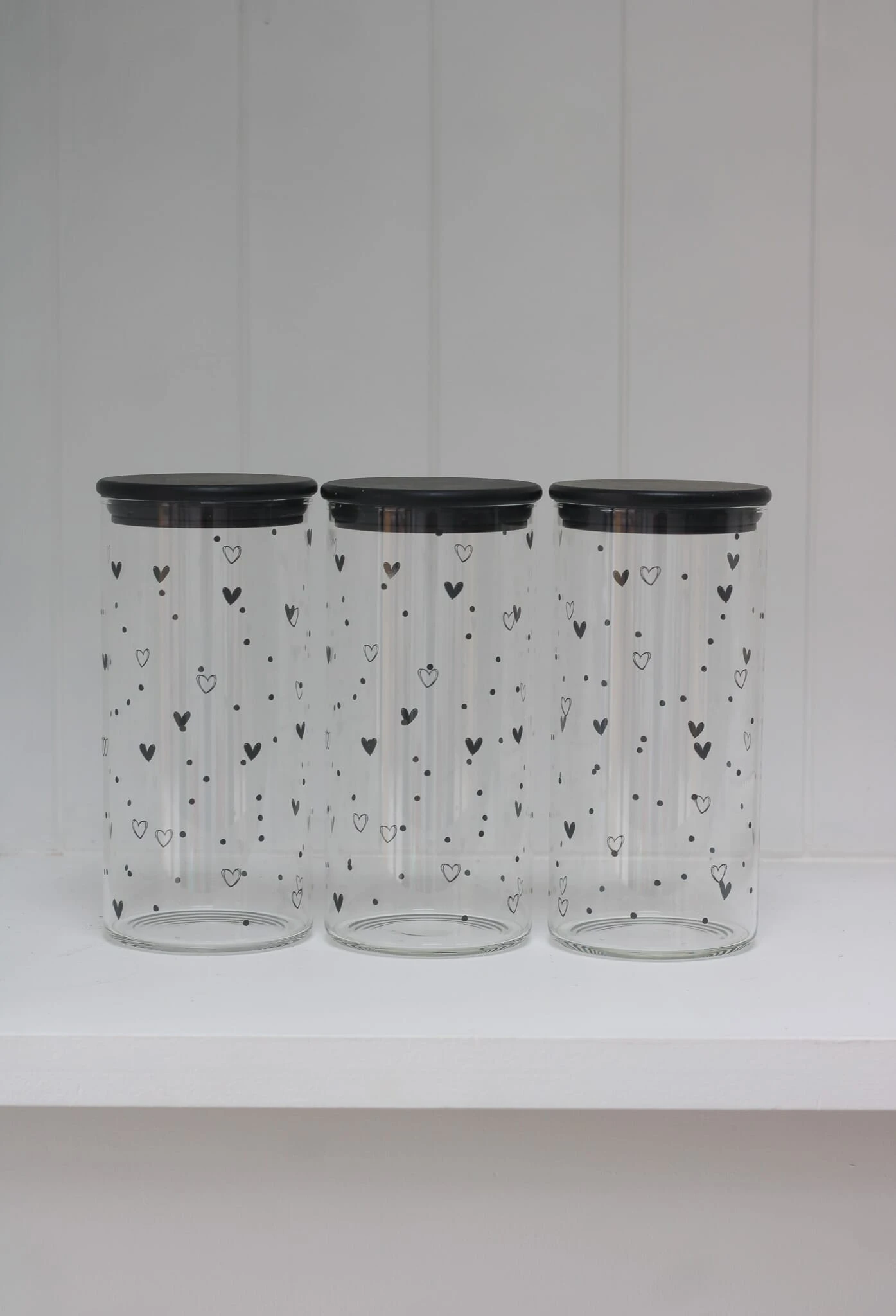 These jars are made from borosilicate glass finished with a black multi heart artwork with a matching bamboo lid.