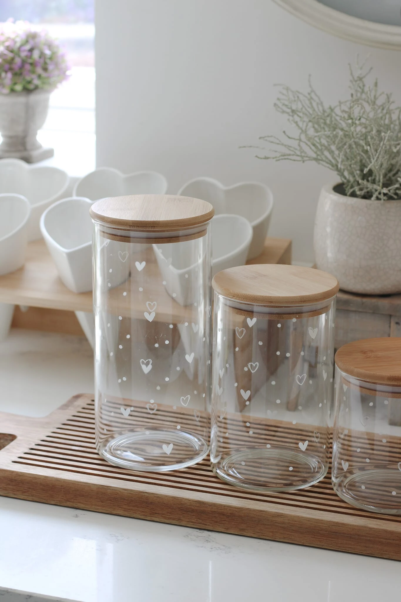 Introducing our cute bamboo glass storage jars with a delightful multi heart artwork finished in white with matching lids.