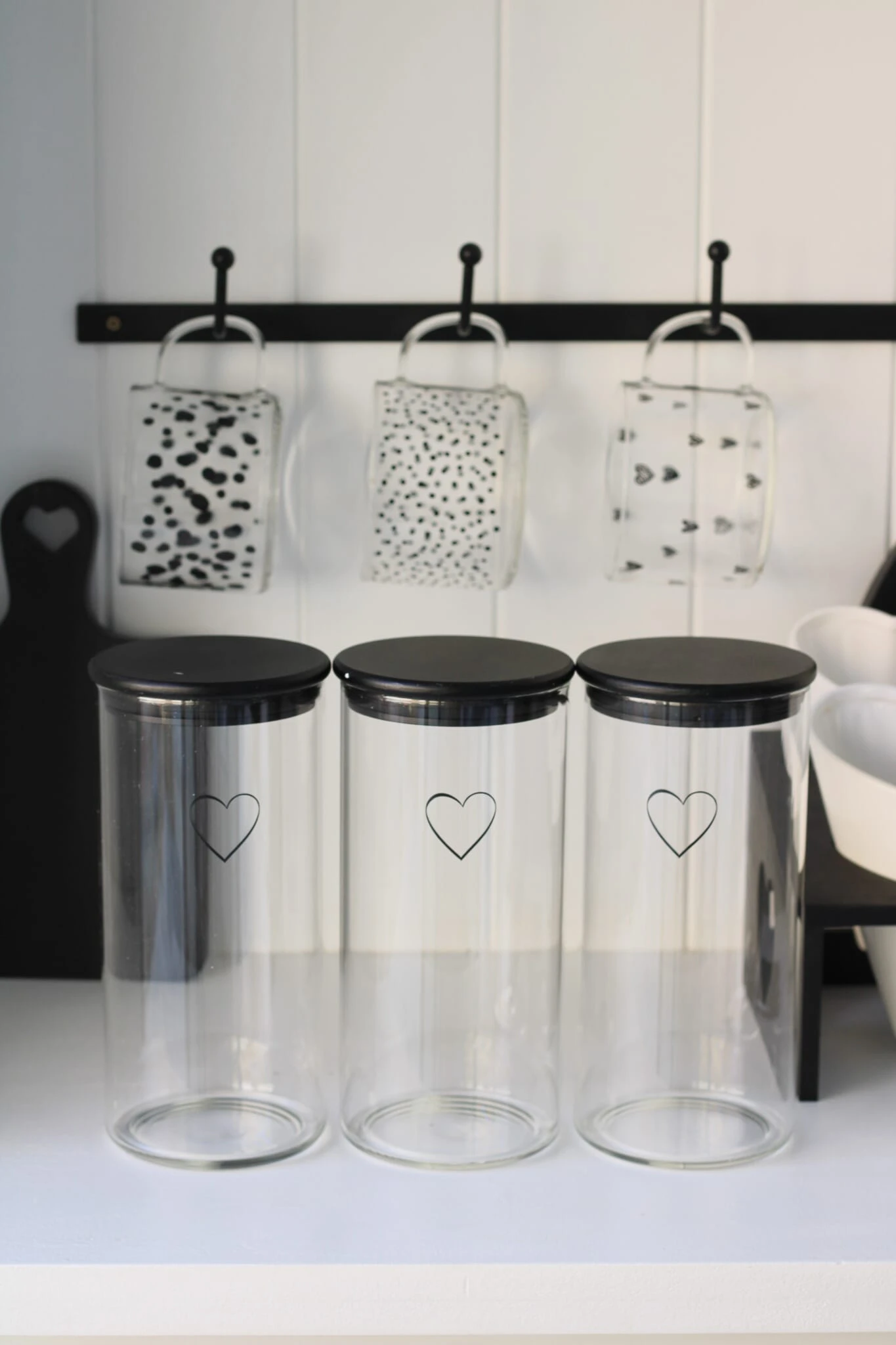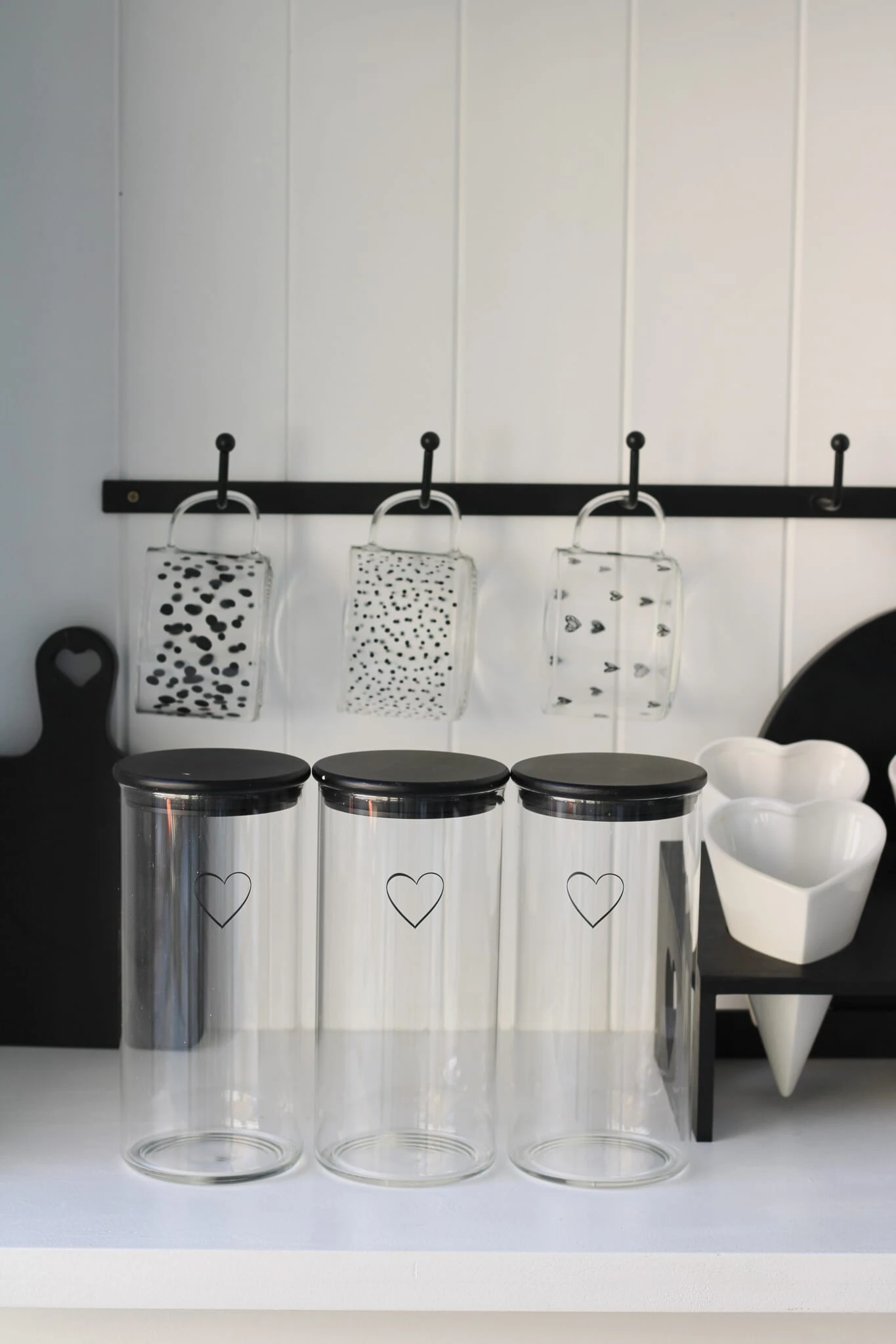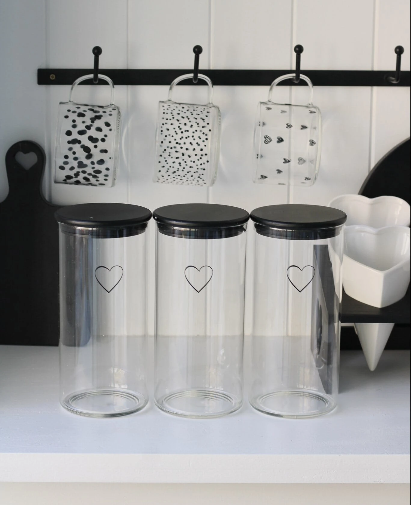 These jars are made from borosilicate glass finished with a single heart artwork with matching bamboo lid.