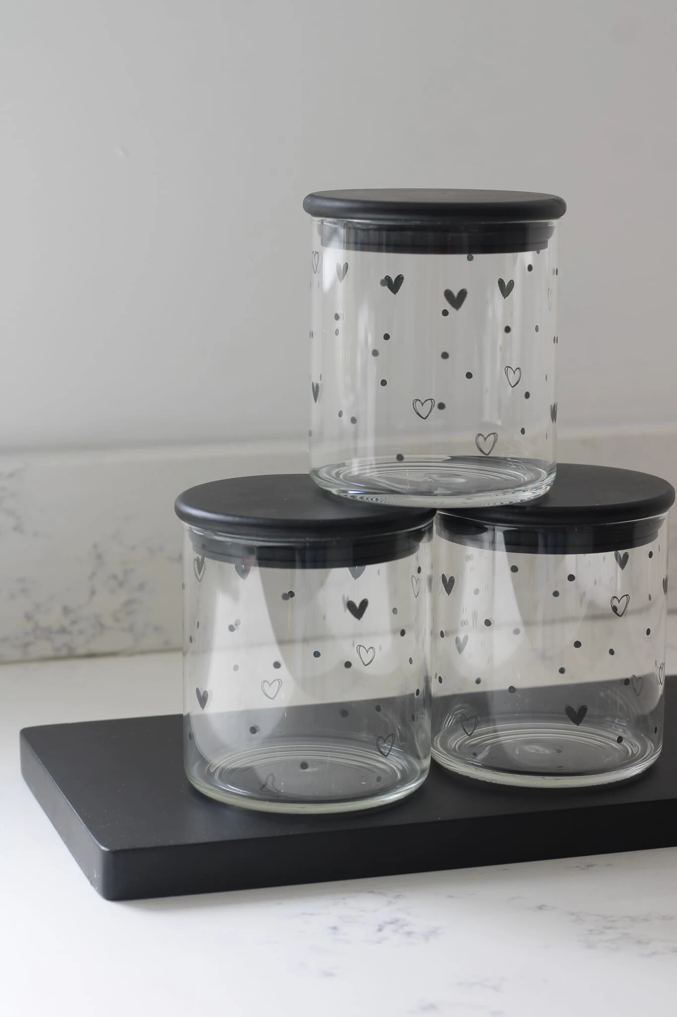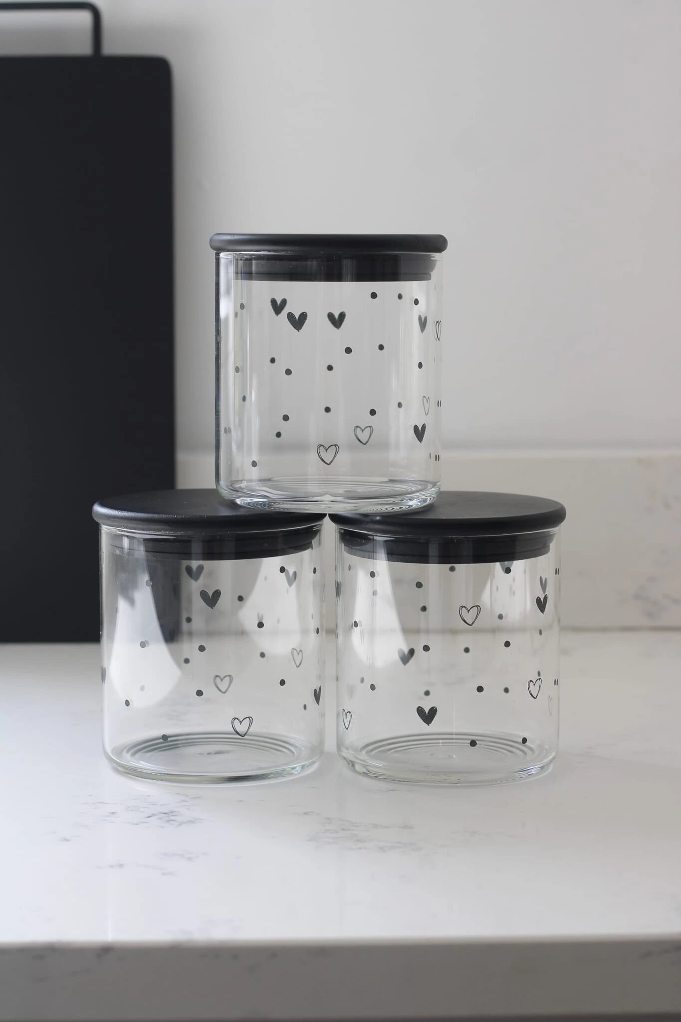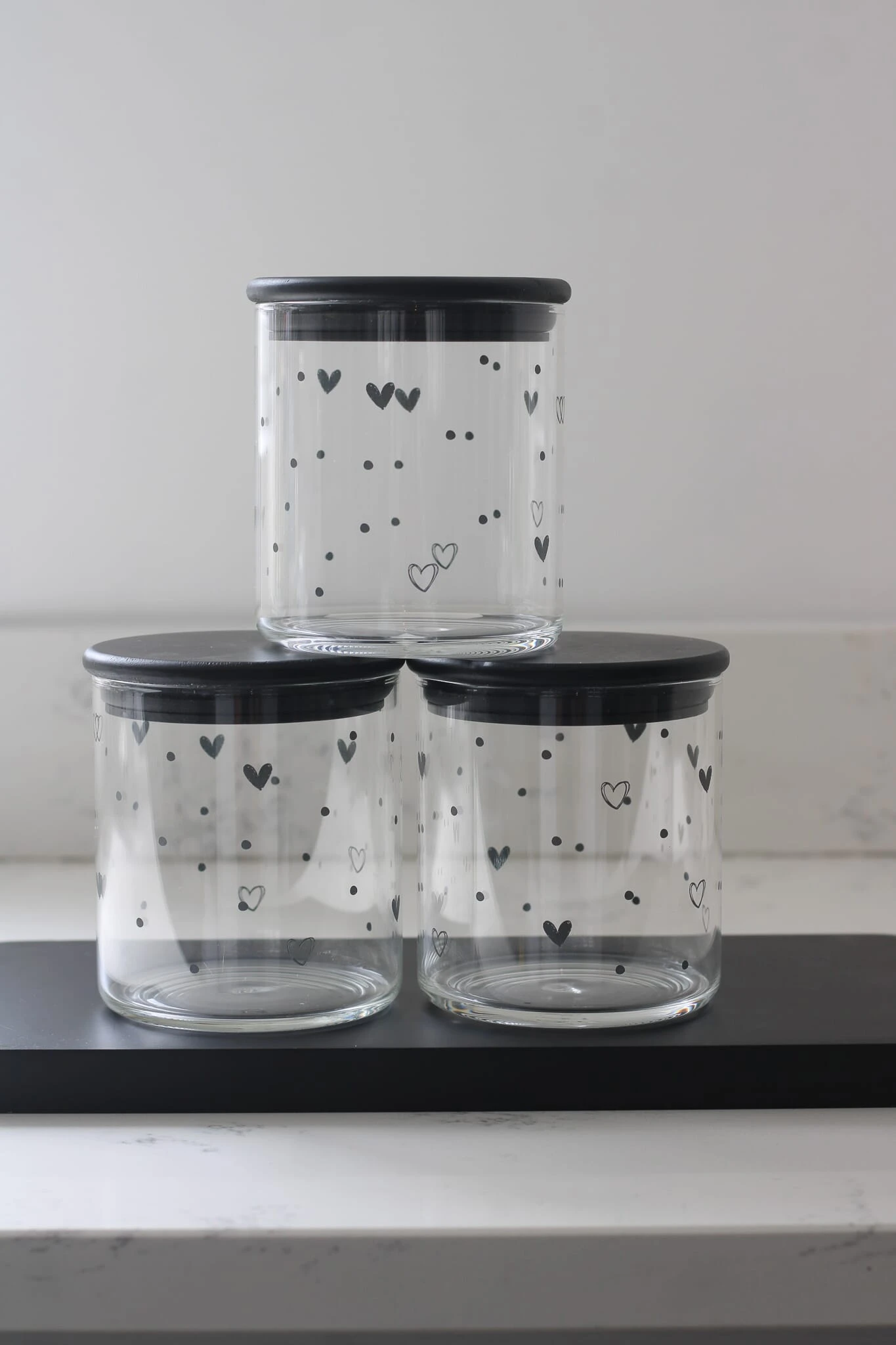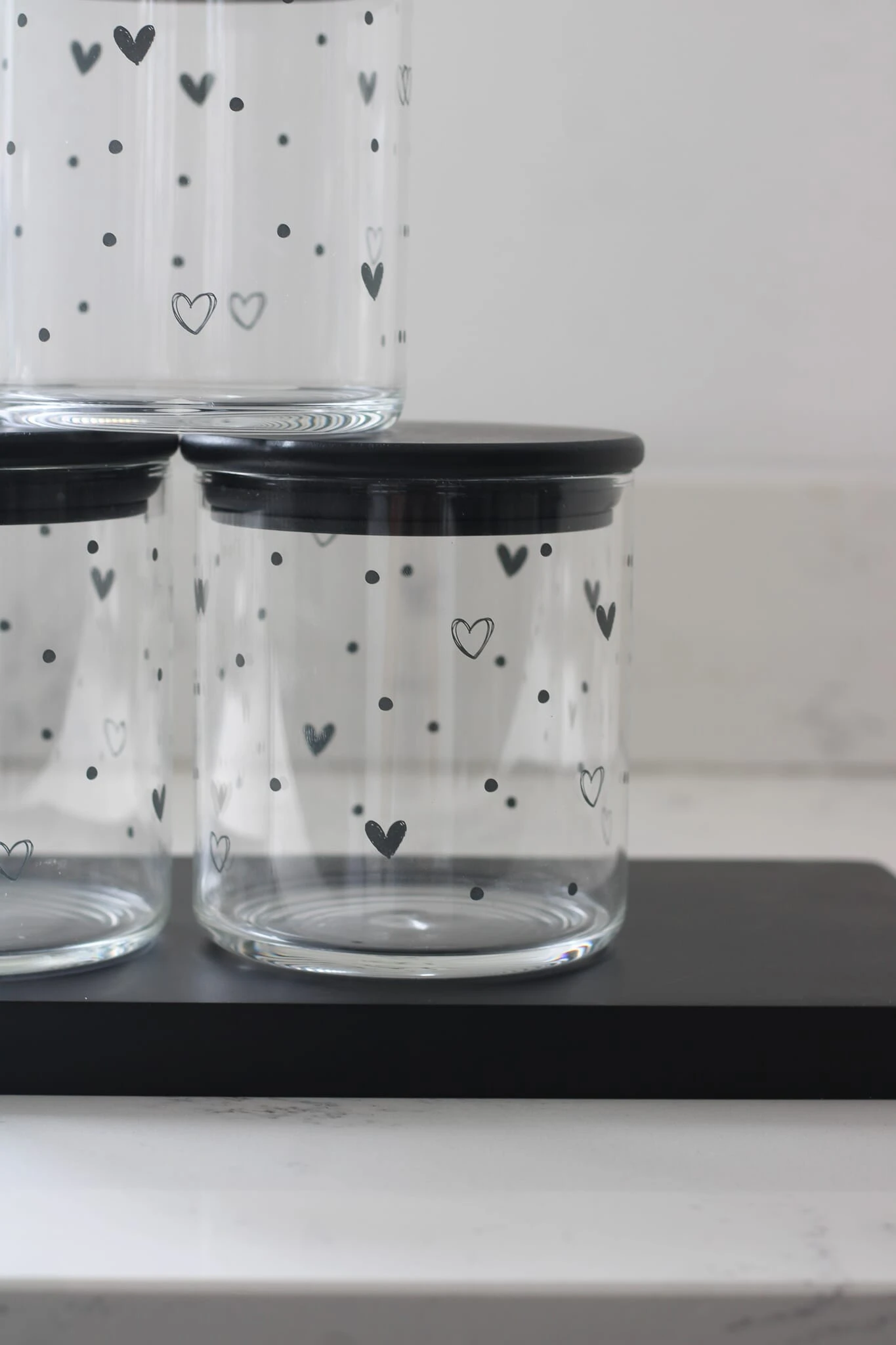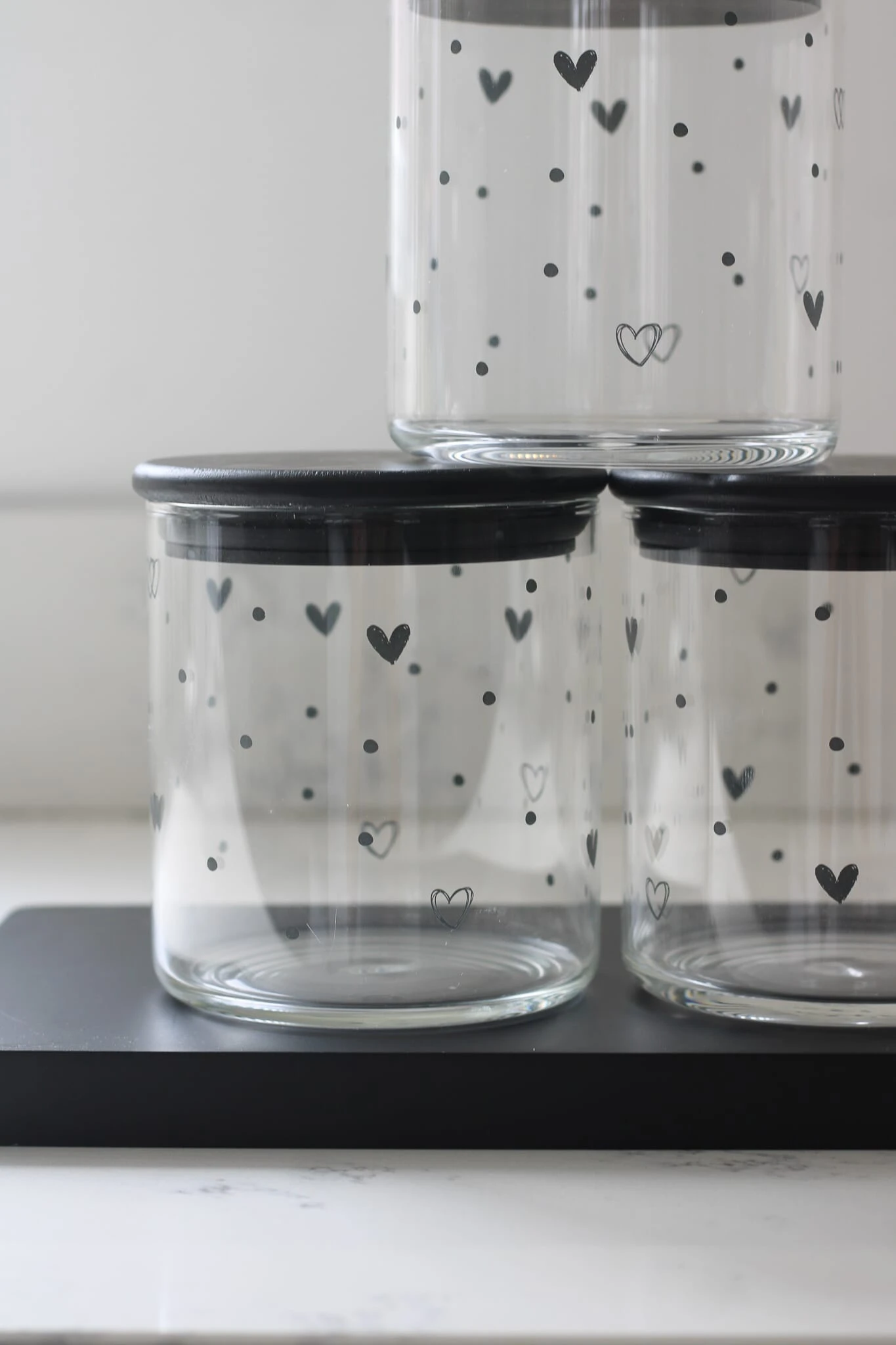 Introducing our cute bamboo glass storage jars with a delightful white multi heart and dots artwork finished in black.