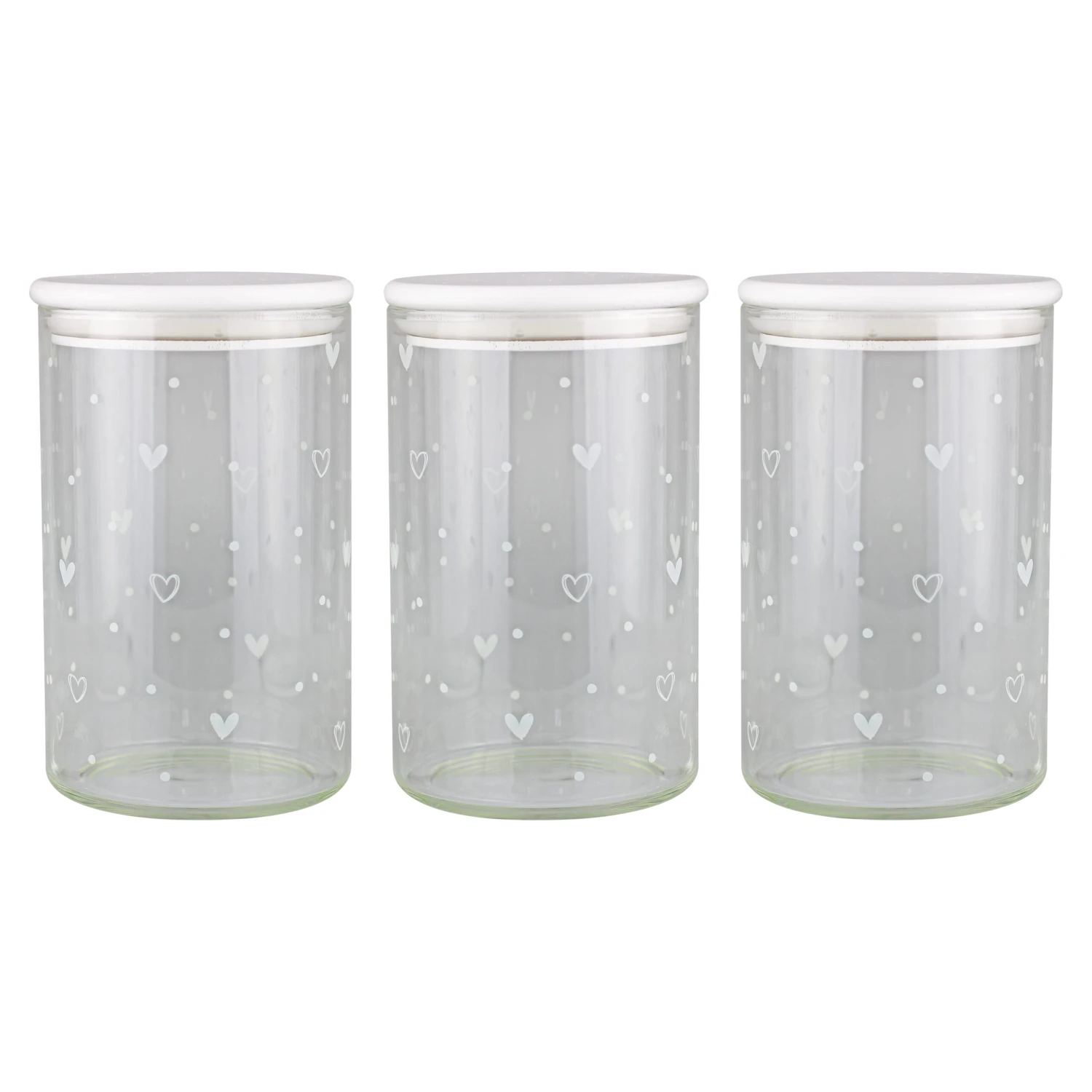 Introducing our cute bamboo glass storage jars with a delightful multi heart & dots artwork finished in white with matching lids.