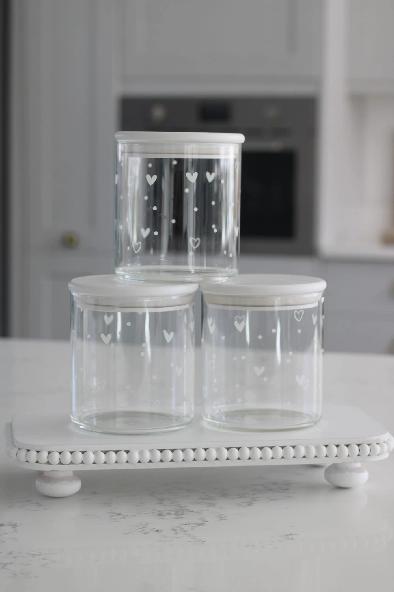Introducing our cute 600 ml bamboo glass storage jar with a delightful white multi heart and dots artwork.
