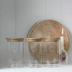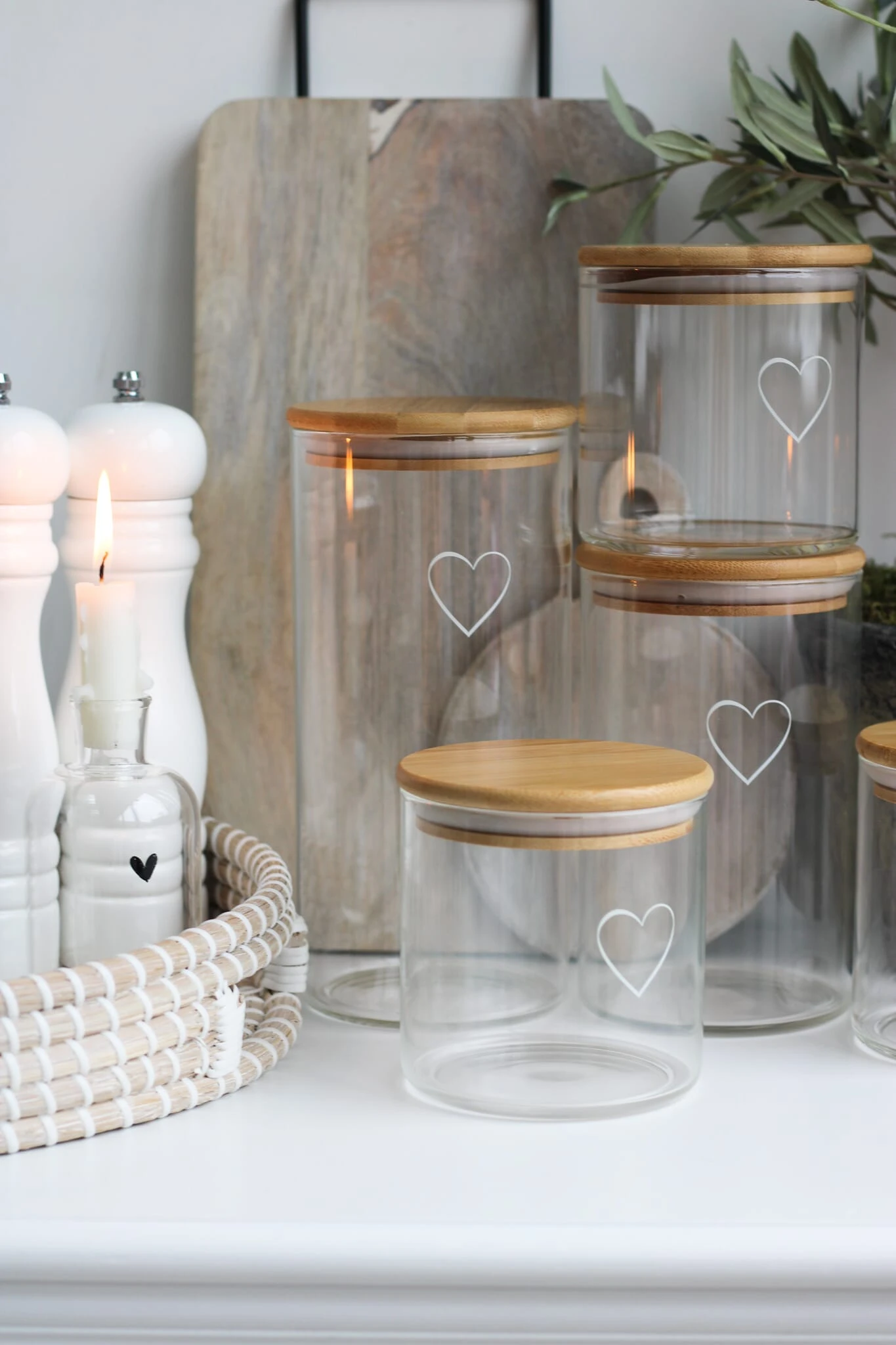 Introducing our cute bamboo glass storage jars with a delightful single heart artwork finished in white with natural lids.