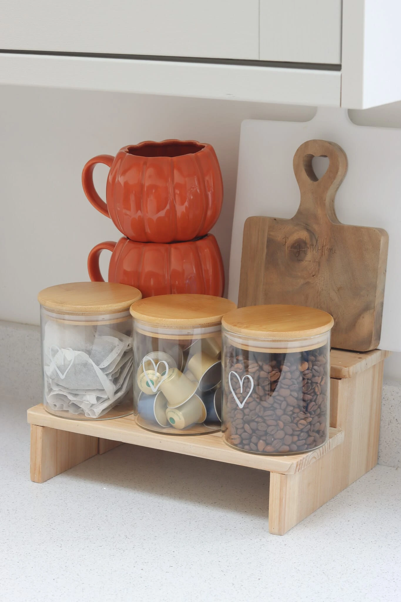 Introducing our cute bamboo glass storage jars with a delightful single heart artwork finished in white with matching lids.