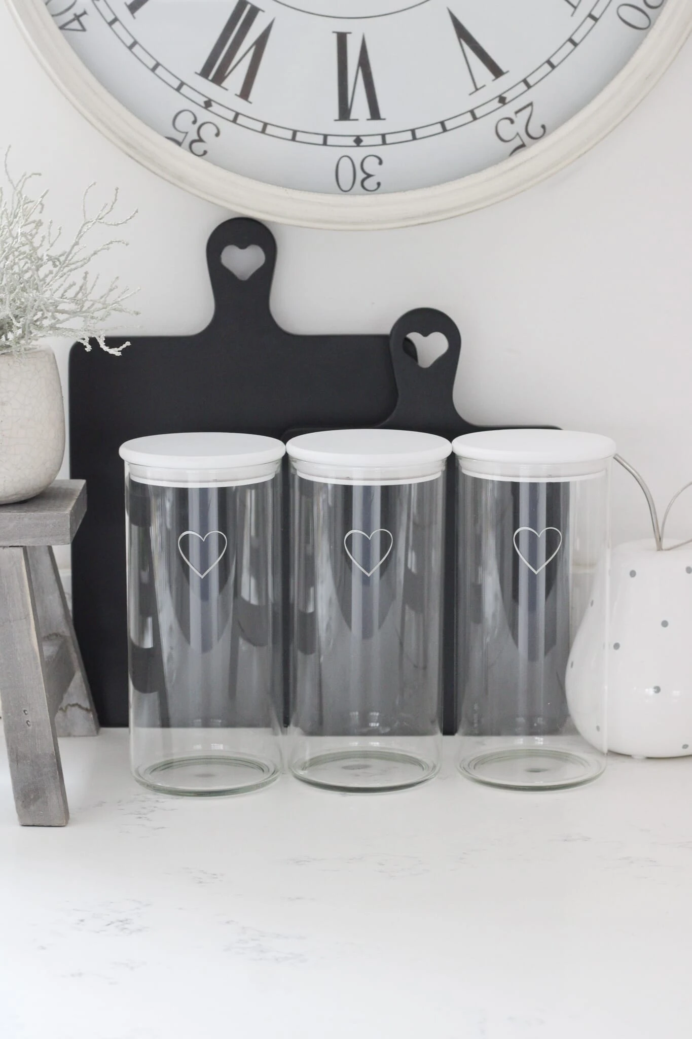 These jars are made from borosilicate glass finished with a white single heart artwork with a matching bamboo lid.