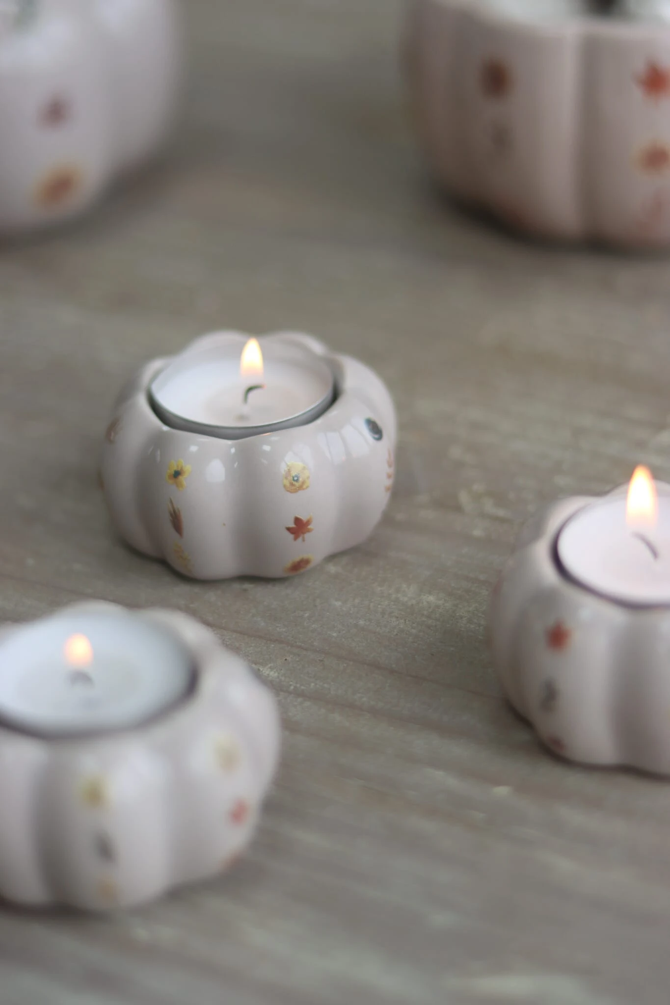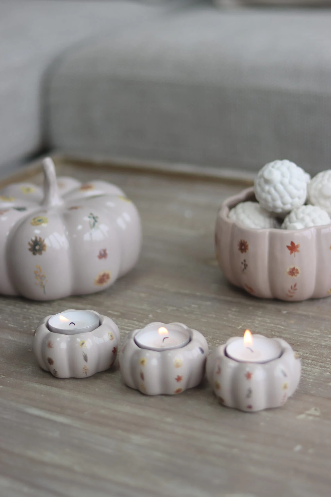 Introducing our Set of 3 pumpkin tea light ceramic candle holders finished in autumn tone with a cute floral pattern attached.