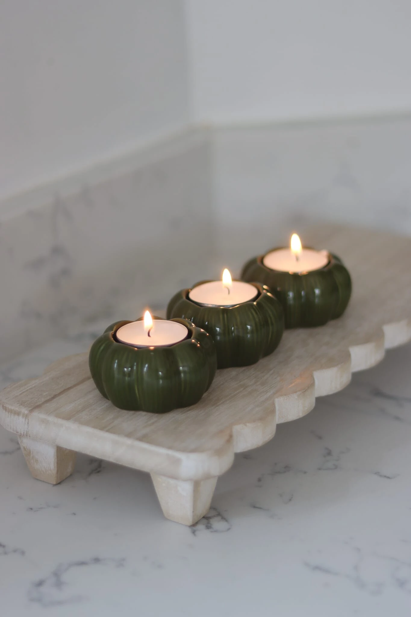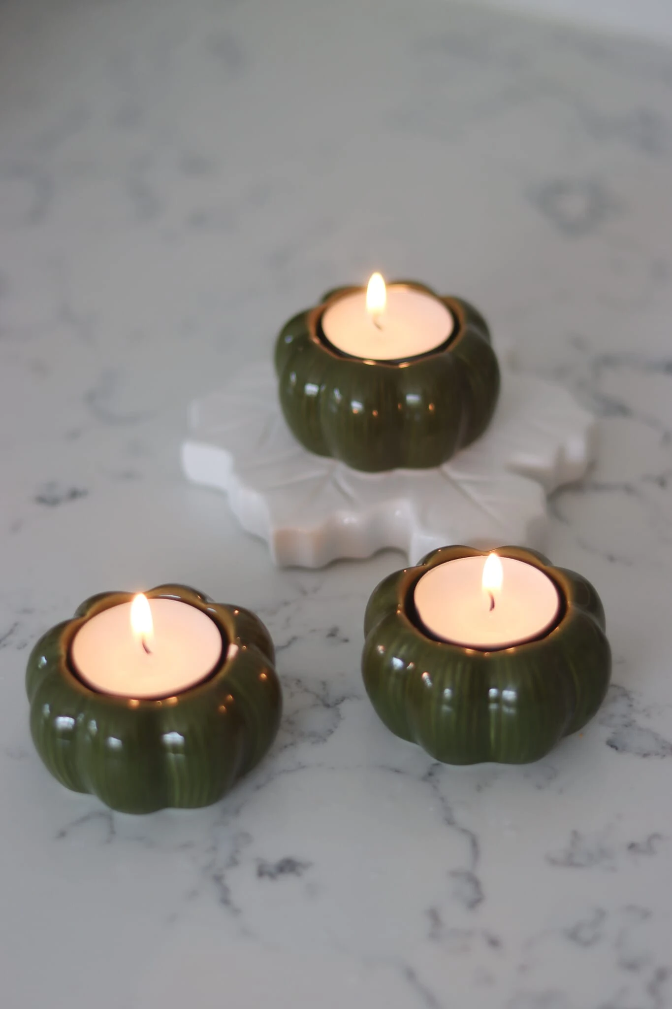 Introducing our Set of 3 pumpkin tea light ceramic candle holders finished in a autumn dark green tone.