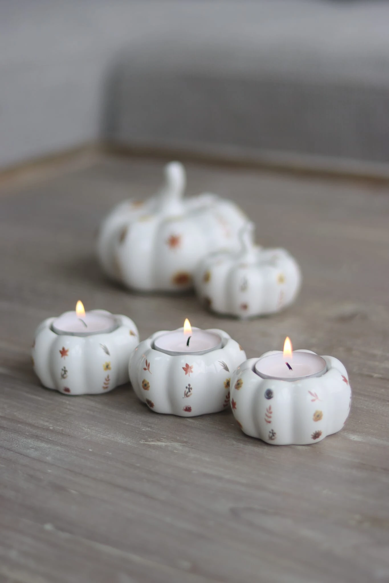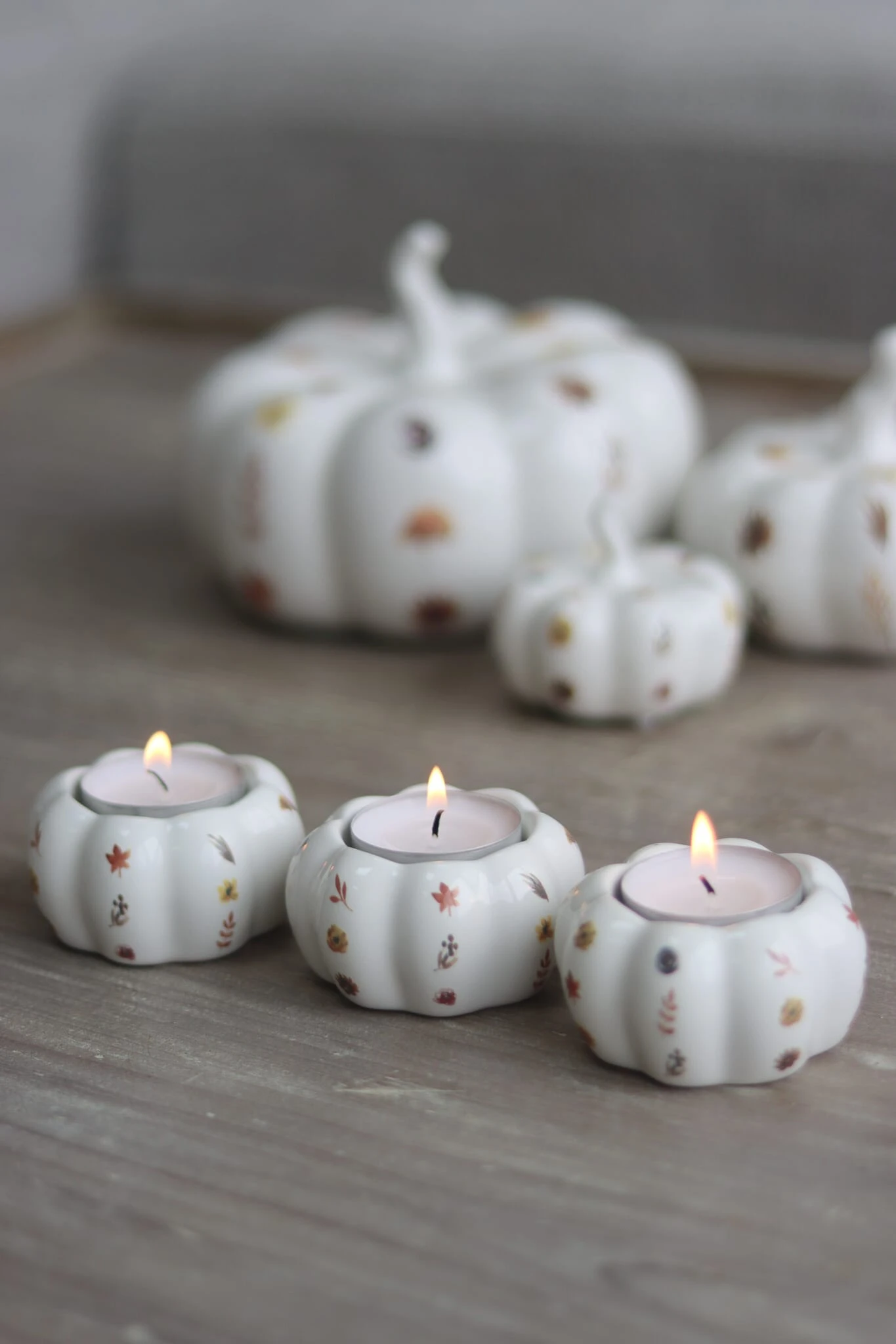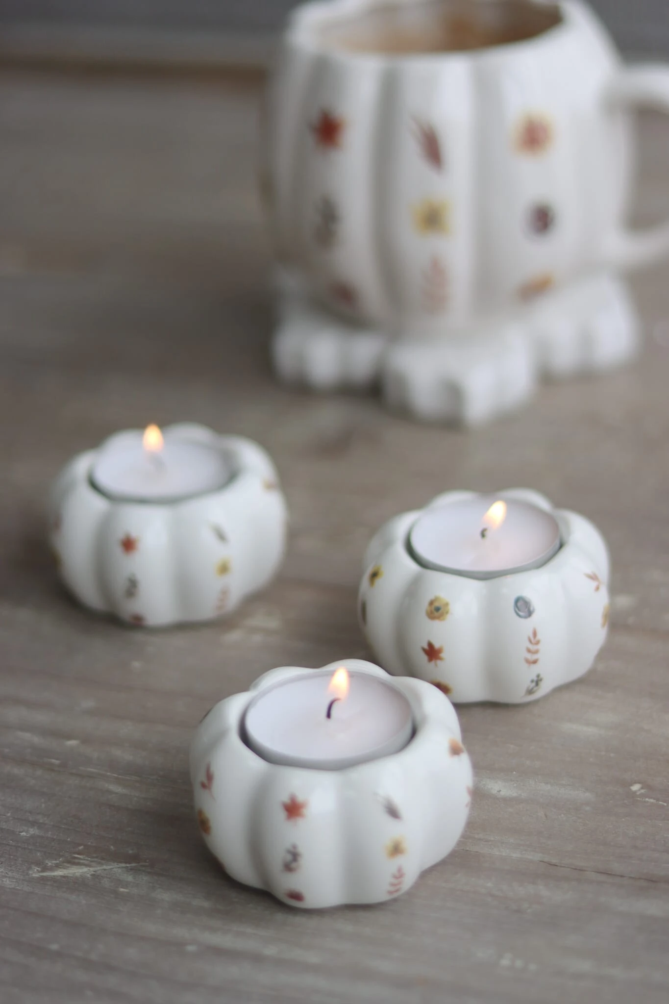 Introducing our Set of 3 pumpkin tea light ceramic candle holders finished in bright white with a cute floral pattern attached.