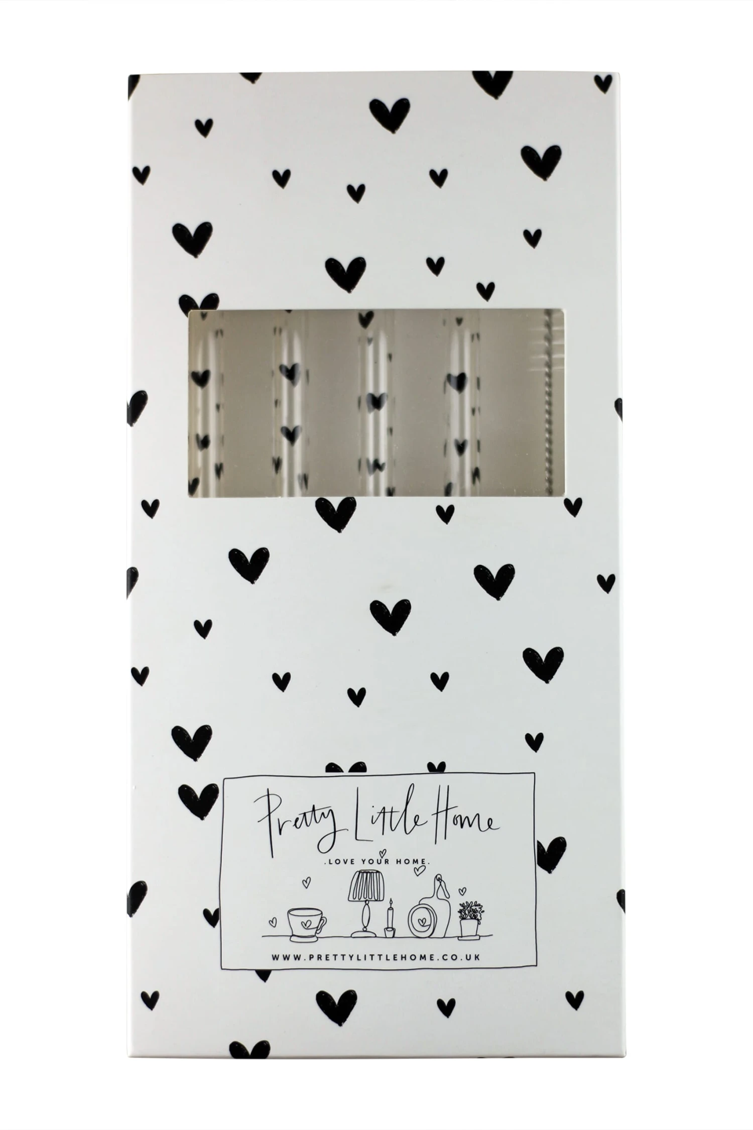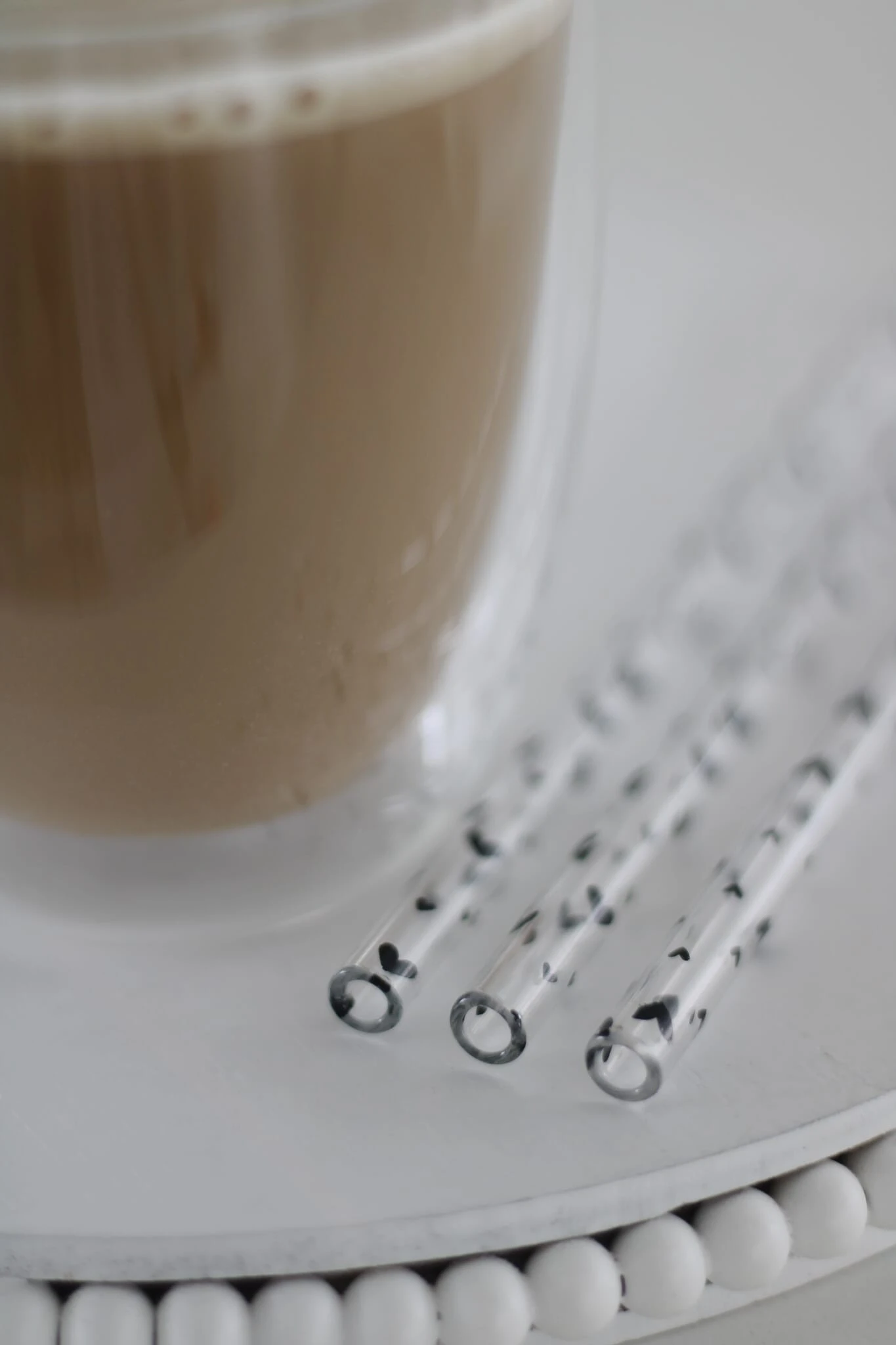 Glass straws sold as a 4 pc set, as plastic straws are pushed out and paper straws are just not appealing to anyone why not try our reusable straws, made from glass with a lovely black multi artwork on to use at home or take out and enjoy your drinks without having to fight with a paper straw not fit for purpose.