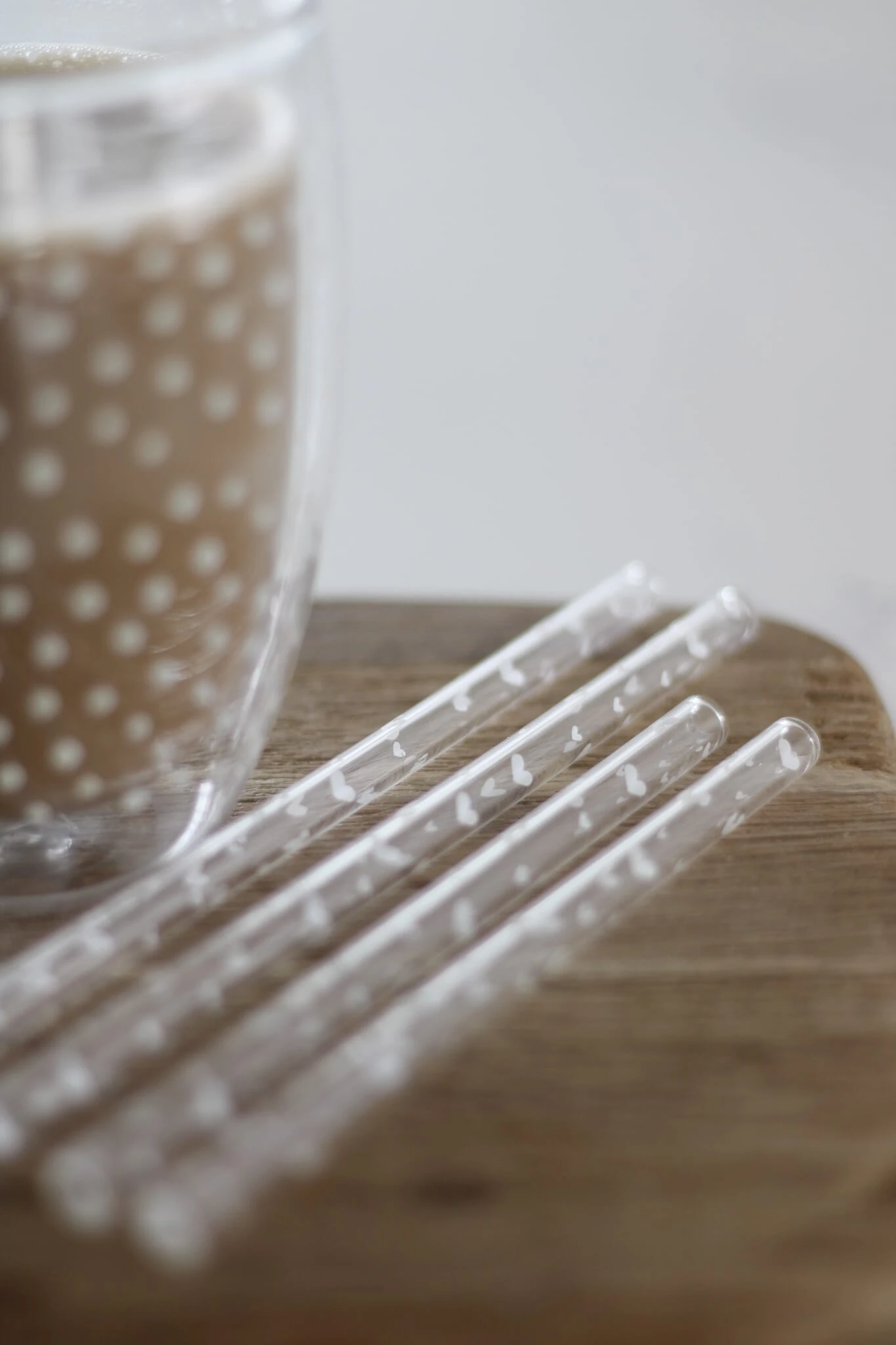 Glass straws sold as a 4 pc set, as plastic straws are pushed out and paper straws are just not appealing to anyone why not try our reusable straws, made from glass with a lovely white multi artwork on to use at home or take out and enjoy your drinks without having to fight with a paper straw not fit for purpose.