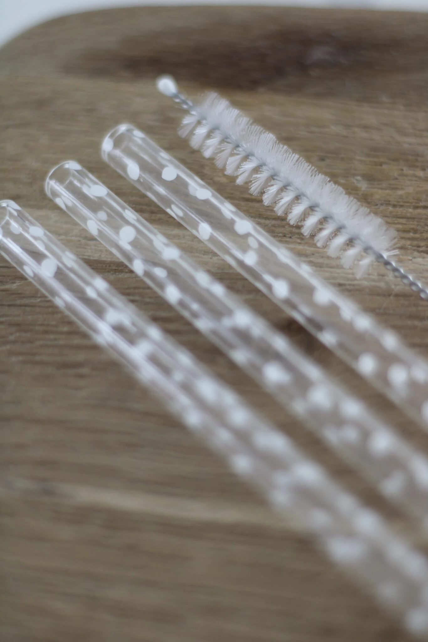 Glass straws sold as a 4 pc set, as plastic straws are pushed out and paper straws are just not appealing to anyone why not try our reusable straws, made from glass with a lovely white polka artwork on to use at home or take out and enjoy your drinks without having to fight with a paper straw not fit for purpose.