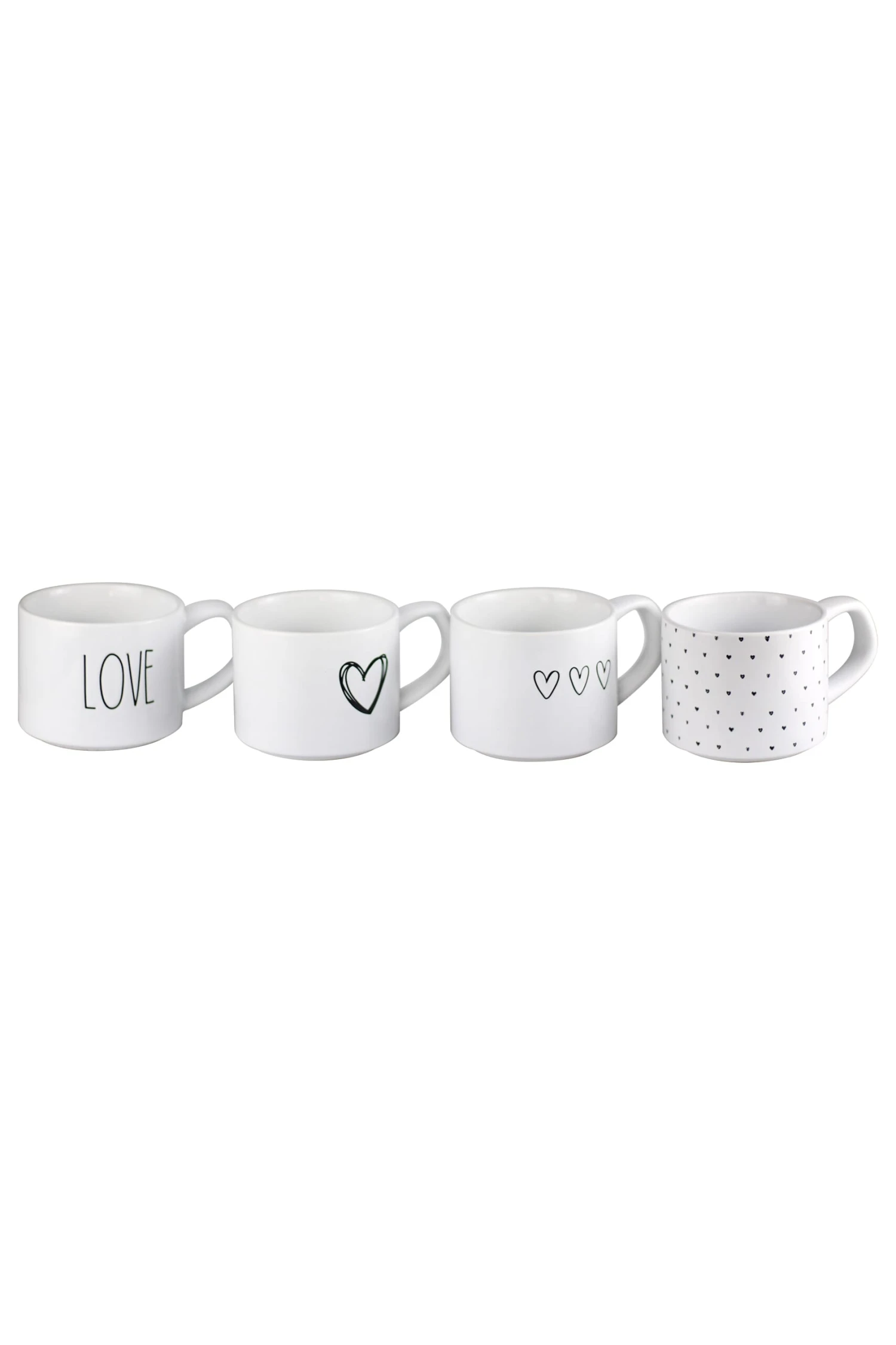 A set of 4 stoneware mugs, with 4 different designs on. Perfect to stack and store on your kitchen worktops for easy reach when making your cuppa.